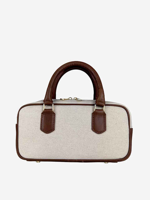 Mała torebka typu kuferek wykonana z tkaniny i skóry licowej. Zapinanie na zamek. Dodatkowy, odczepiany pasek do noszenia na ramieniu.