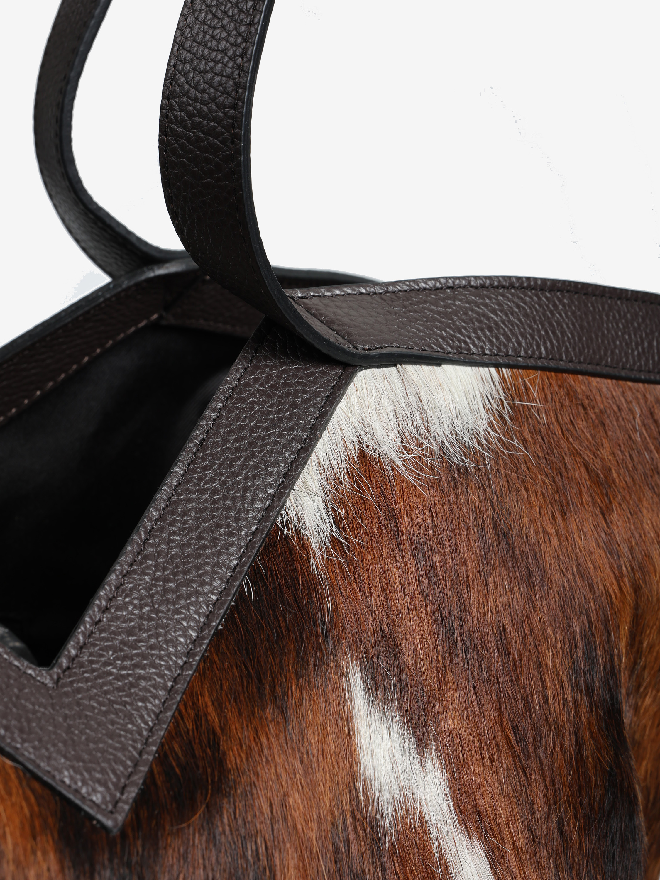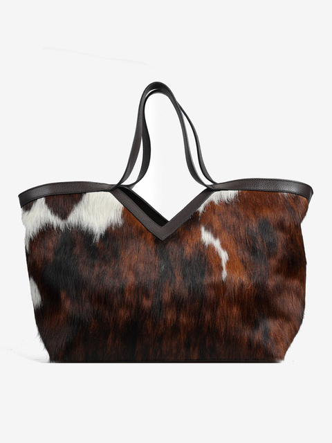 Elegancki shopper z wycięciem w kształcie litery V i zapięciem na haczyk. W środku materiałowa wyściółka i przegródka zapinana na suwak.