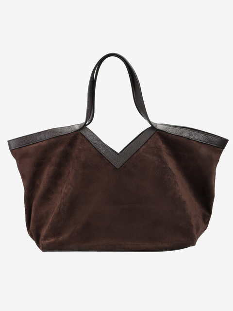Elegancki shopper z wycięciem w kształcie litery V i zapięciem na haczyk. W środku materiałowa wyściółka i przegródka zapinana na suwak.