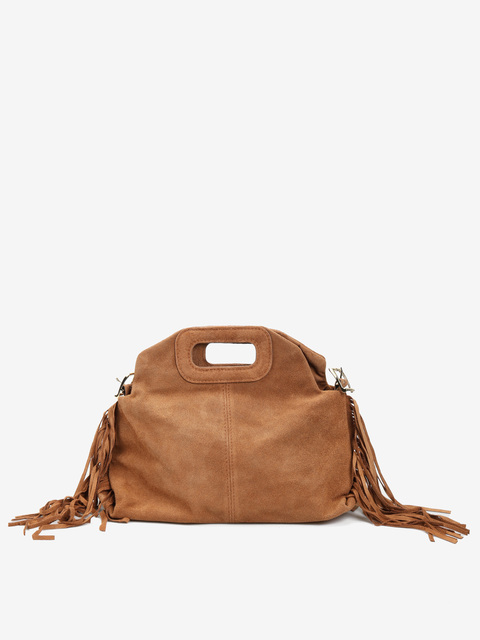 Zamszowa torebka do ręki z zapięciem na suwak i ozdobnymi frędzlami. Dodatkowy pasek do noszenia na ramię.