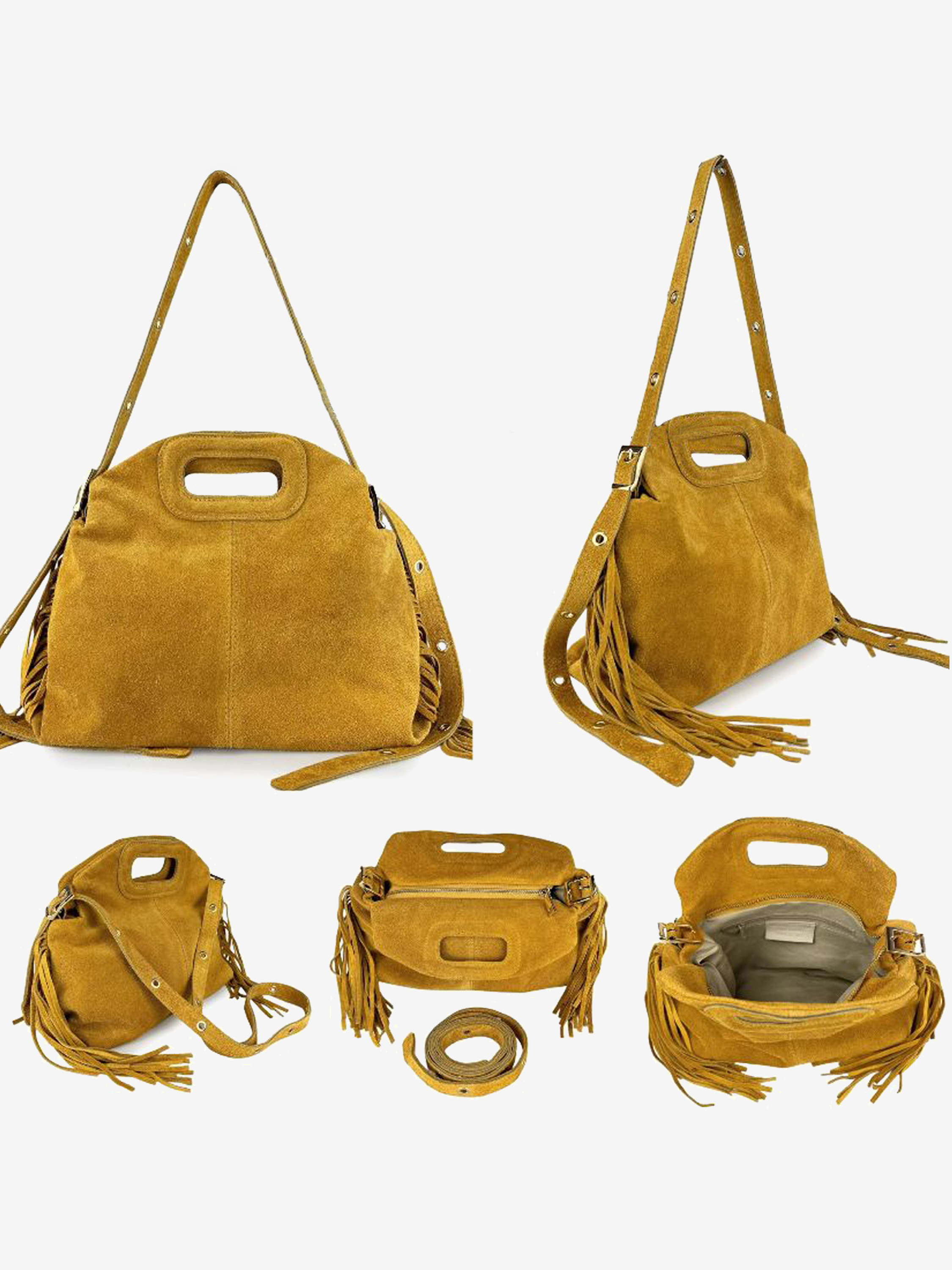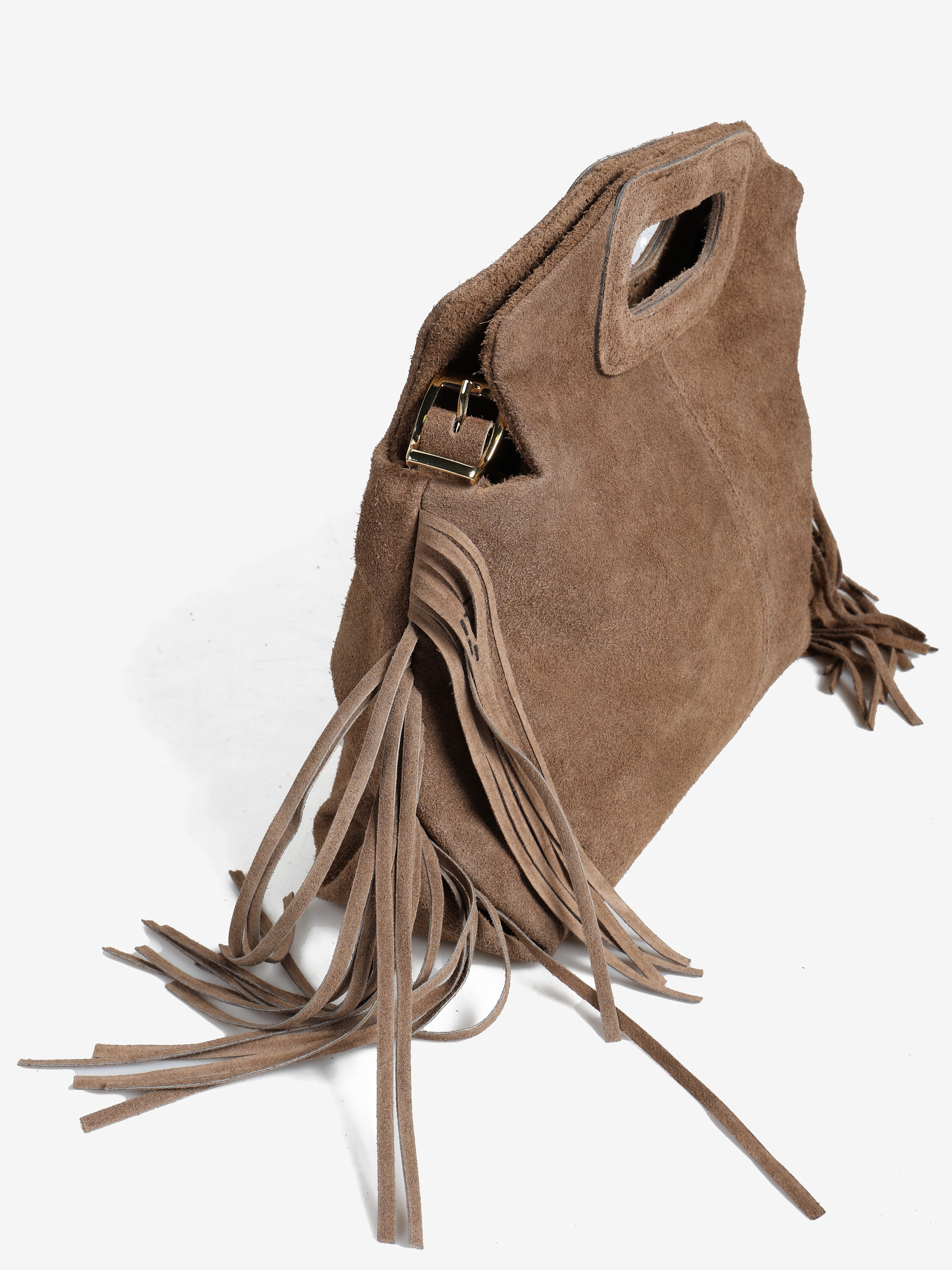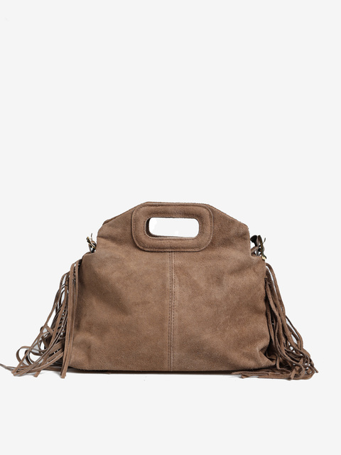 Zamszowa torebka do ręki z zapięciem na suwak i ozdobnymi frędzlami. Dodatkowy pasek do noszenia na ramię.