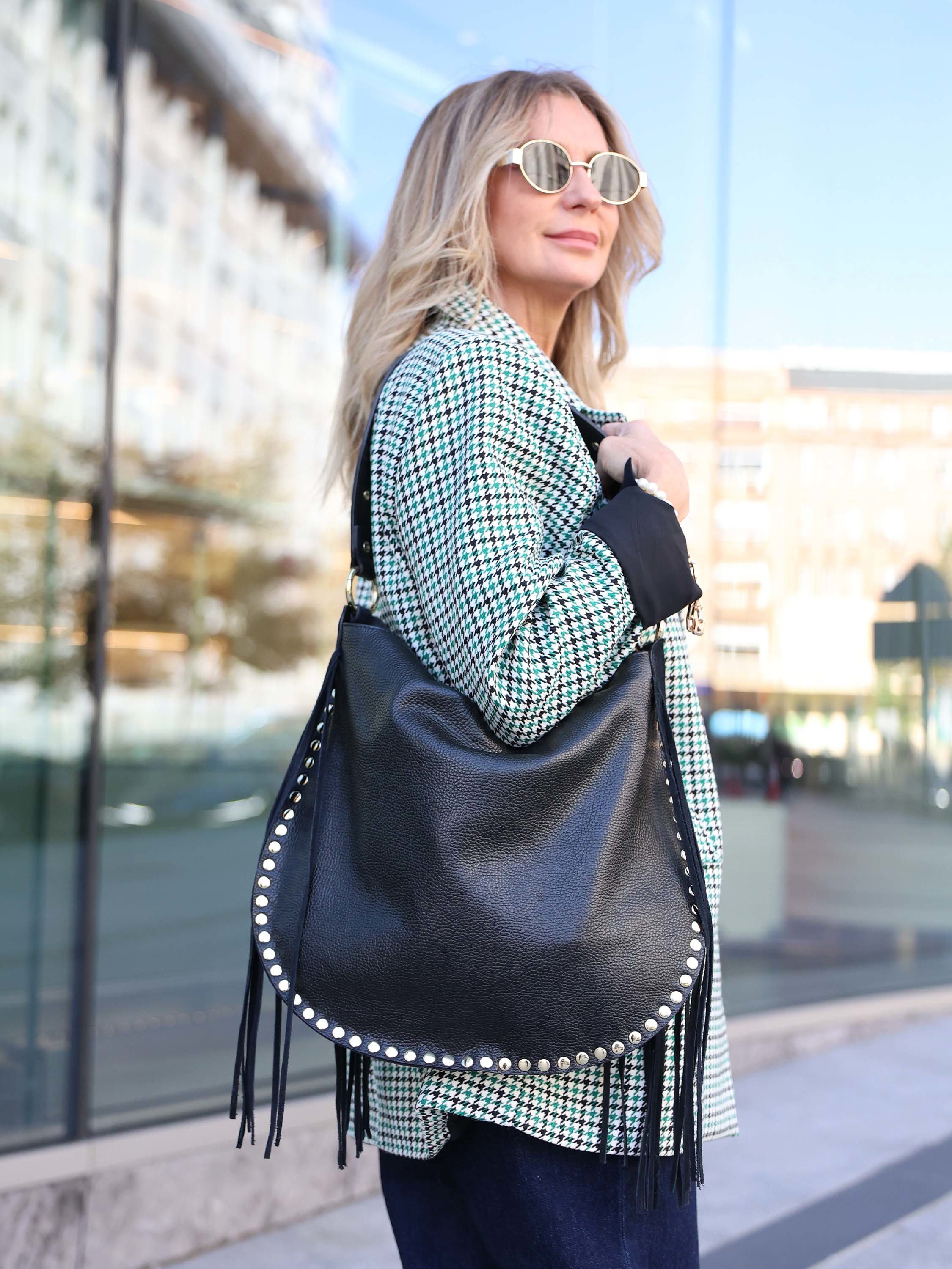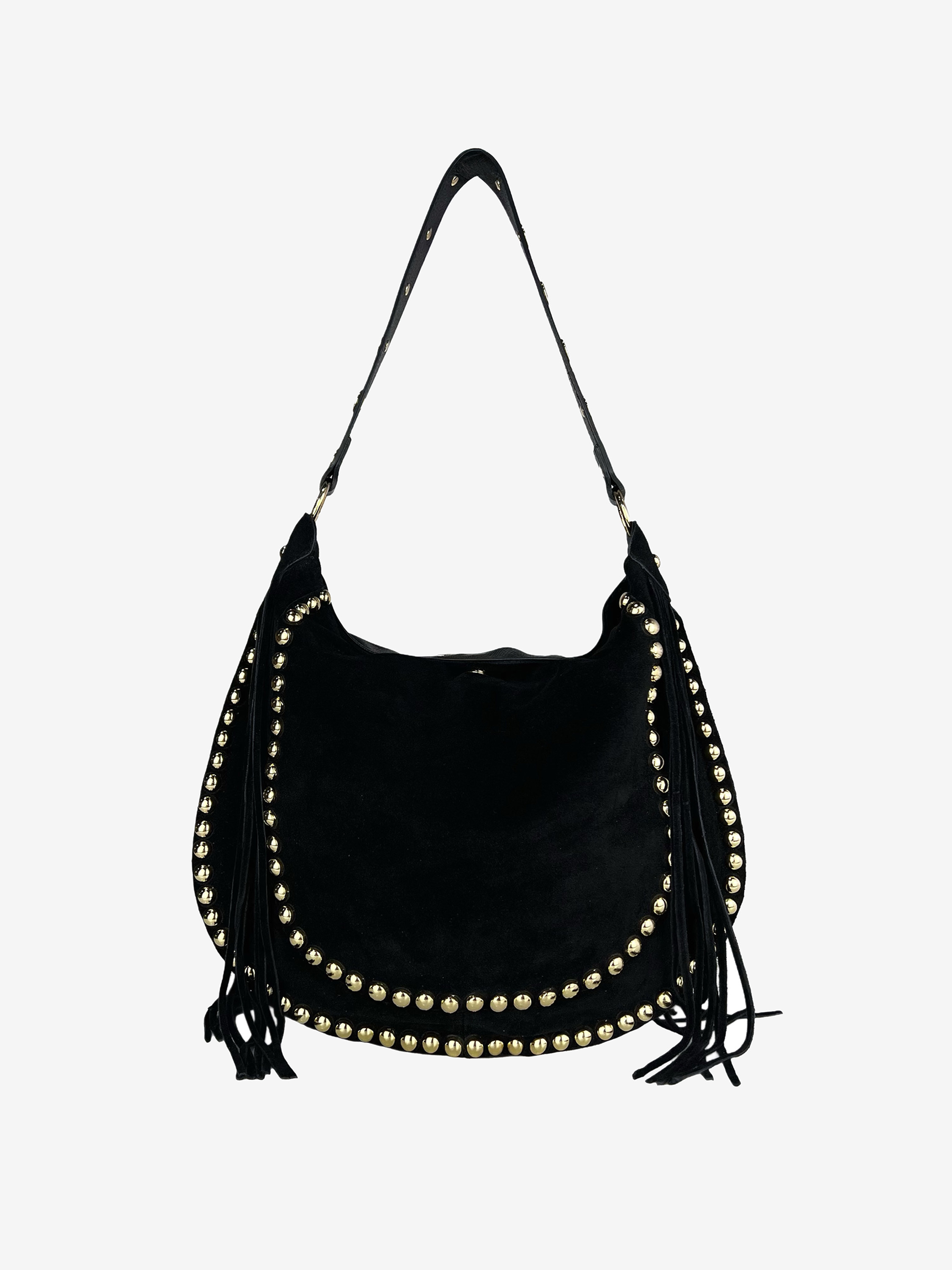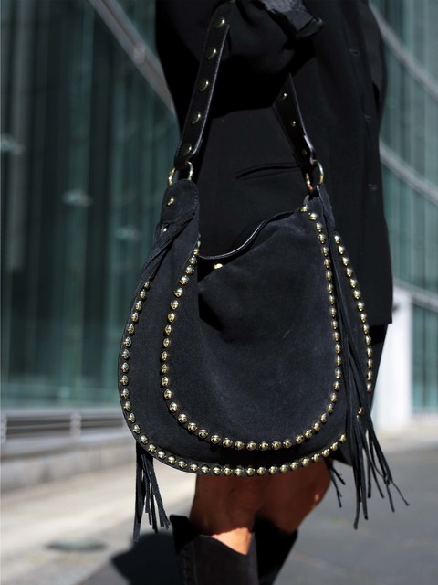 Torebka dwustronna - z naturalnego zamszu i skóry. W komplecie szeroki pasek z ćwiekami i wąski, regulowany. Ozdobne ćwieki i frędzle.