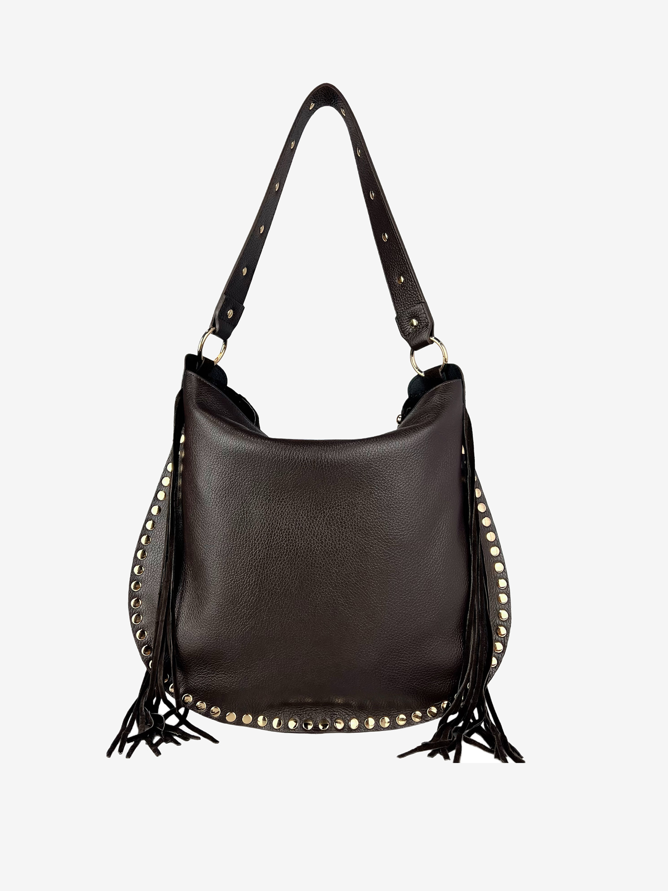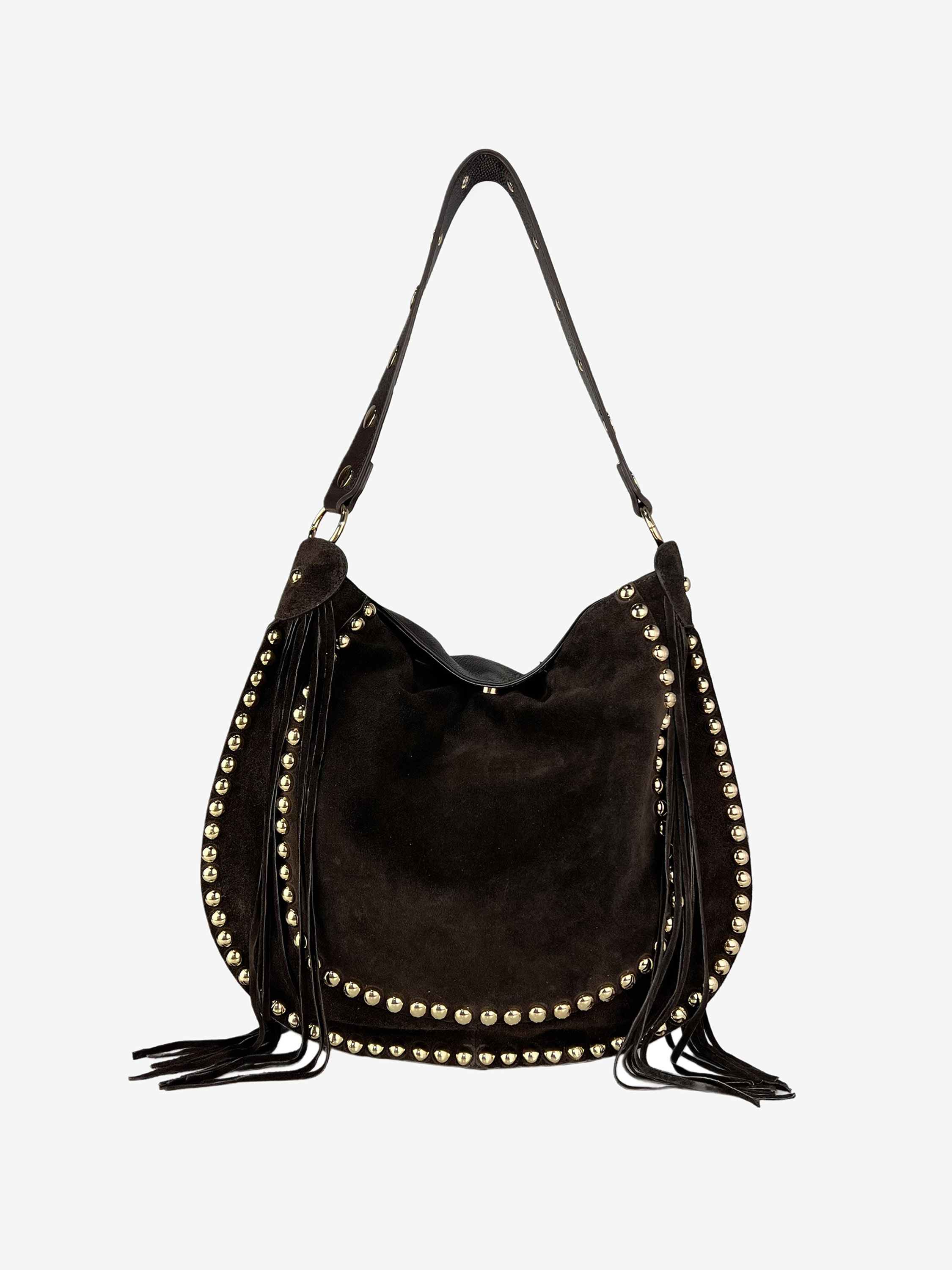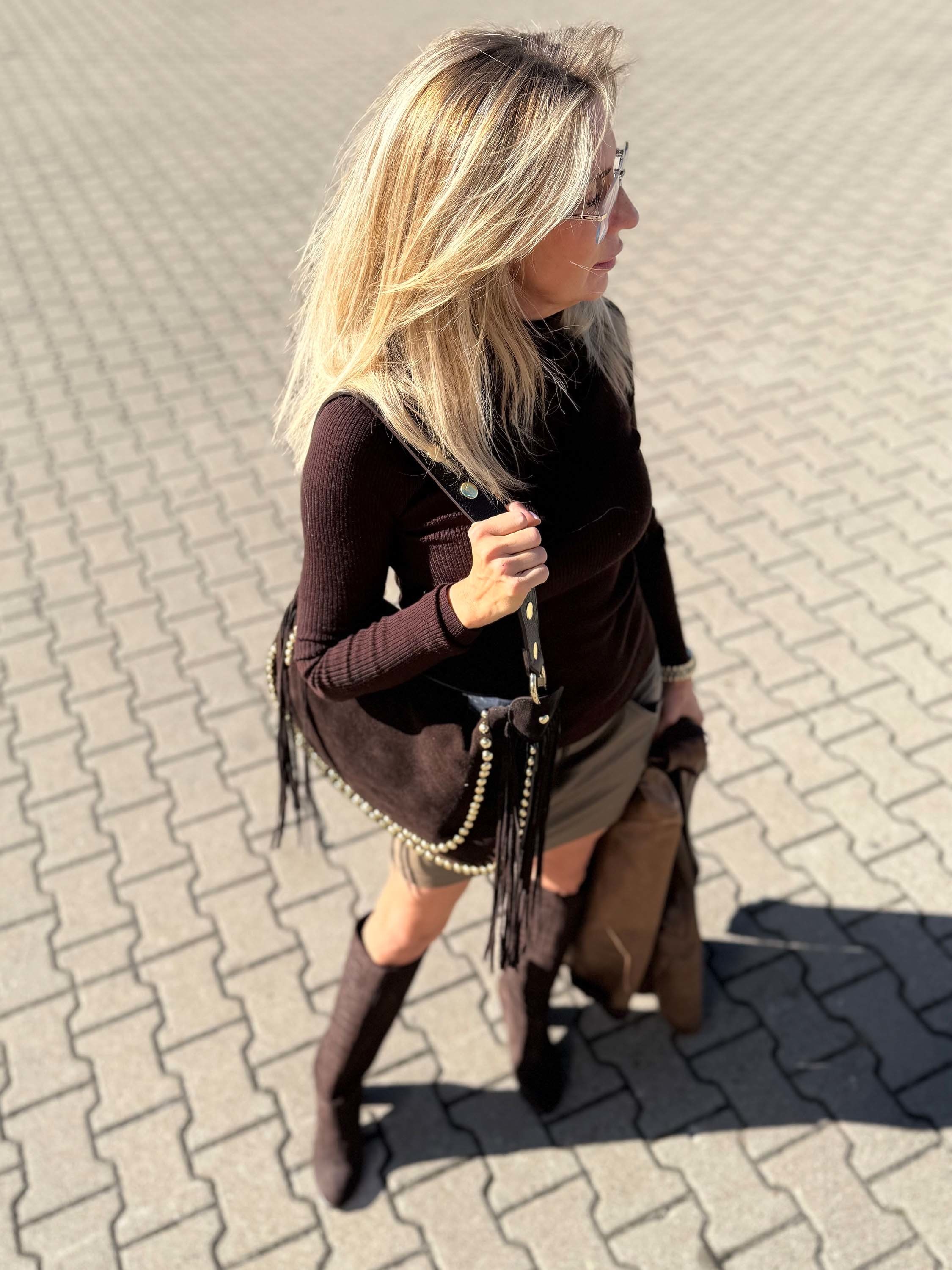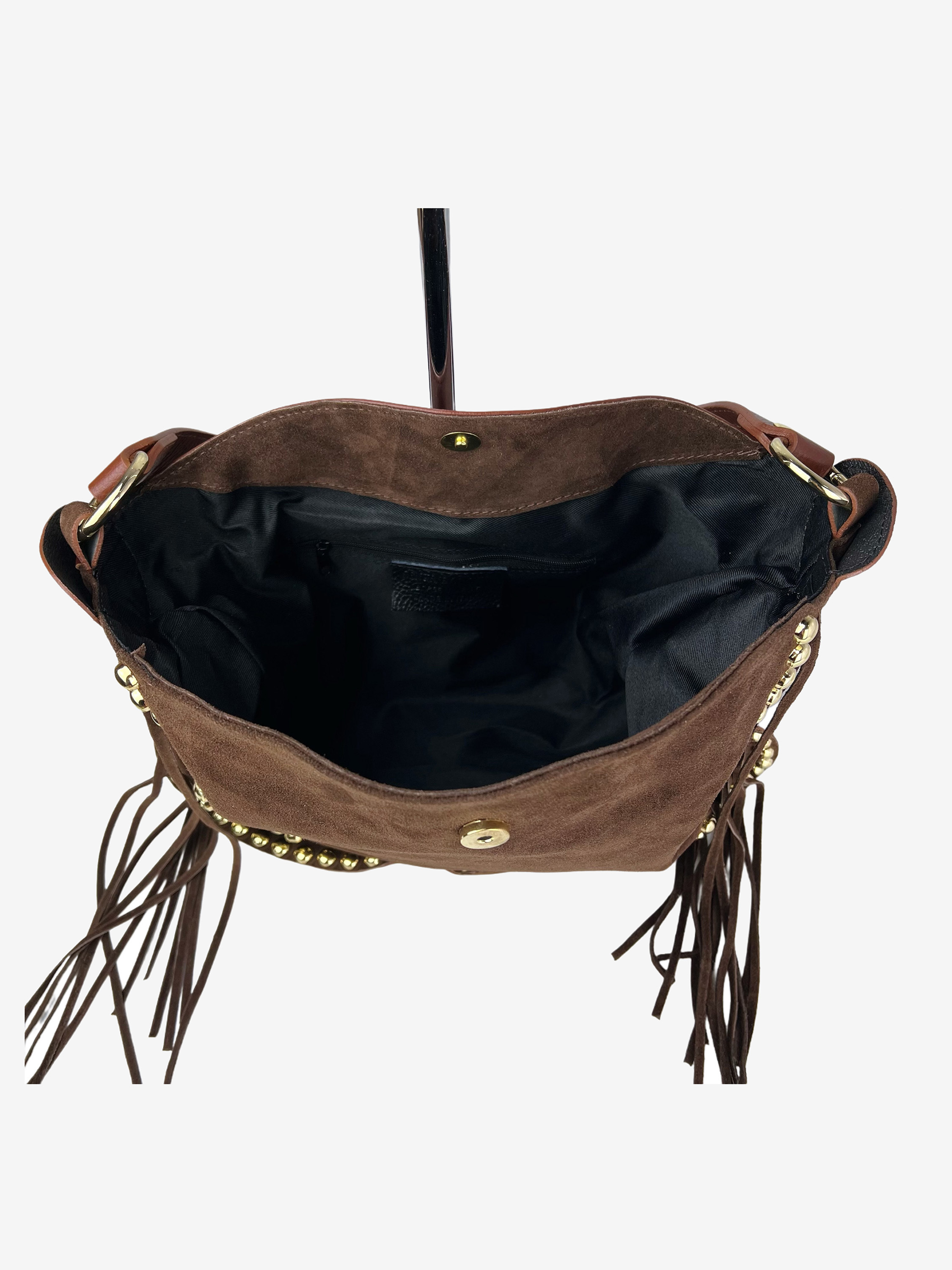 Torebka dwustronna - z naturalnego zamszu i skóry. W komplecie szeroki pasek z ćwiekami i wąski, regulowany. Ozdobne ćwieki i frędzle.