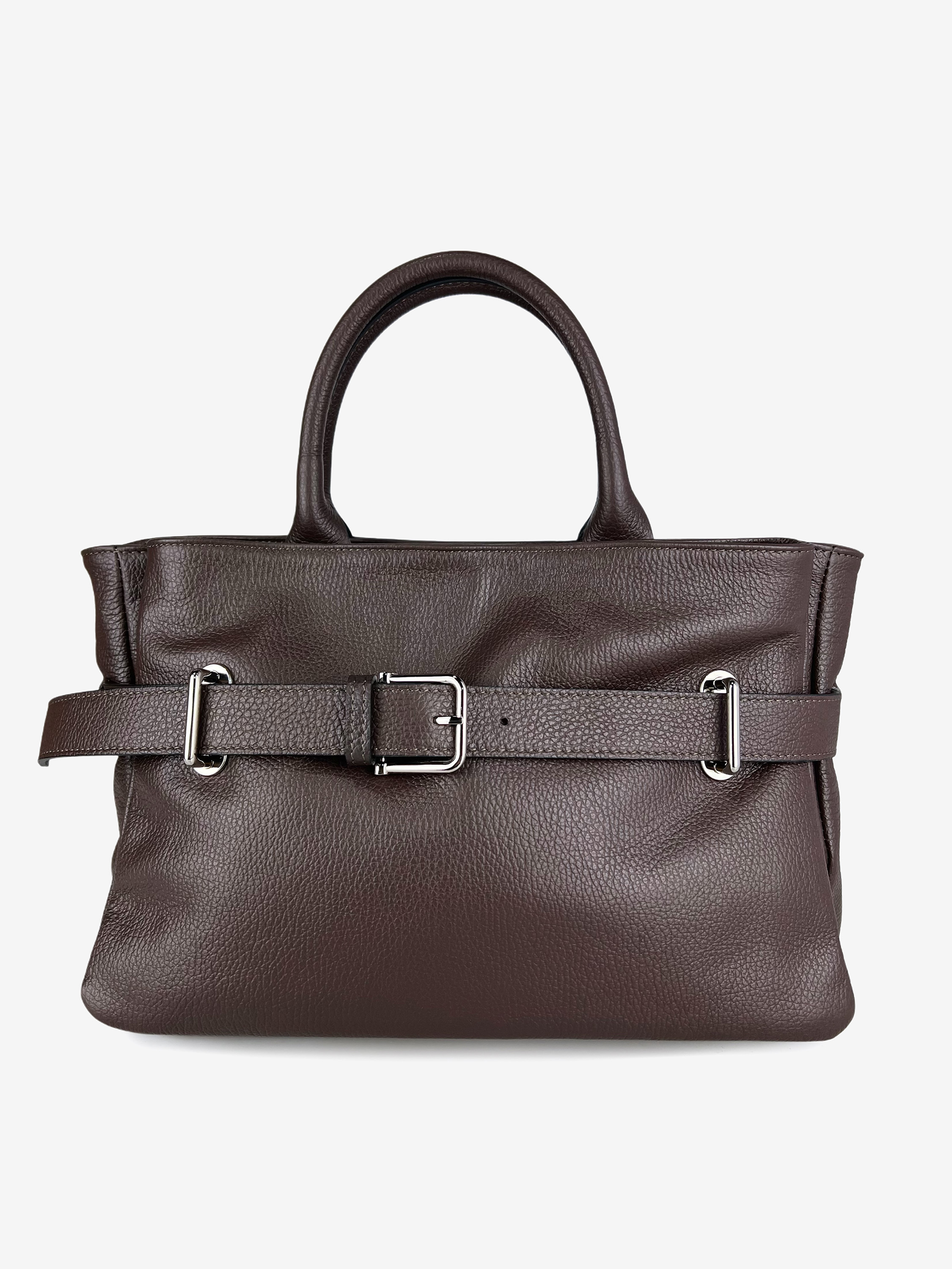 Torebka wykonana z mięsistej skóry naturalnej, z ozdobnym paskiem. Trzy niezależne przegródki i dodatkowy pasek do noszenia na ramieniu.