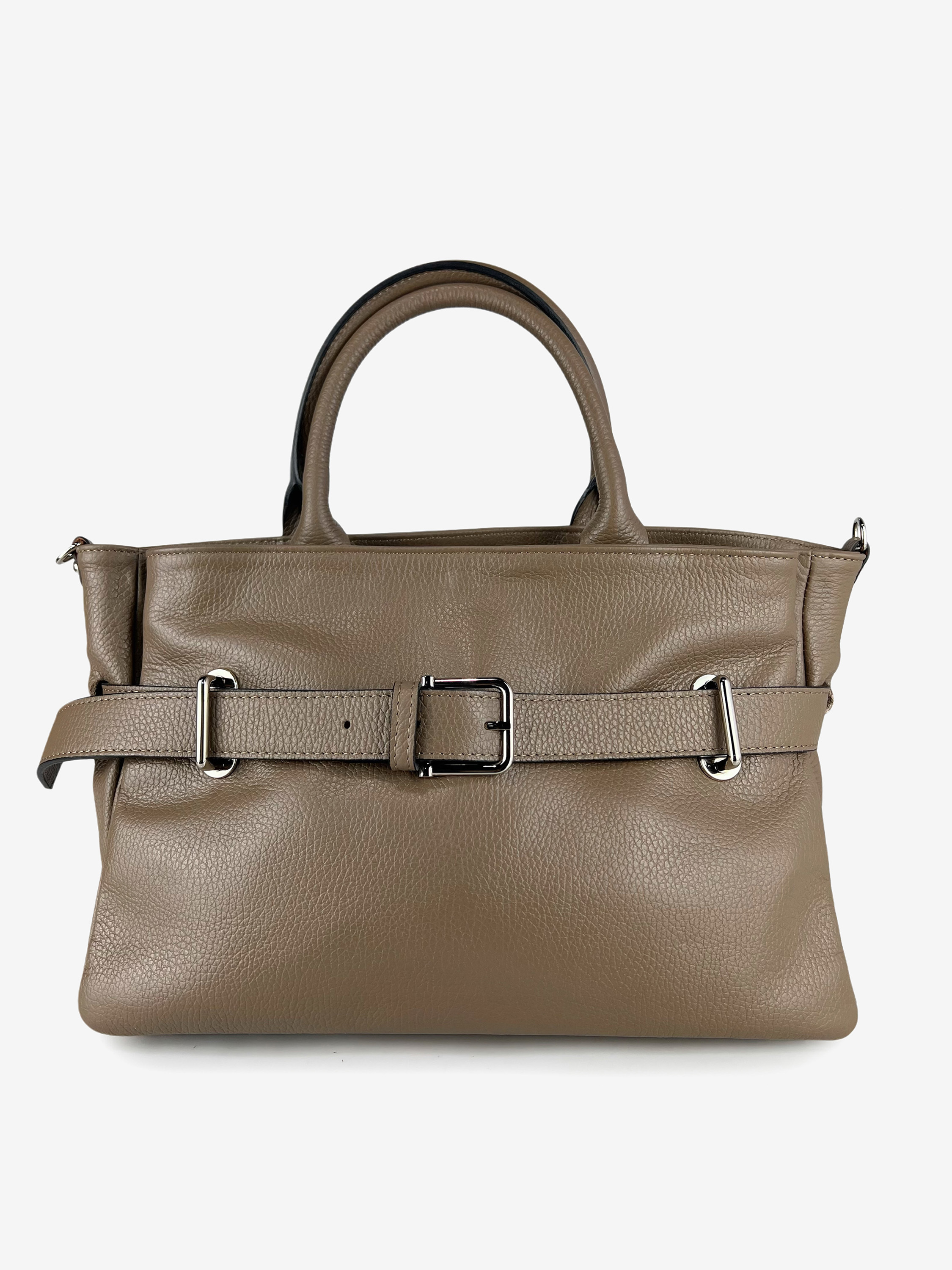 Torebka wykonana z mięsistej skóry naturalnej, z ozdobnym paskiem. Trzy niezależne przegródki i dodatkowy pasek do noszenia na ramieniu.