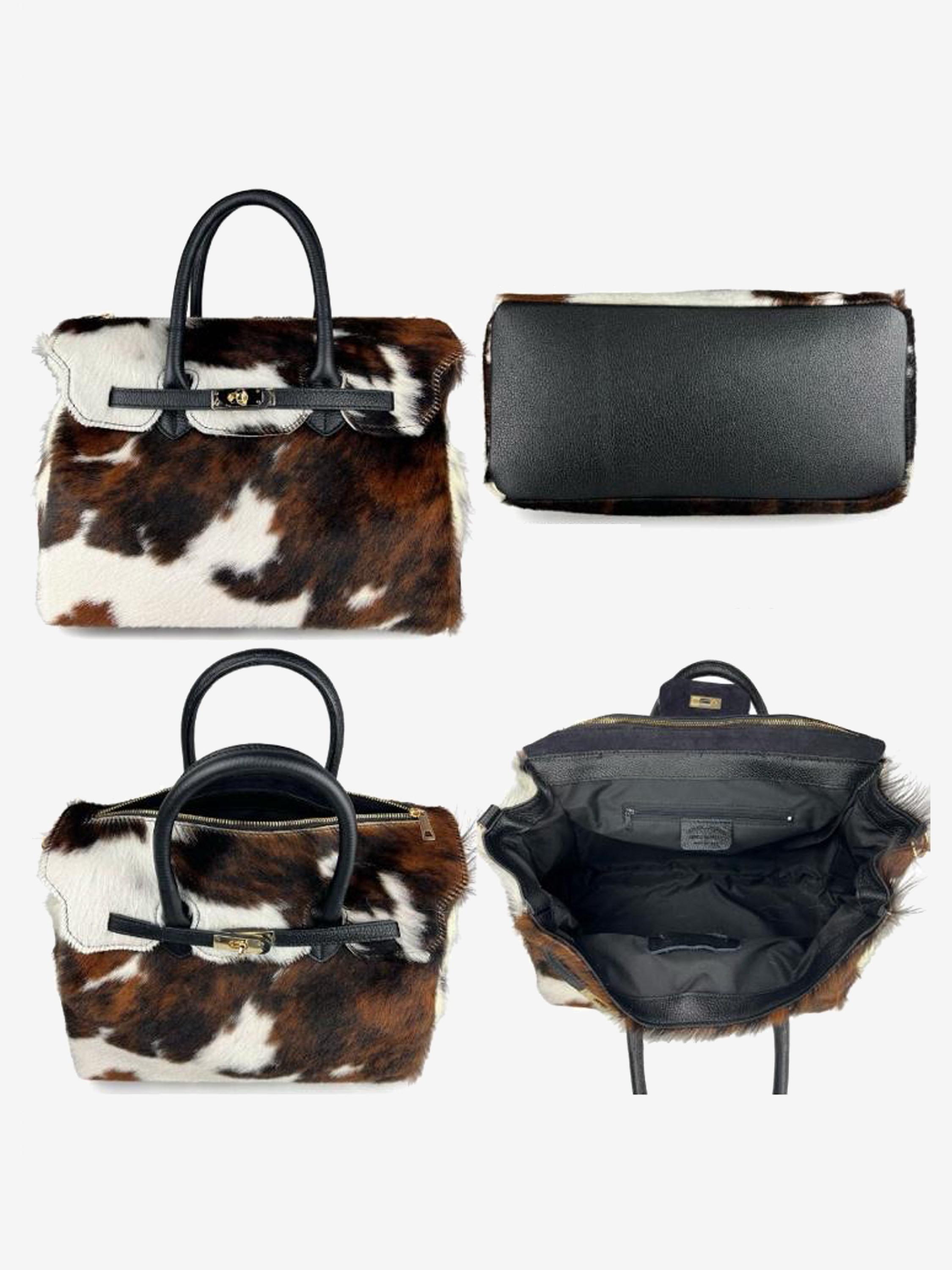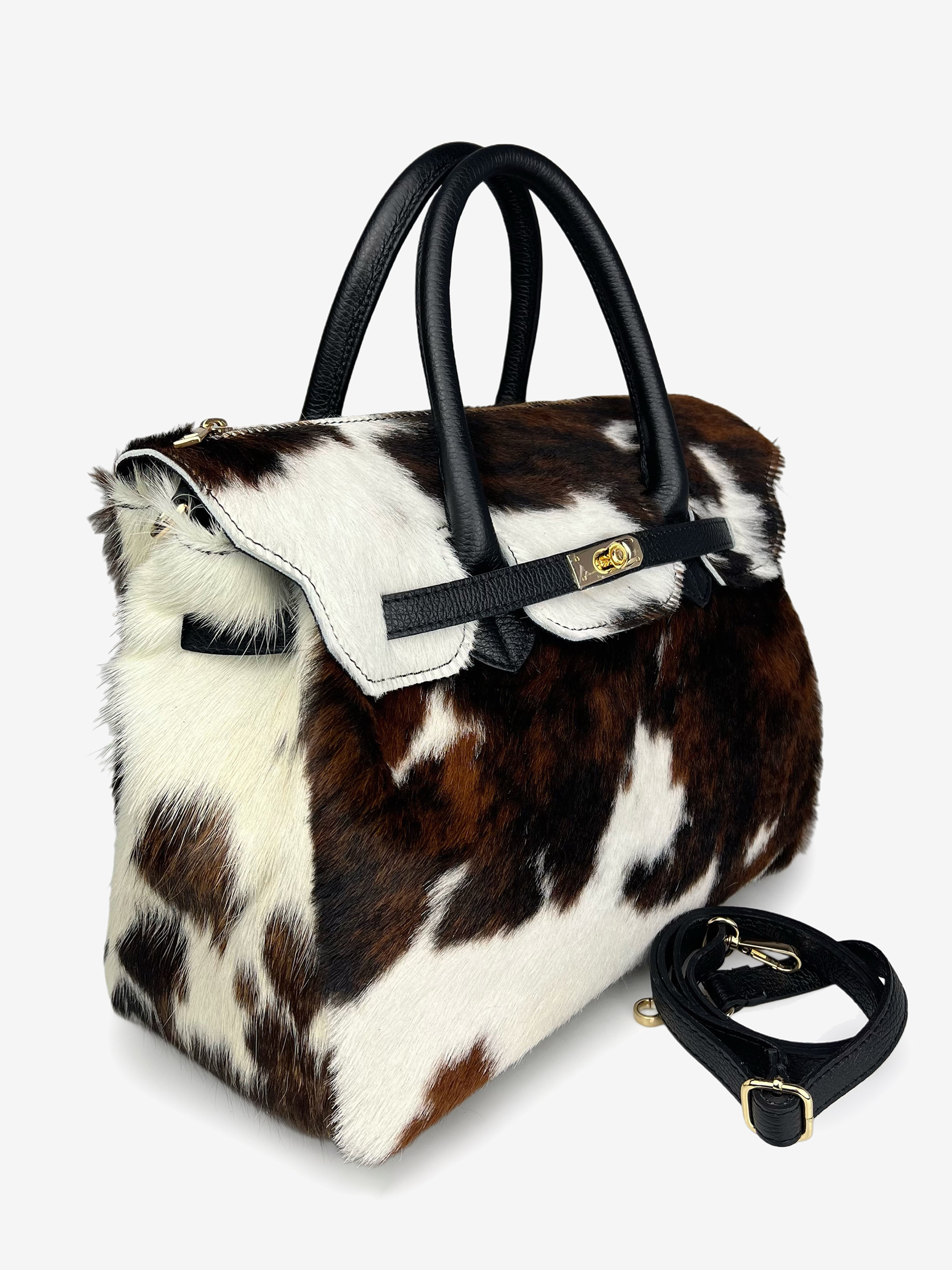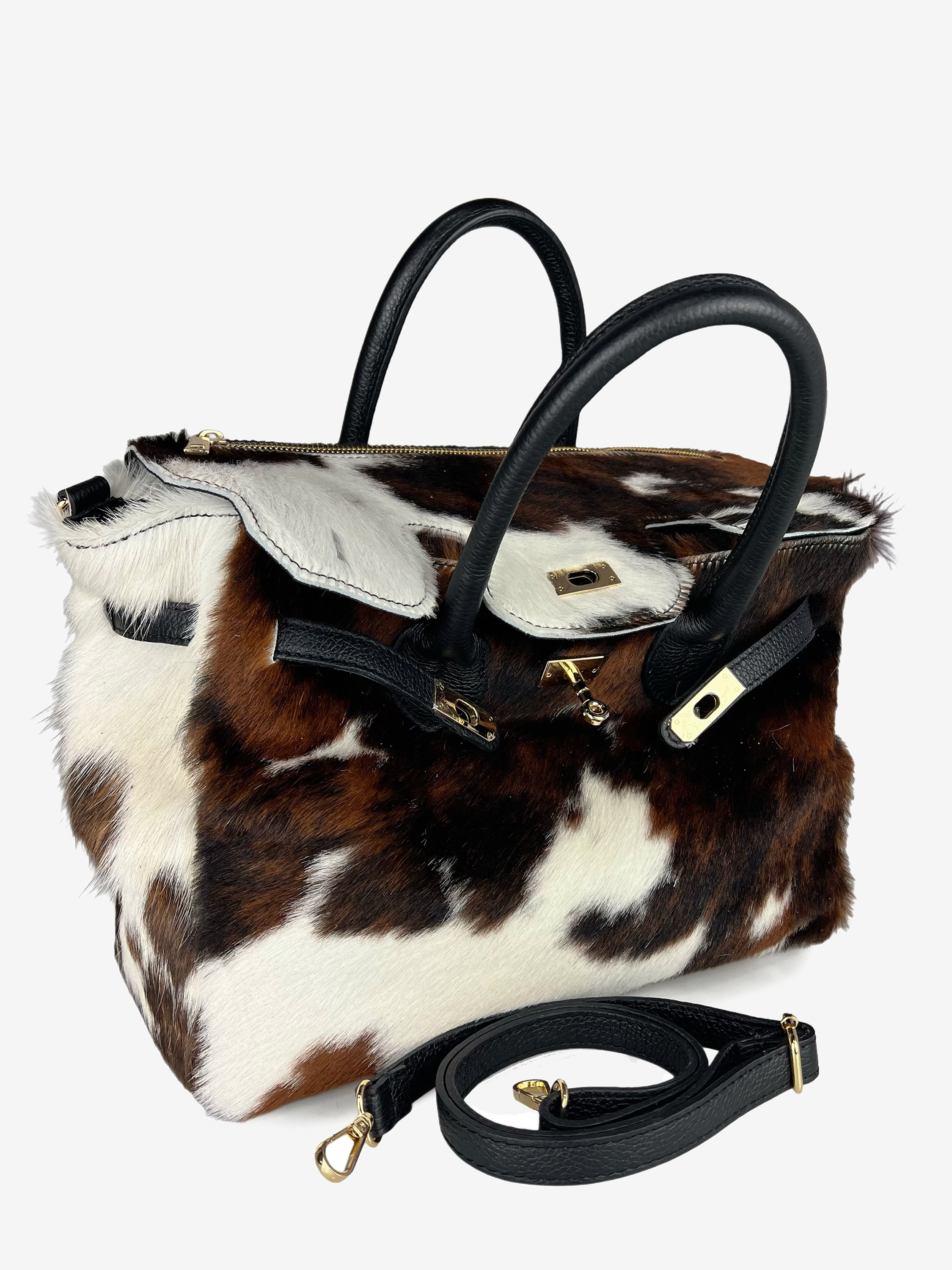 Torba wykonana z naturalnej skóry z włosiem we wzór COW PRINT. Ozdobna klapa ze złotym zapięciem. Dodatkowy, regulowany pasek do noszenia na ramieniu.