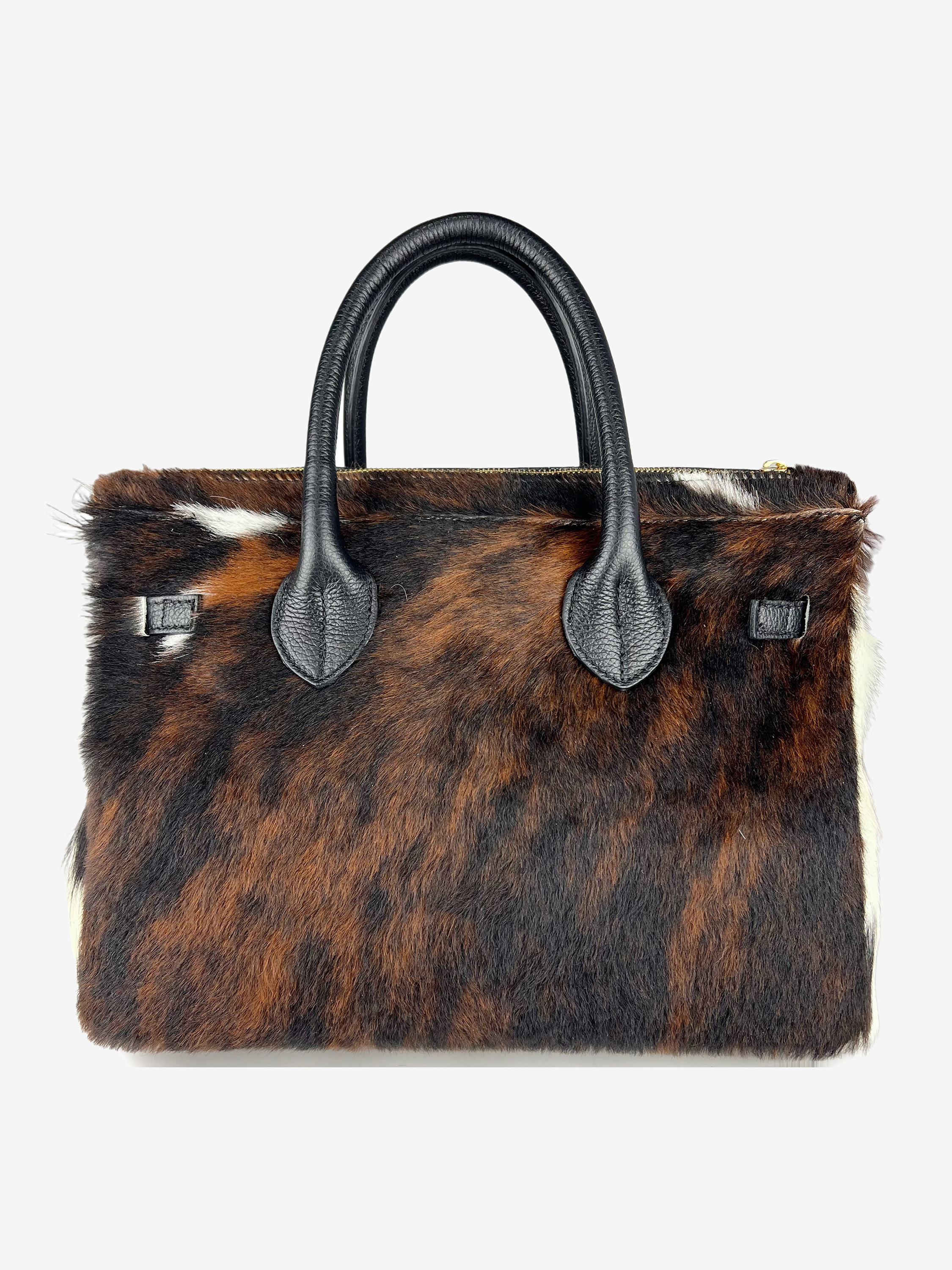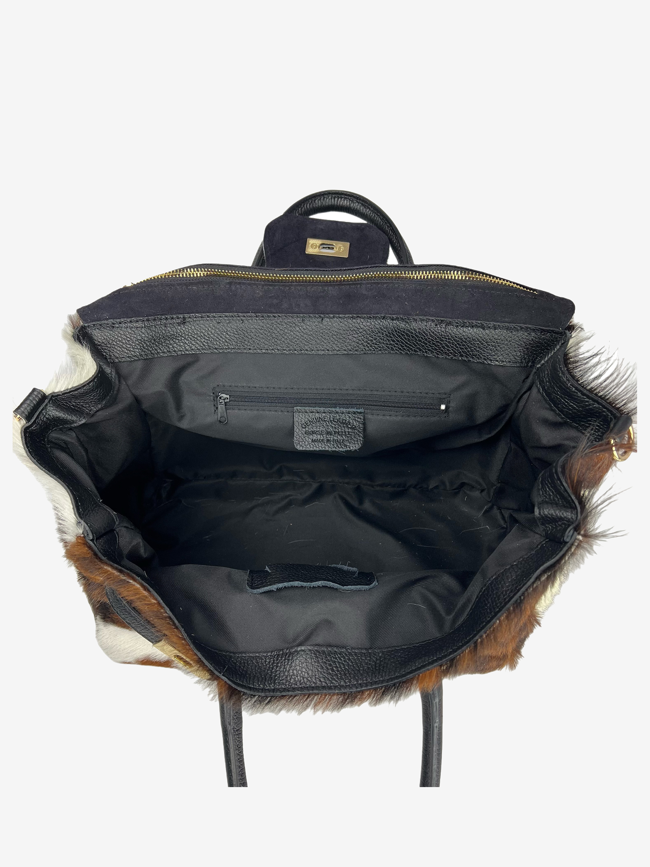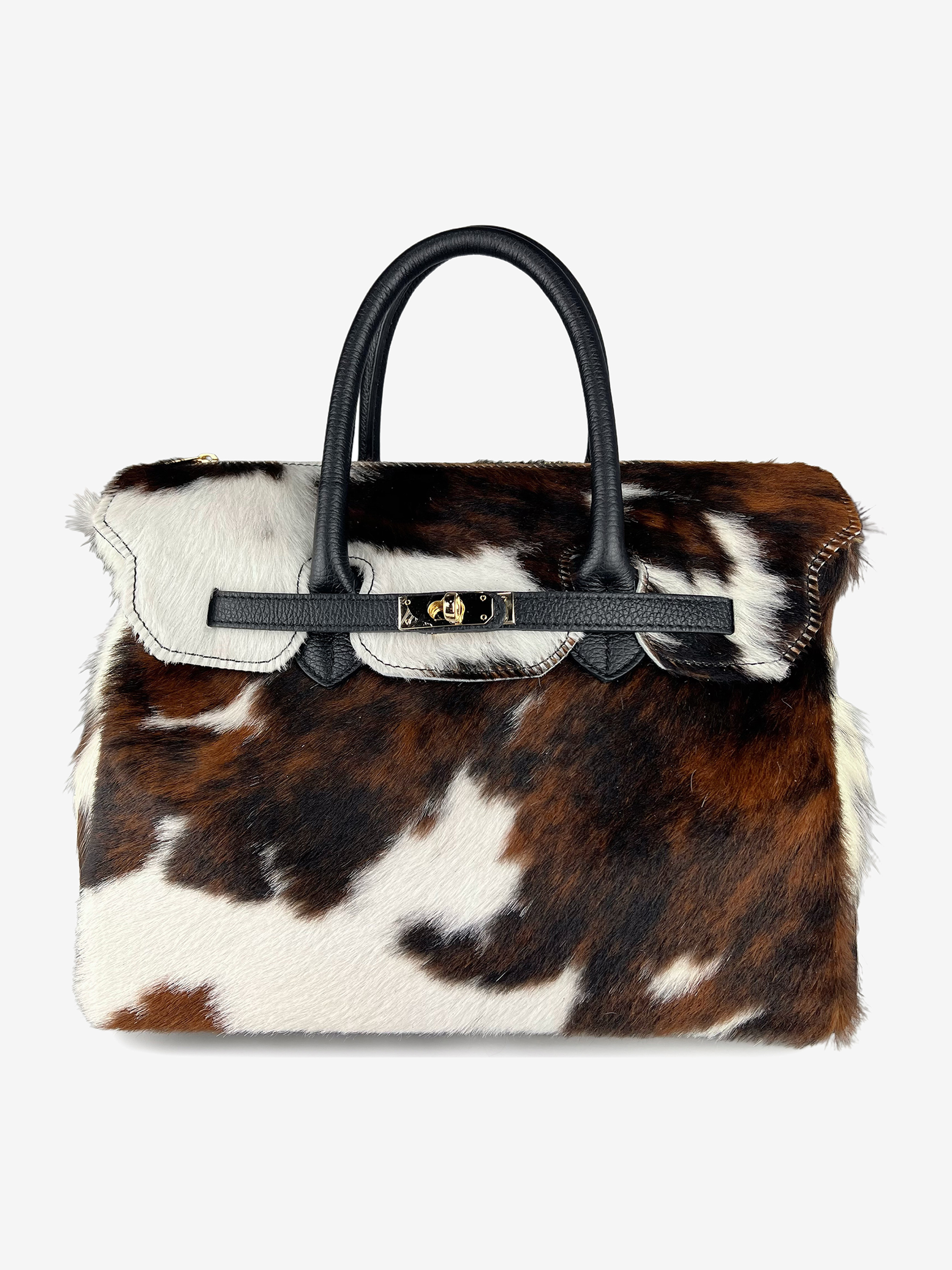 Torba wykonana z naturalnej skóry z włosiem we wzór COW PRINT. Ozdobna klapa ze złotym zapięciem. Dodatkowy, regulowany pasek do noszenia na ramieniu.