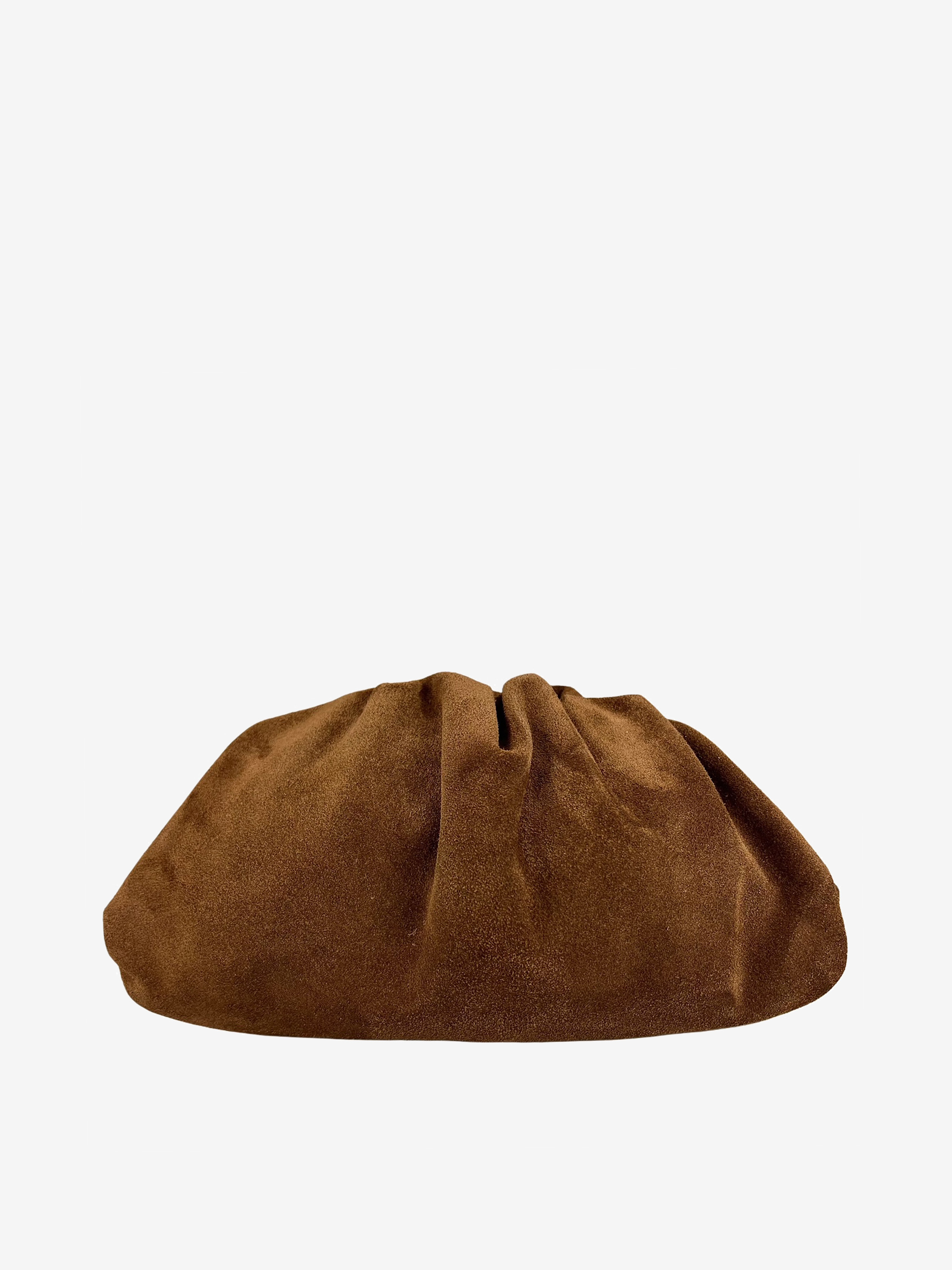 Mała torebka do ręki zamykana na zatrzask, wykonana z zamszu. Dodatkowy, odczepiany łańcuszek do noszenia na ramieniu.