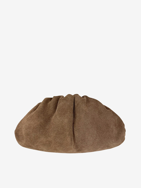 Mała torebka do ręki zamykana na zatrzask, wykonana z zamszu. Dodatkowy, odczepiany łańcuszek do noszenia na ramieniu.