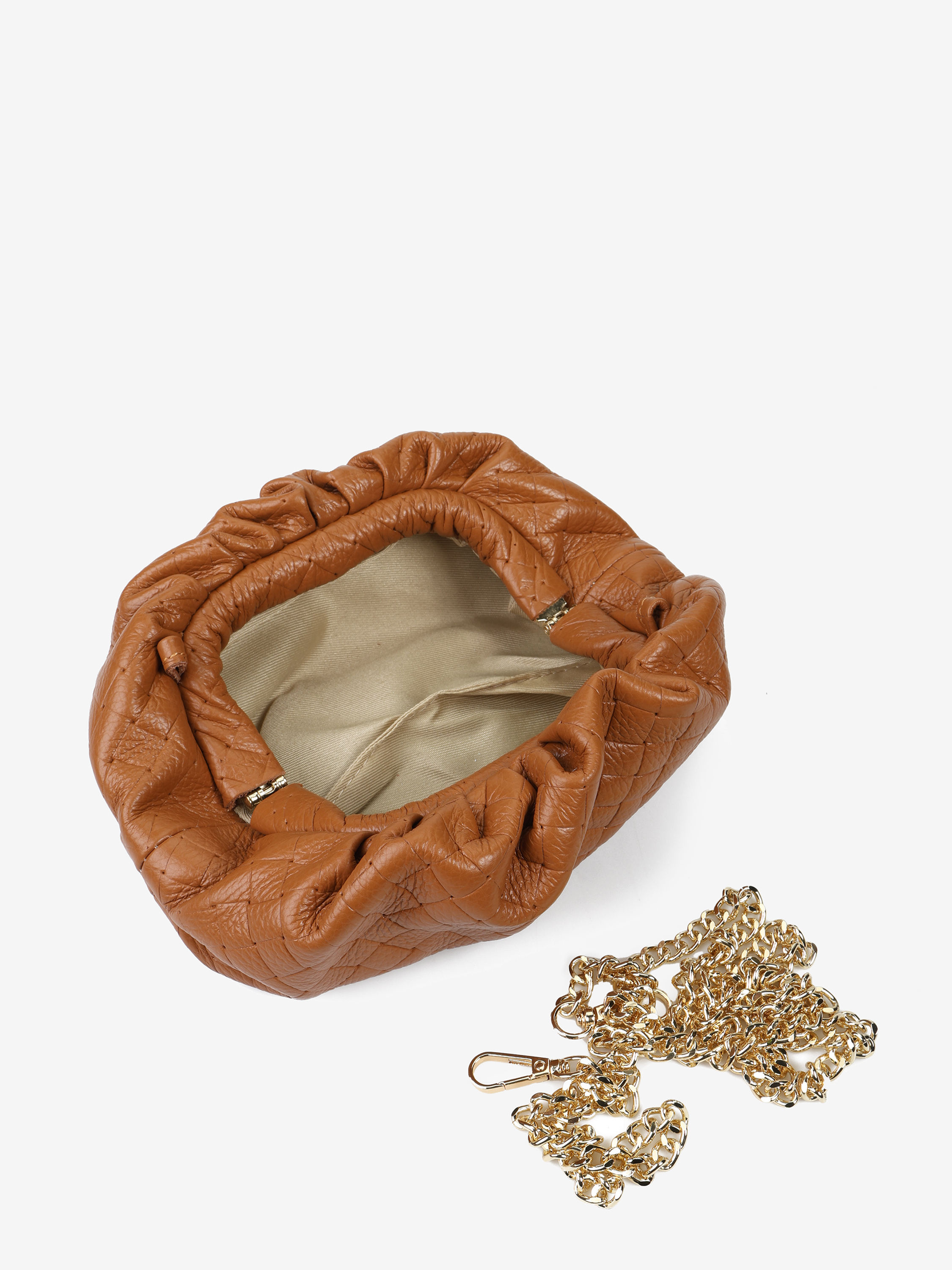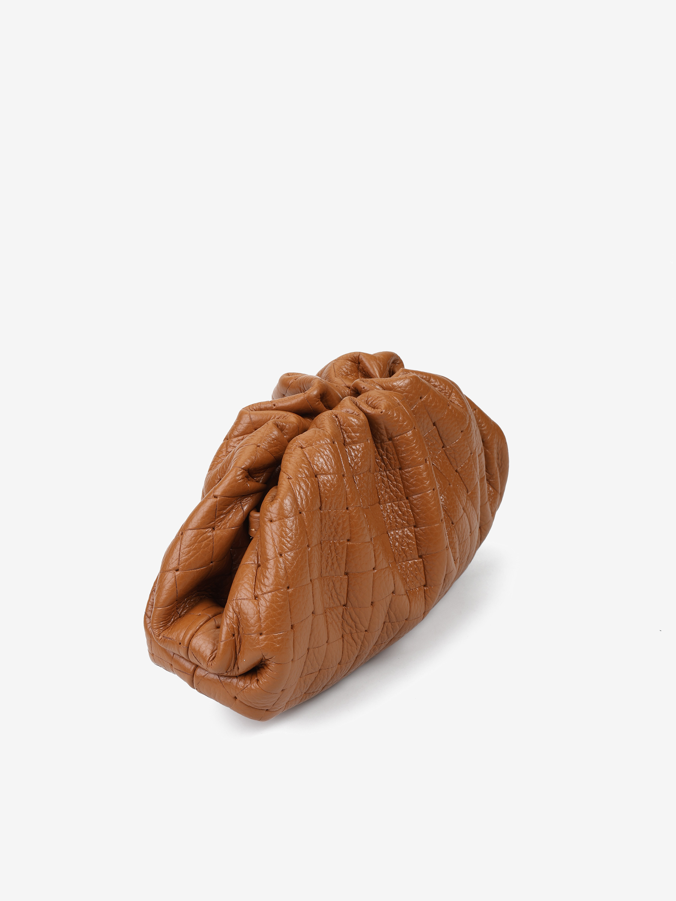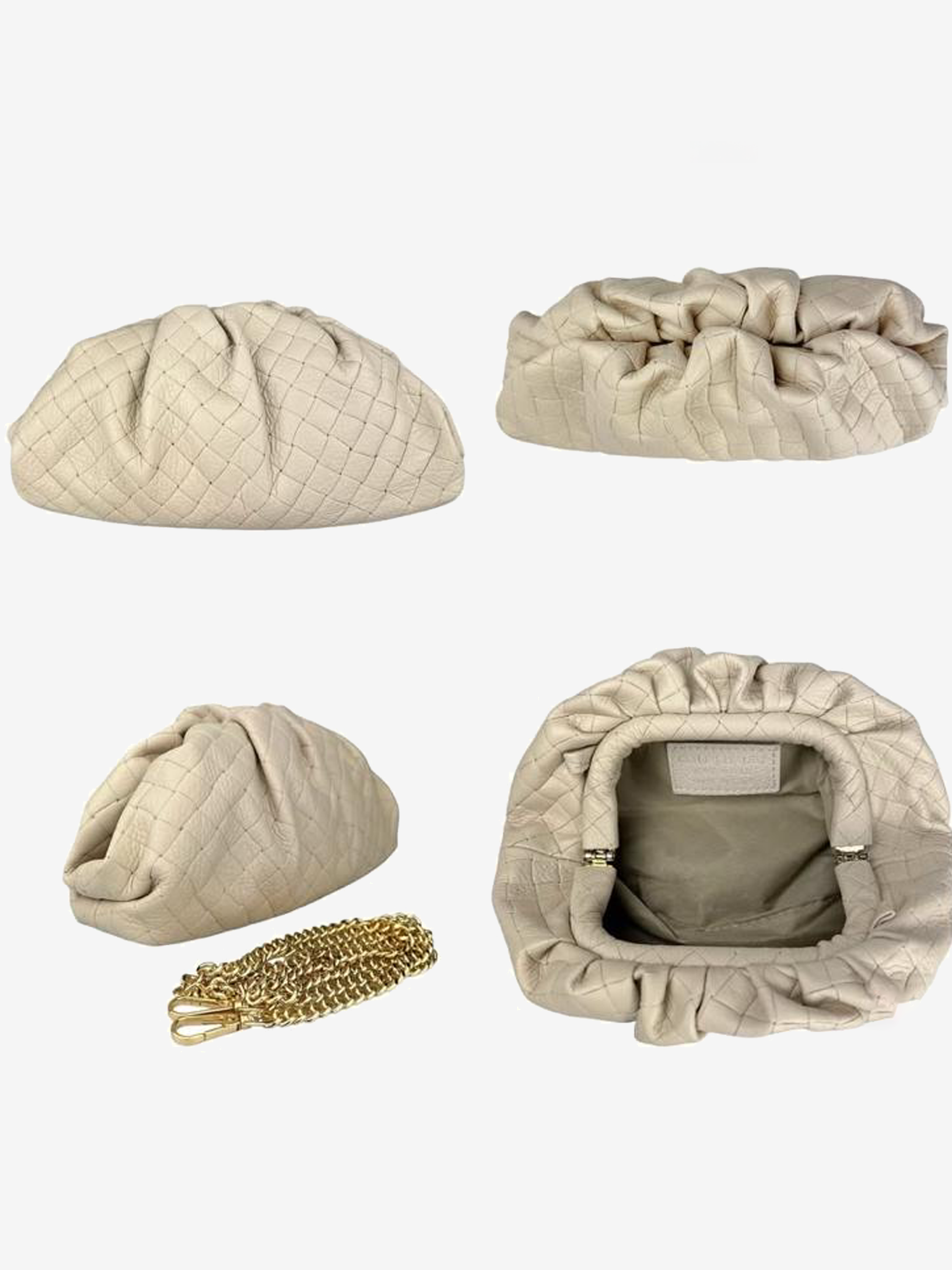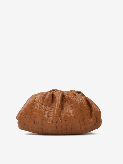 Mała torebka do ręki zamykana na zatrzask, wykonana ze skórzanej plecionki. Dodatkowy, odczepiany łańcuszek do noszenia na ramię.