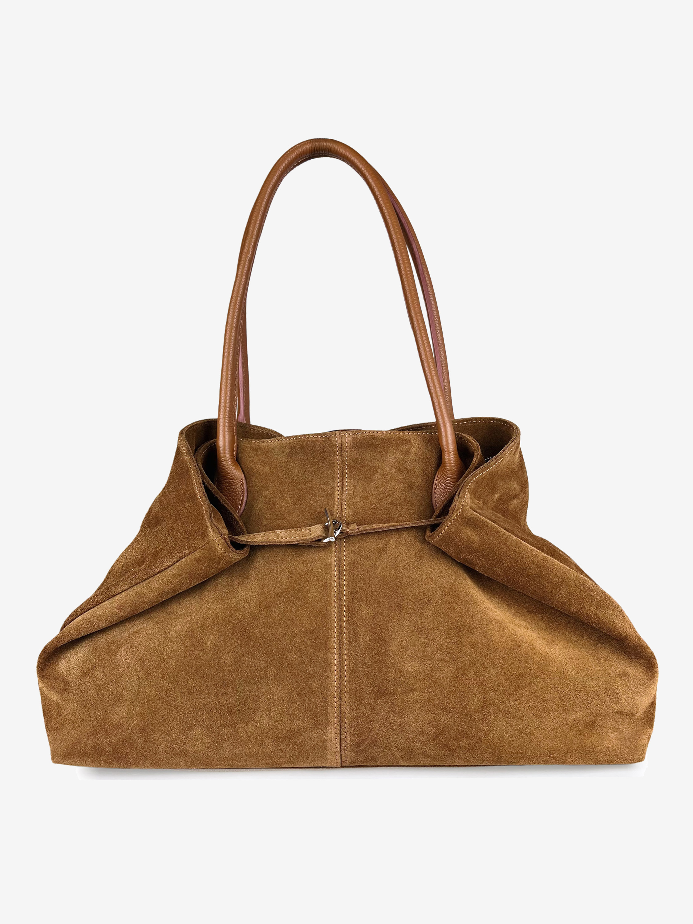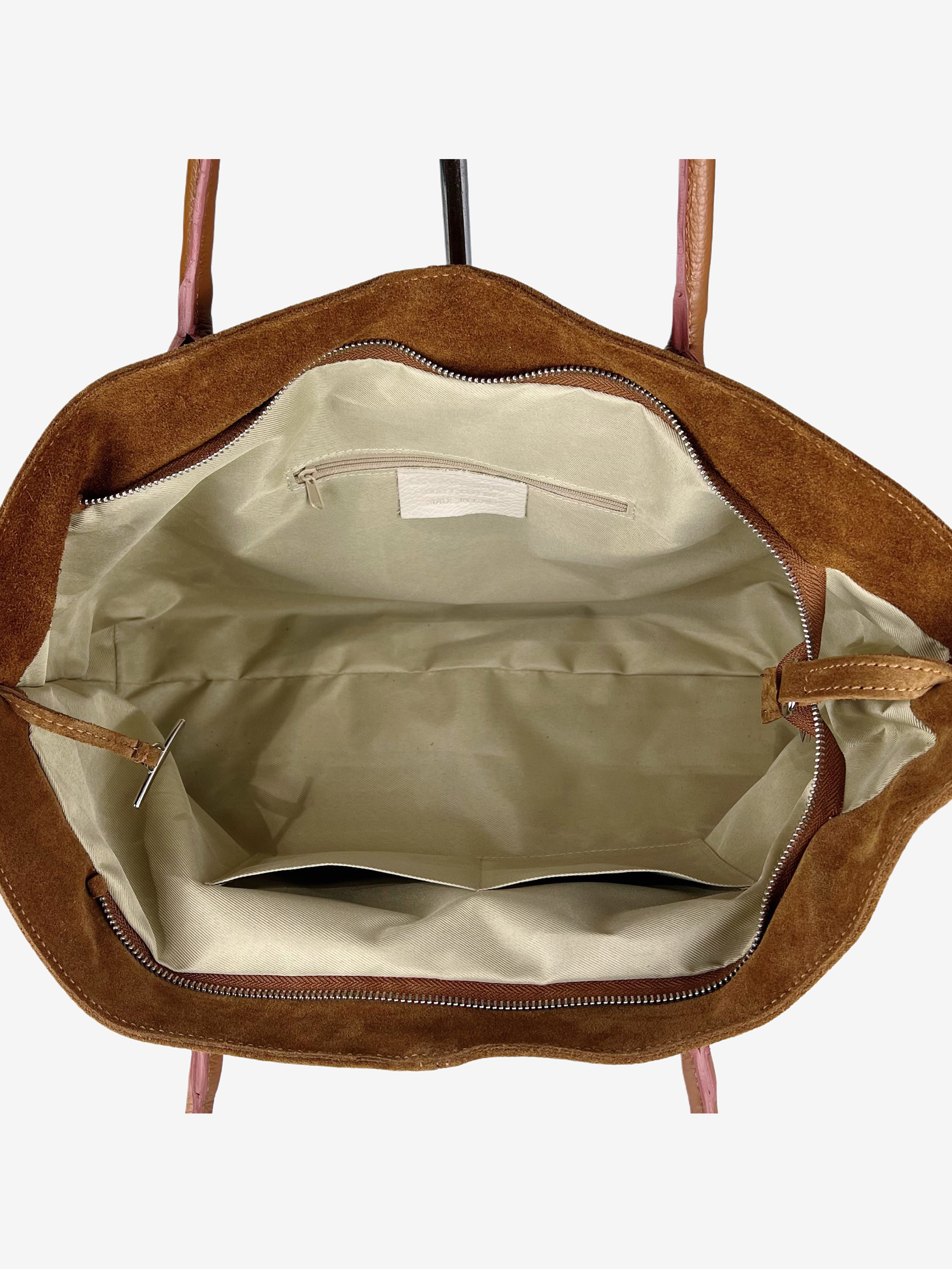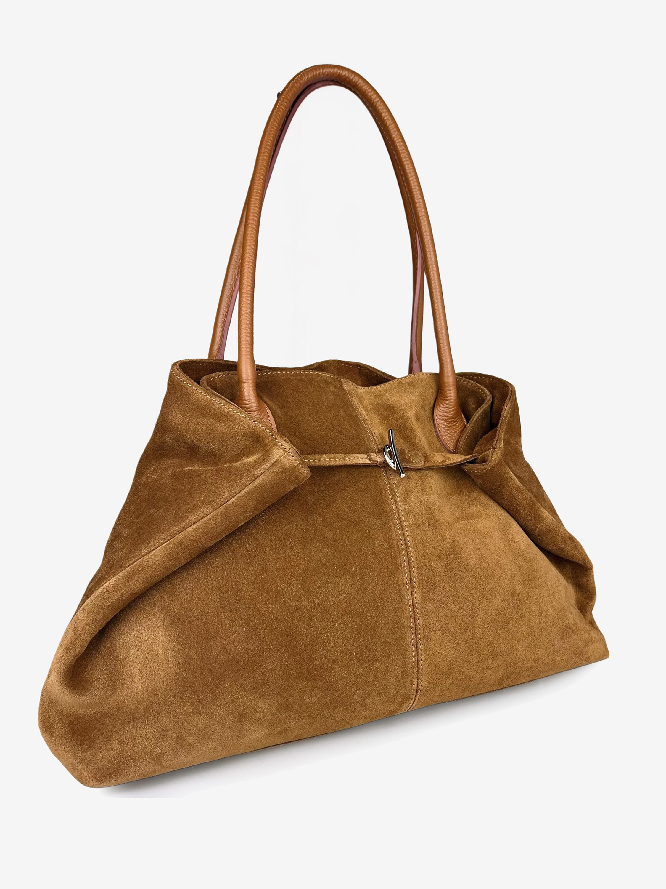 Zamszowy shopper z metalowym zapięciem, pozwalającym na noszenie torebki na dwa sposoby. Skórzane paski na ramię. Zapinanie na zamek.