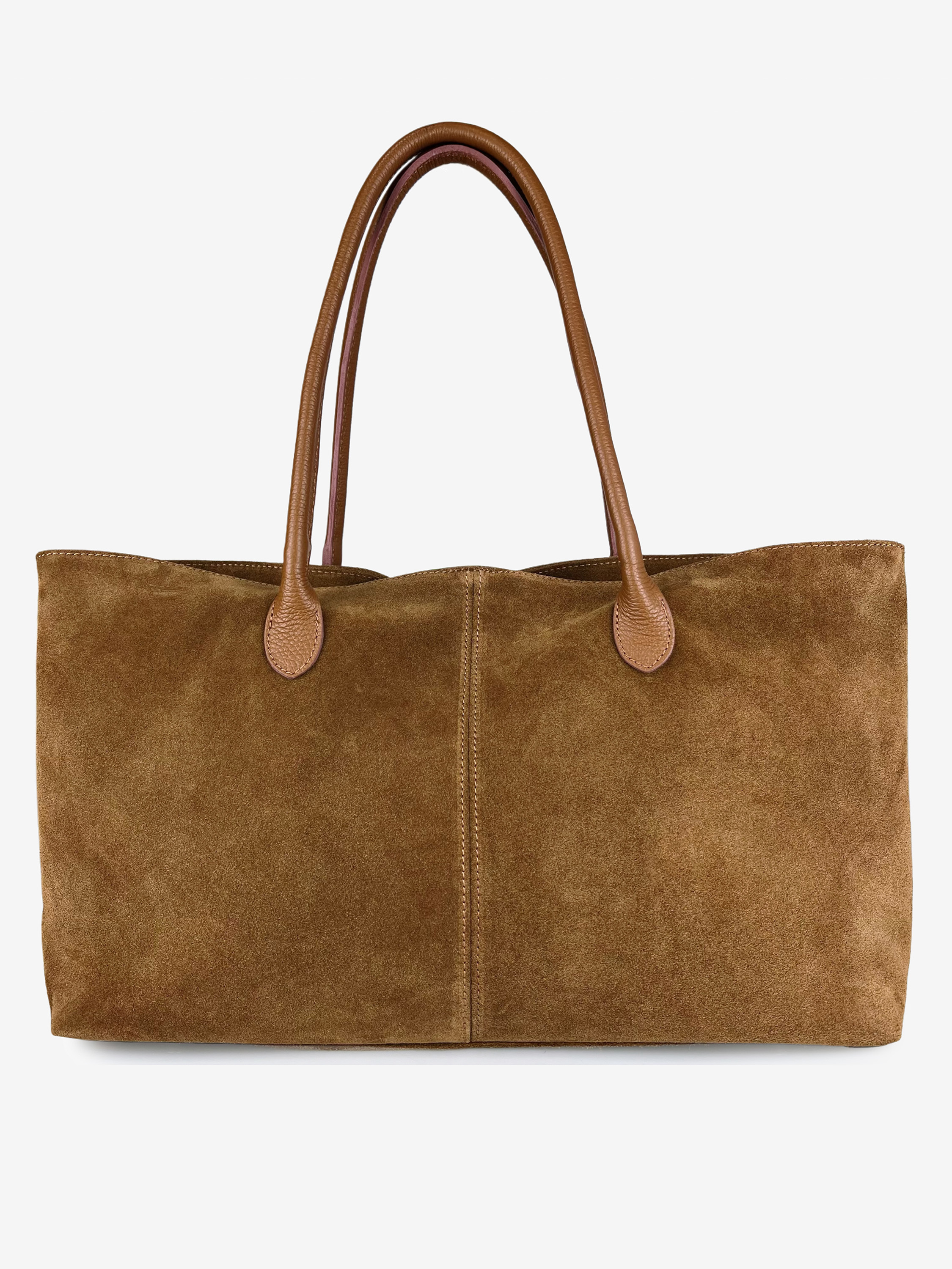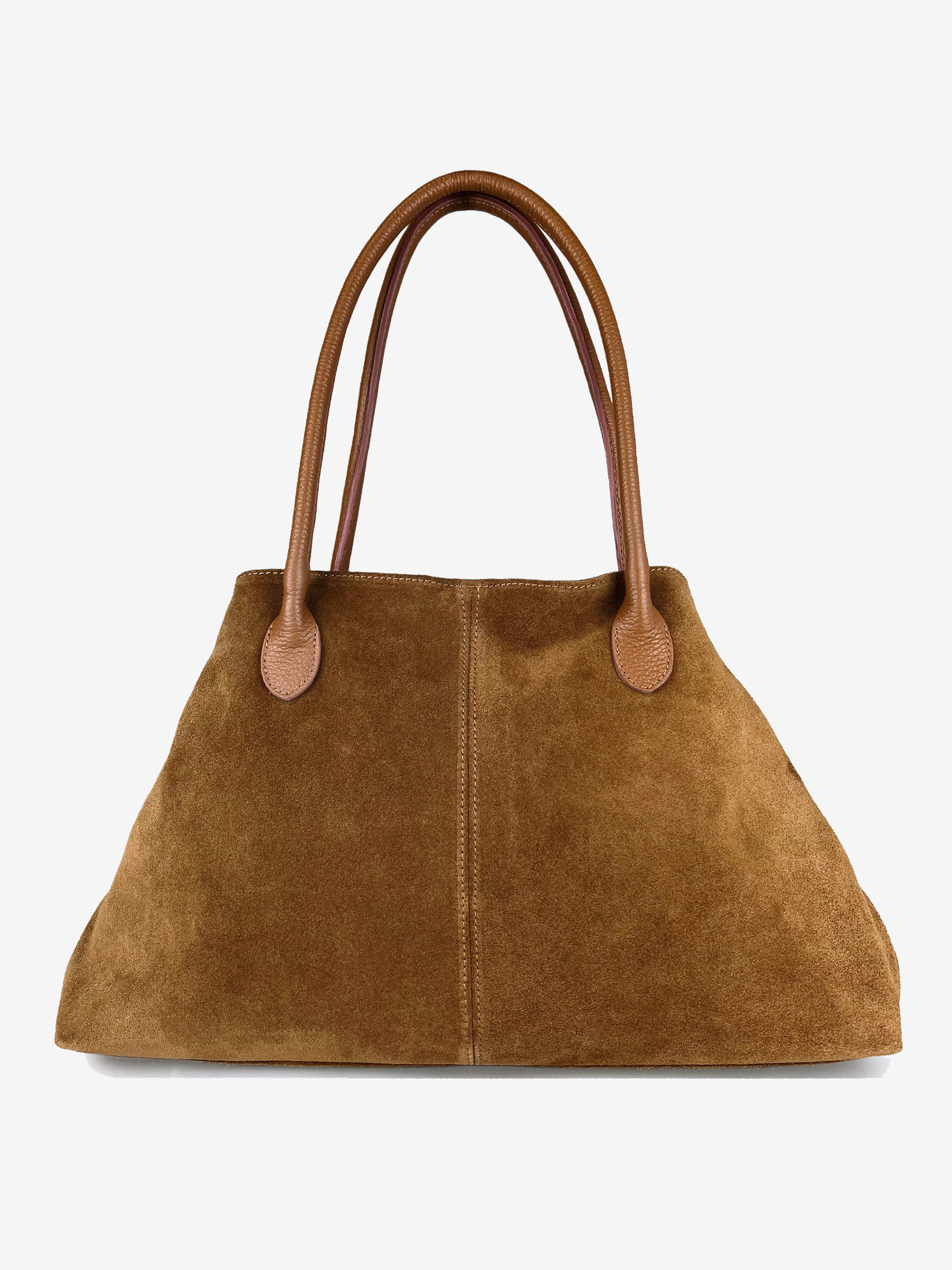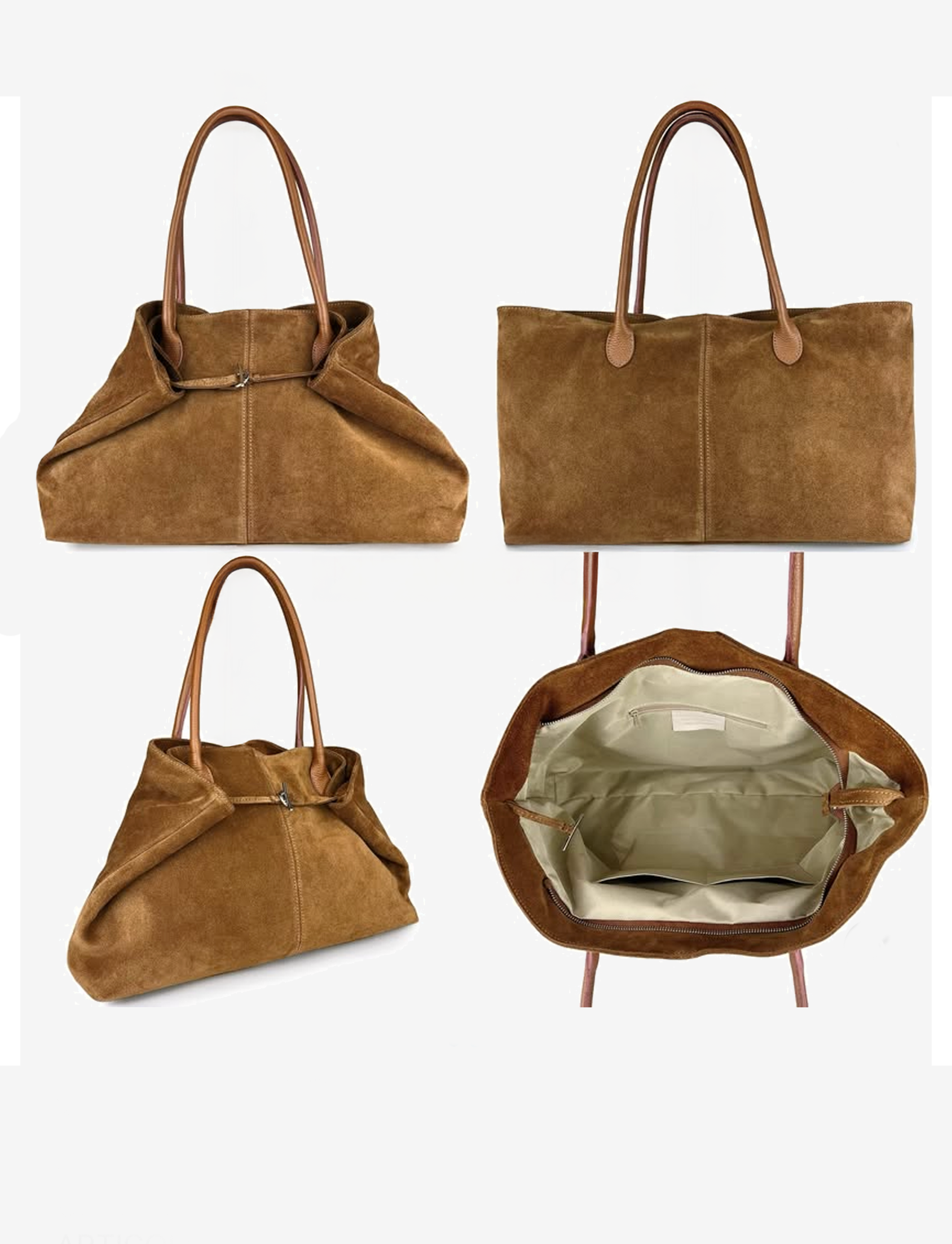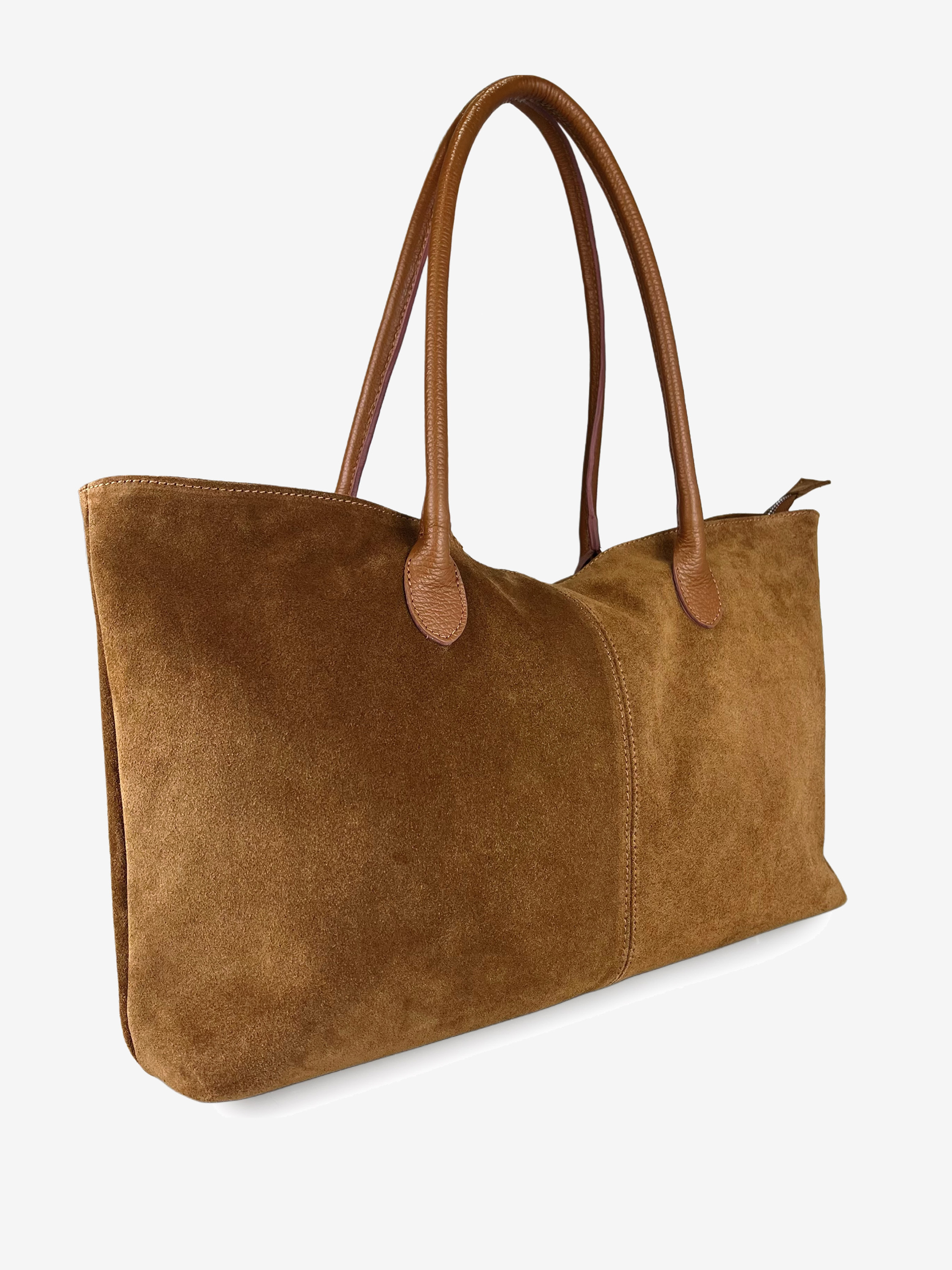 Zamszowy shopper z metalowym zapięciem, pozwalającym na noszenie torebki na dwa sposoby. Skórzane paski na ramię. Zapinanie na zamek.