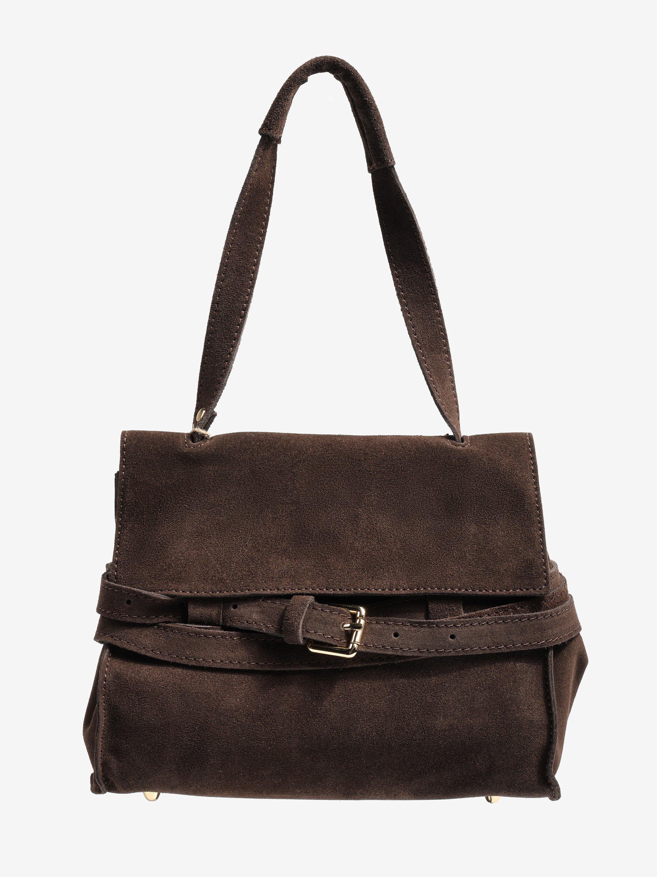 Zamszowa torebka z ozdobnym paskiem, zamykana klapą na magnes. W środku mała kieszonka zapinana na suwak. Dodatkowy, regulowany pasek.