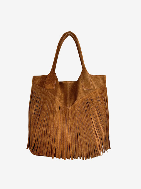 Zamszowy shopper w stylu boho z ozdobnymi frędzlami. Zapinanie na magnes. W środku zamszowa kosmetyczka na łańcuszku.
