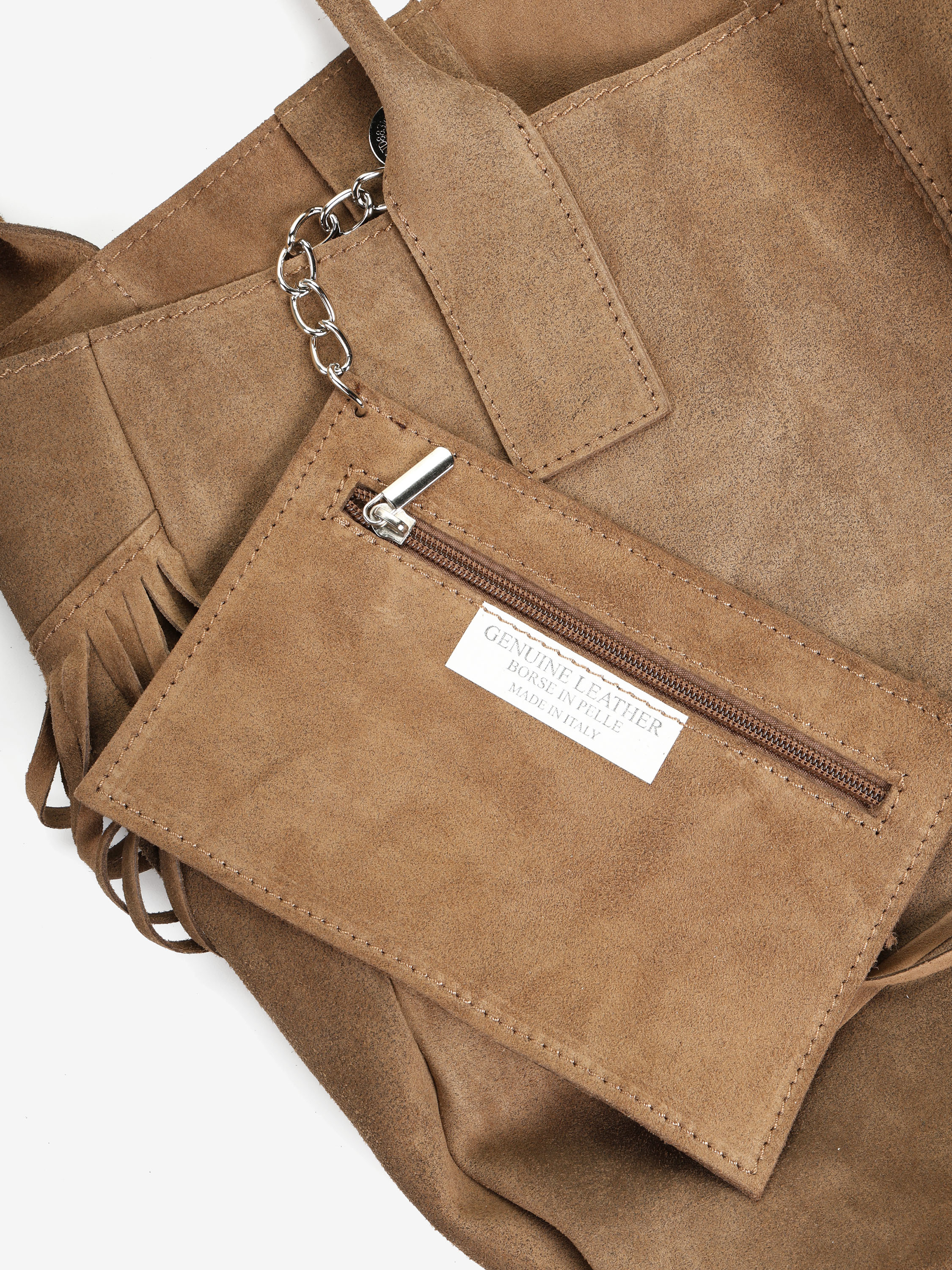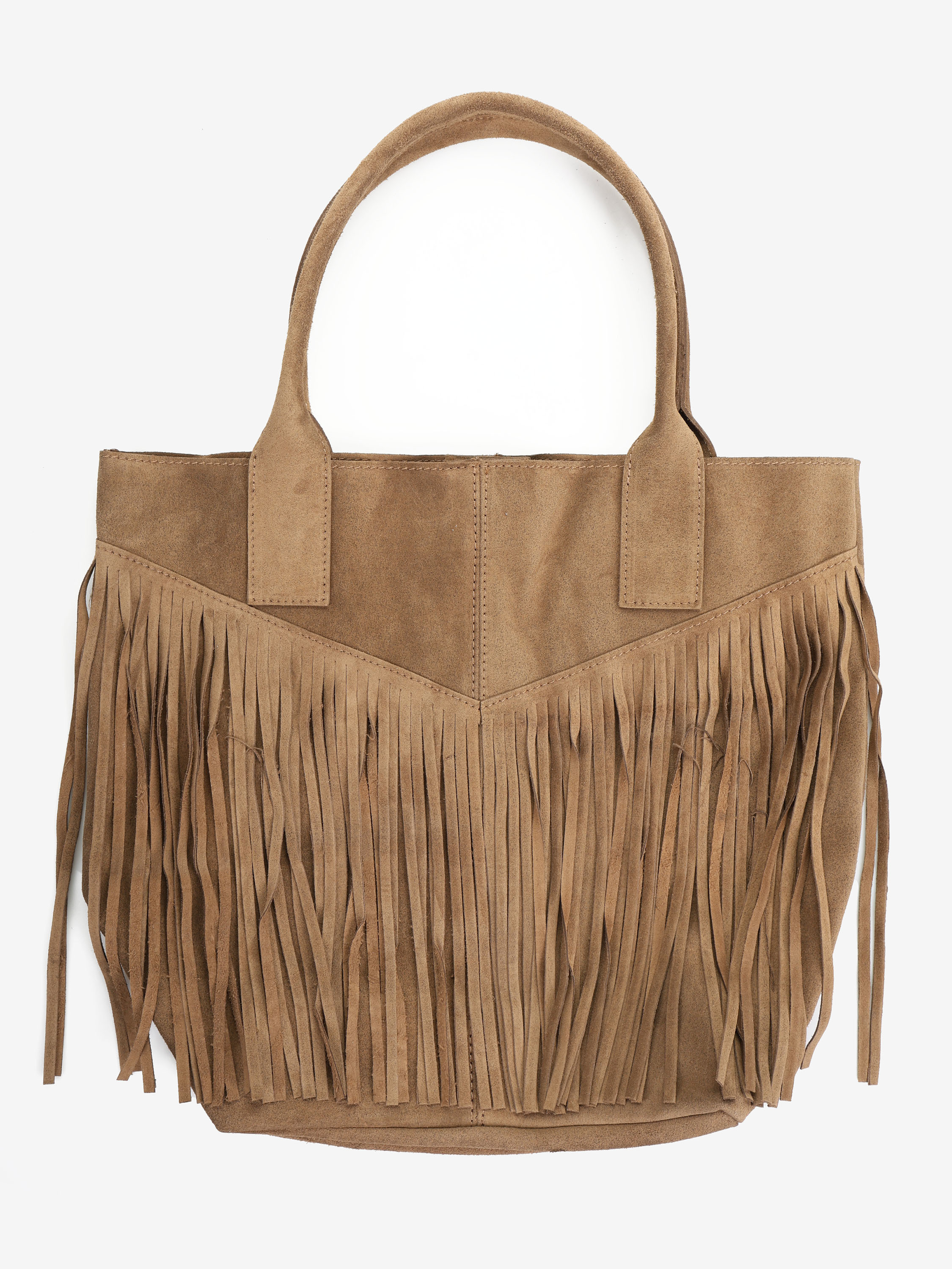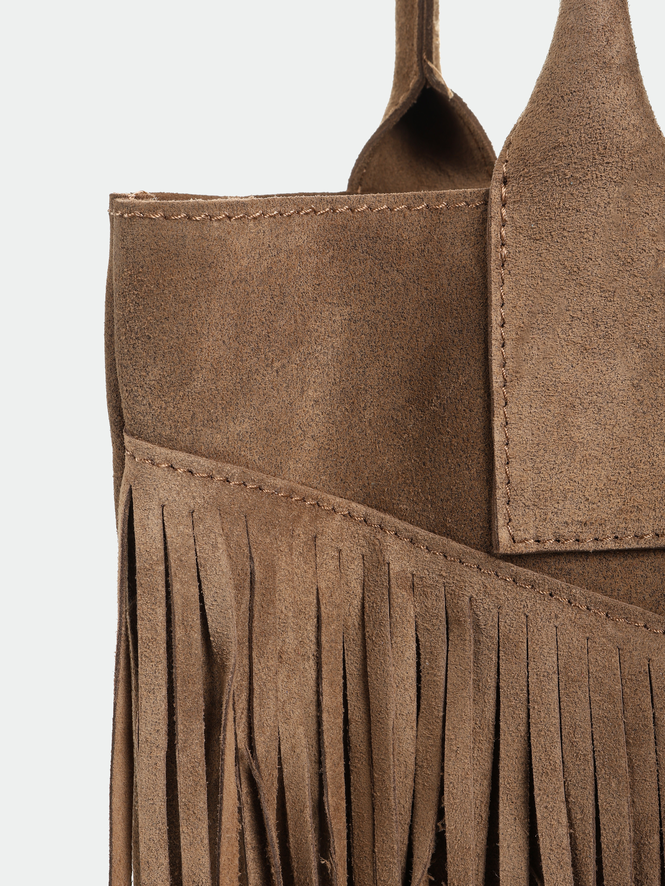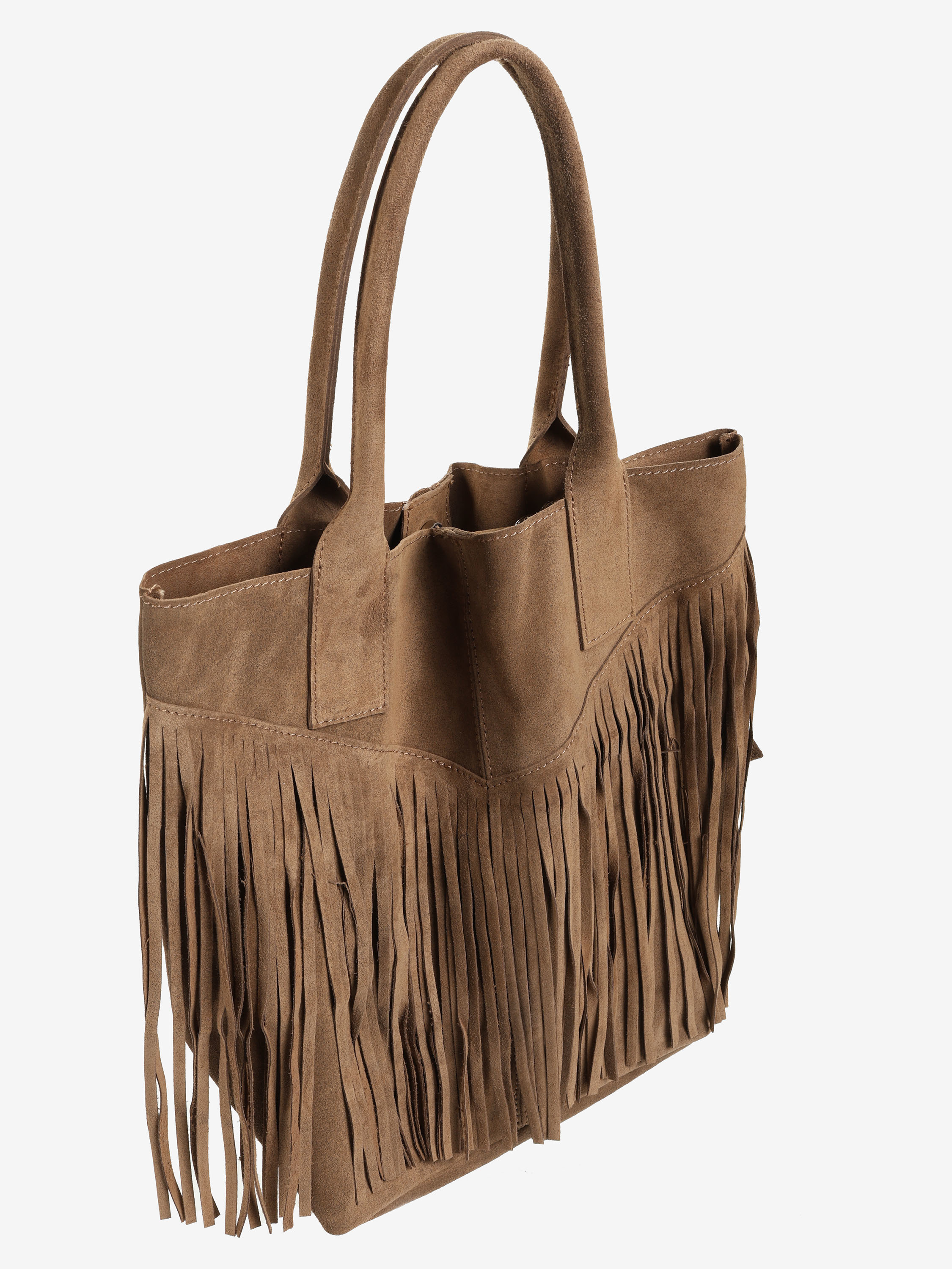 Zamszowy shopper w stylu boho z ozdobnymi frędzlami. Zapinanie na magnes. W środku zamszowa kosmetyczka na łańcuszku.