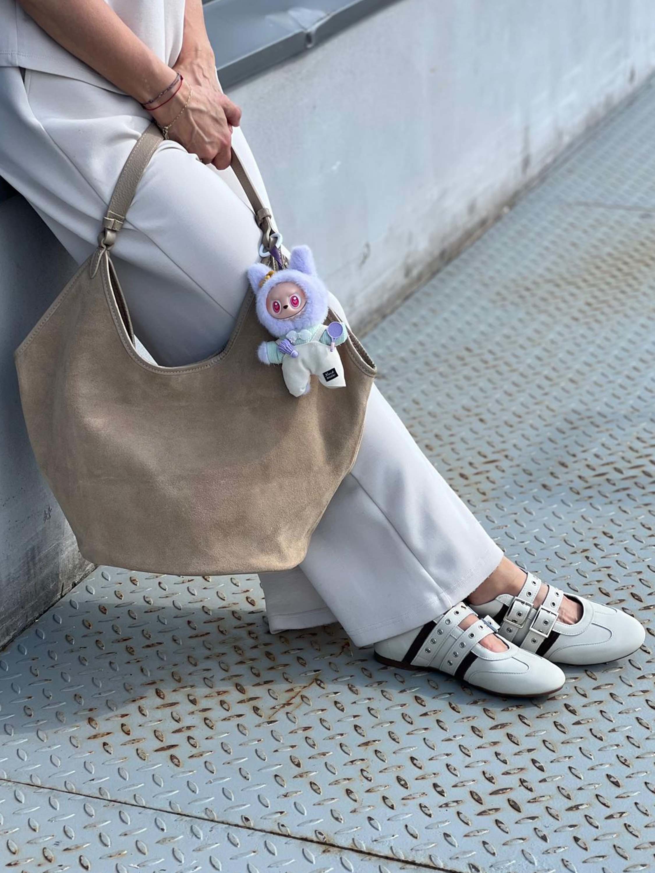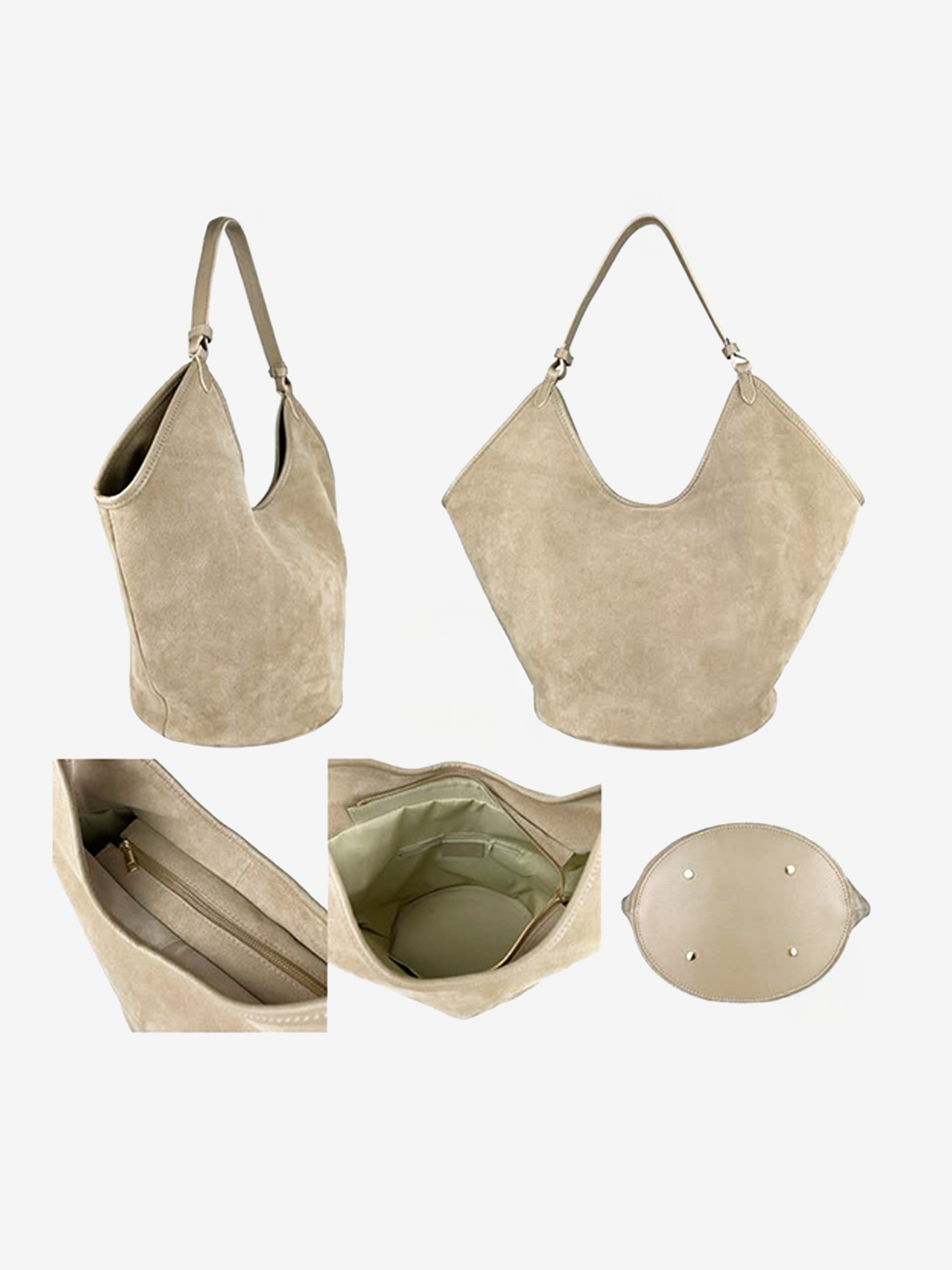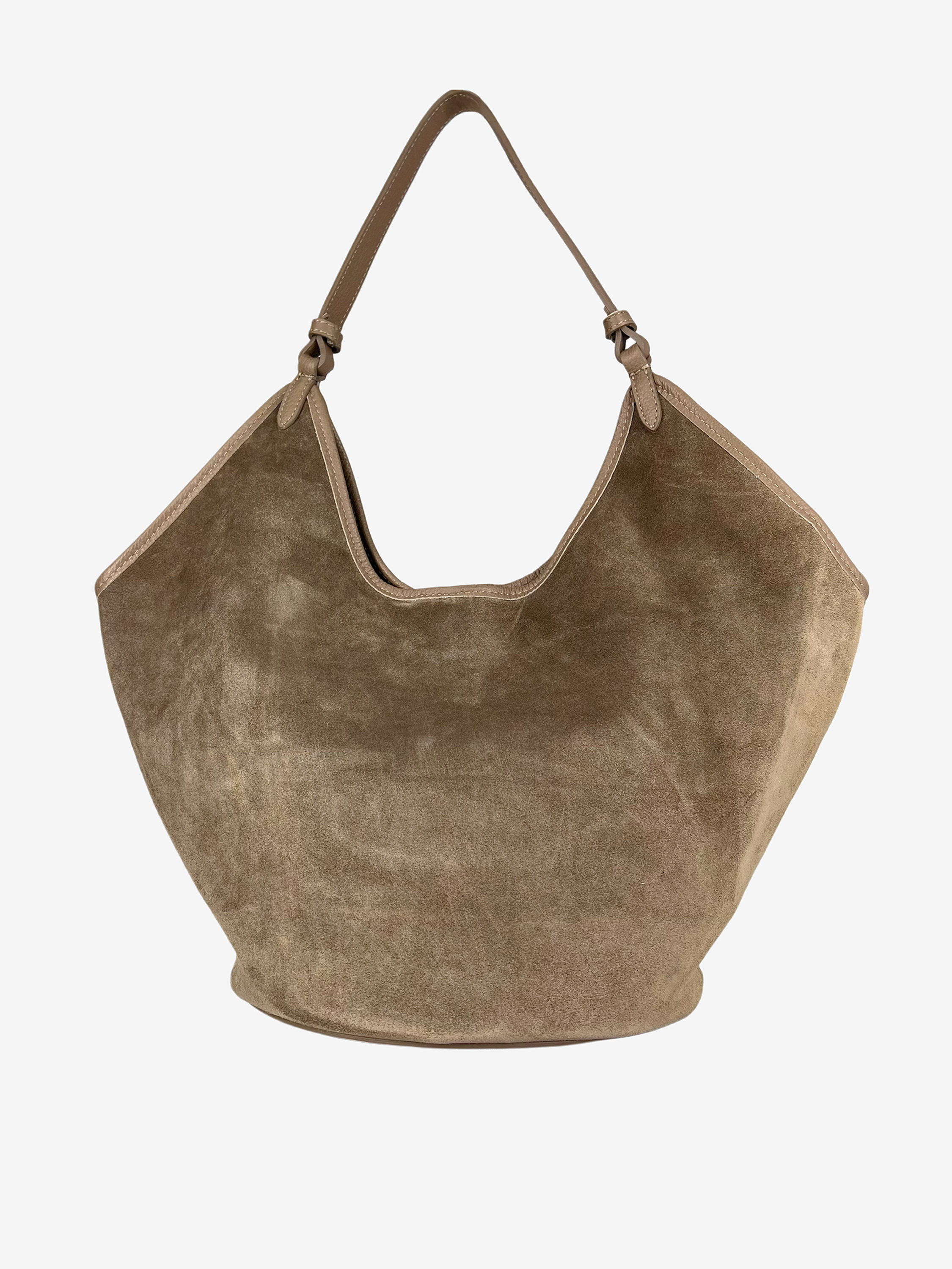 Zamszowa torba hobo zapinana na zamek. Lamówka, paski i spód torby wykonane ze skóry licowej.