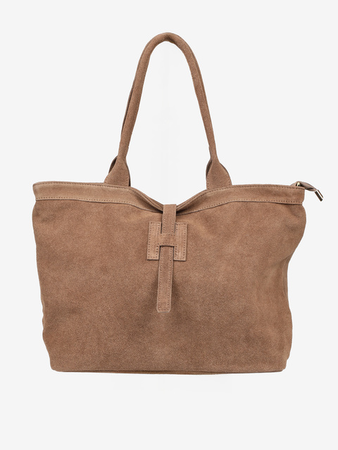 Zamszowy shopper z ozdobnym zapięciem w kształcie litery H - jak HEGO'S MILANO. Dzięki wewnętrznemu haczykowi torba może być noszona na dwa sposoby, zmieniając swój kształt. Dodatkowe zapięcie na suwak i wewnętrzna kieszonka.