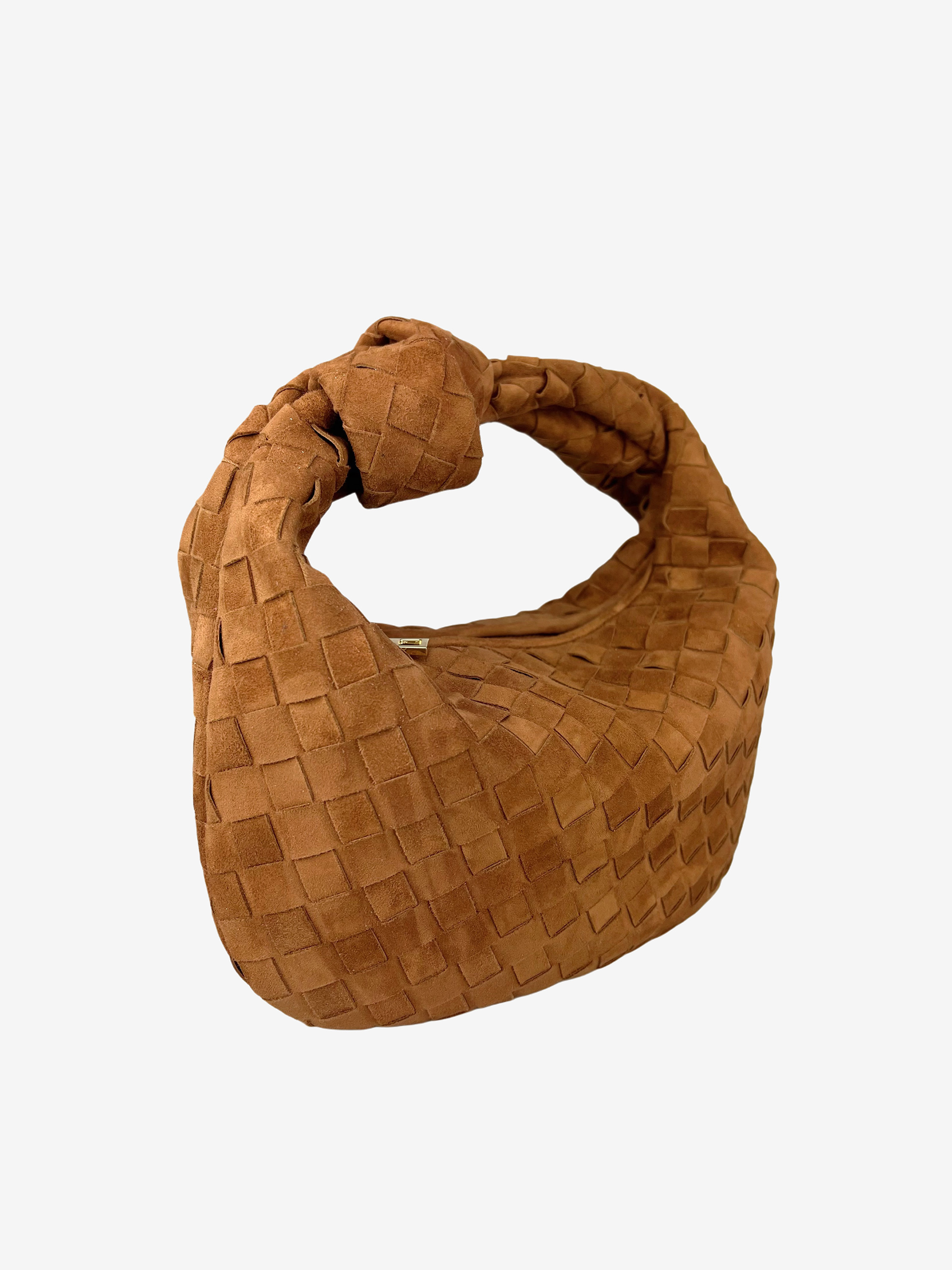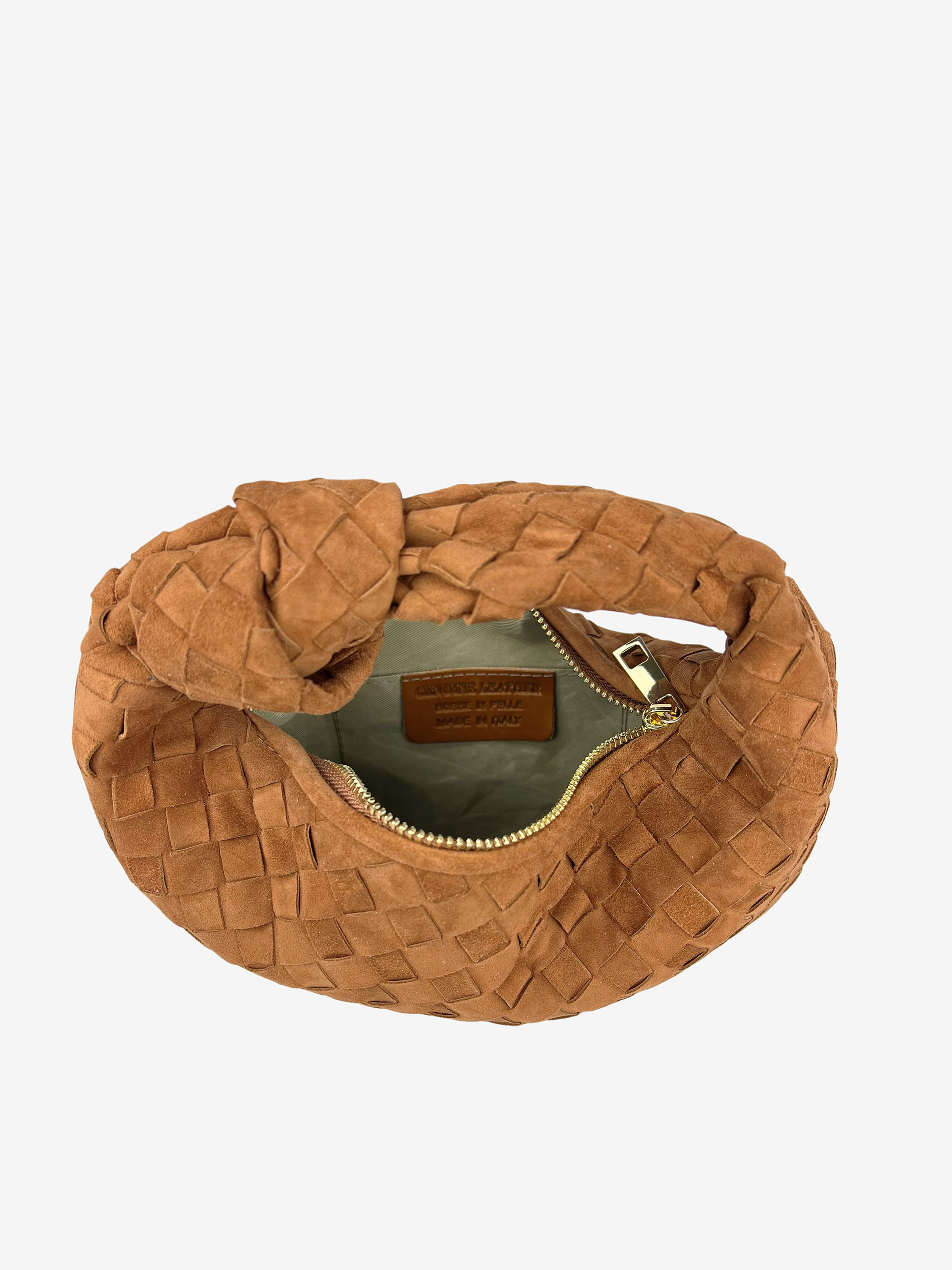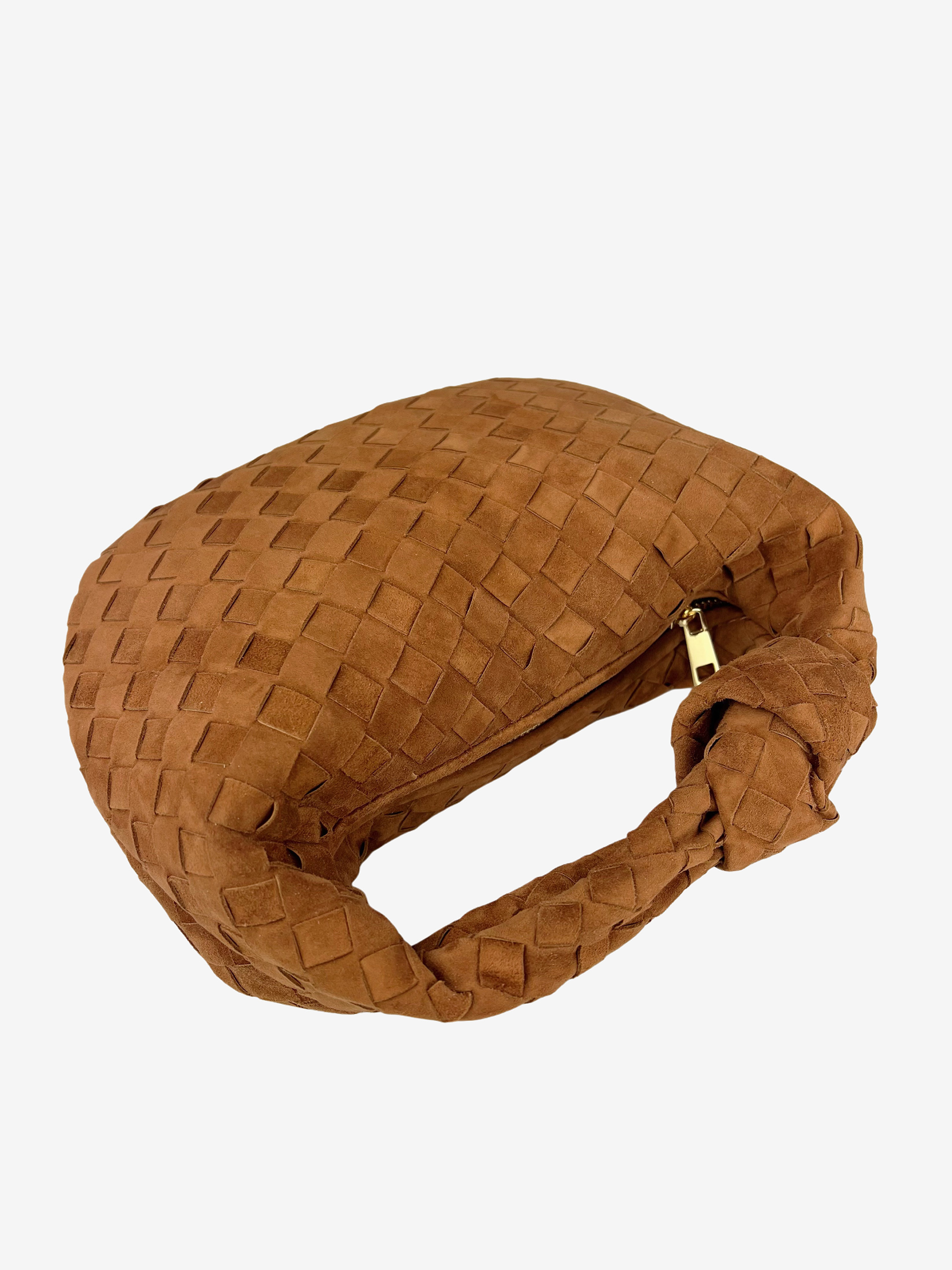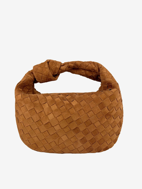 Mała torebka do ręki wykonana z zamszowej plecionki, zapinana na suwak. Ozdobny węzeł na pasku. W środku mała kieszonka.