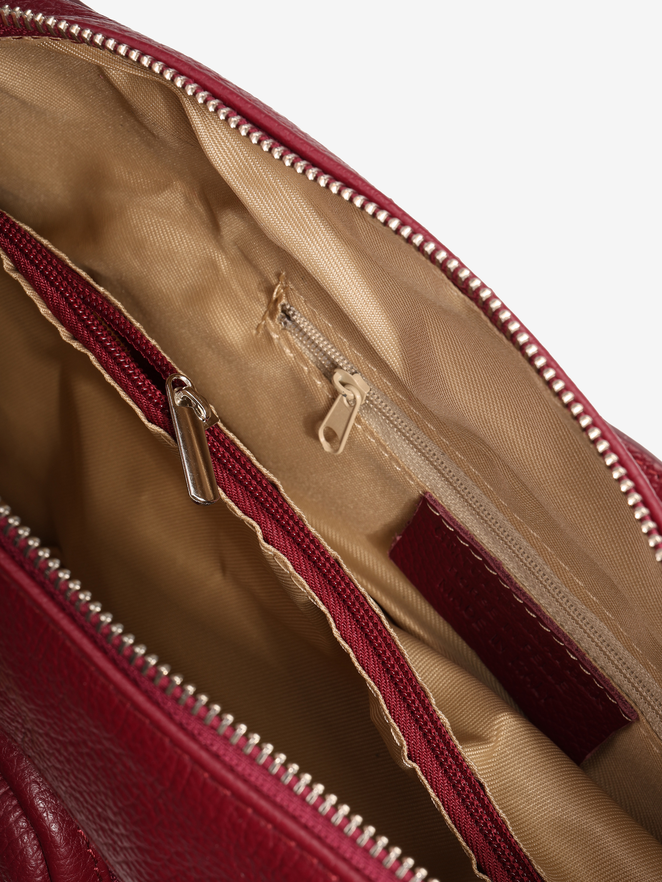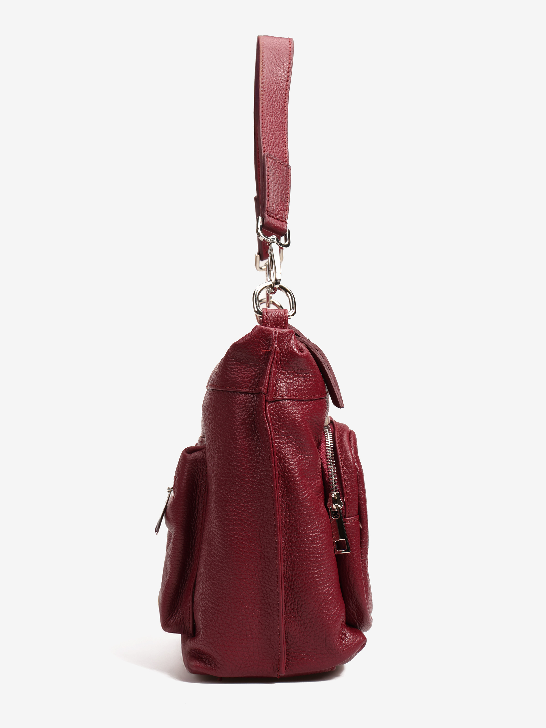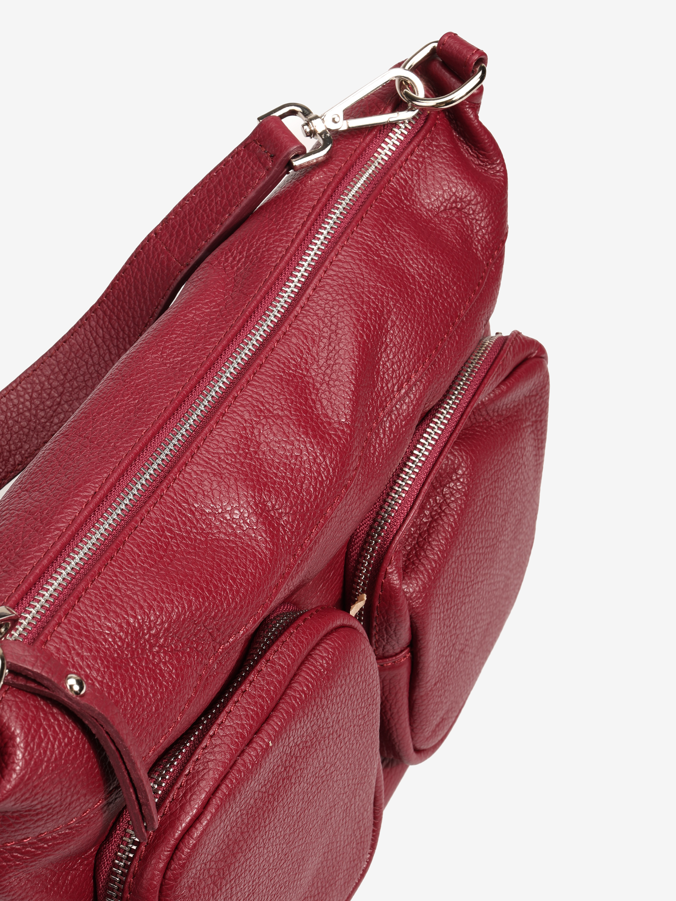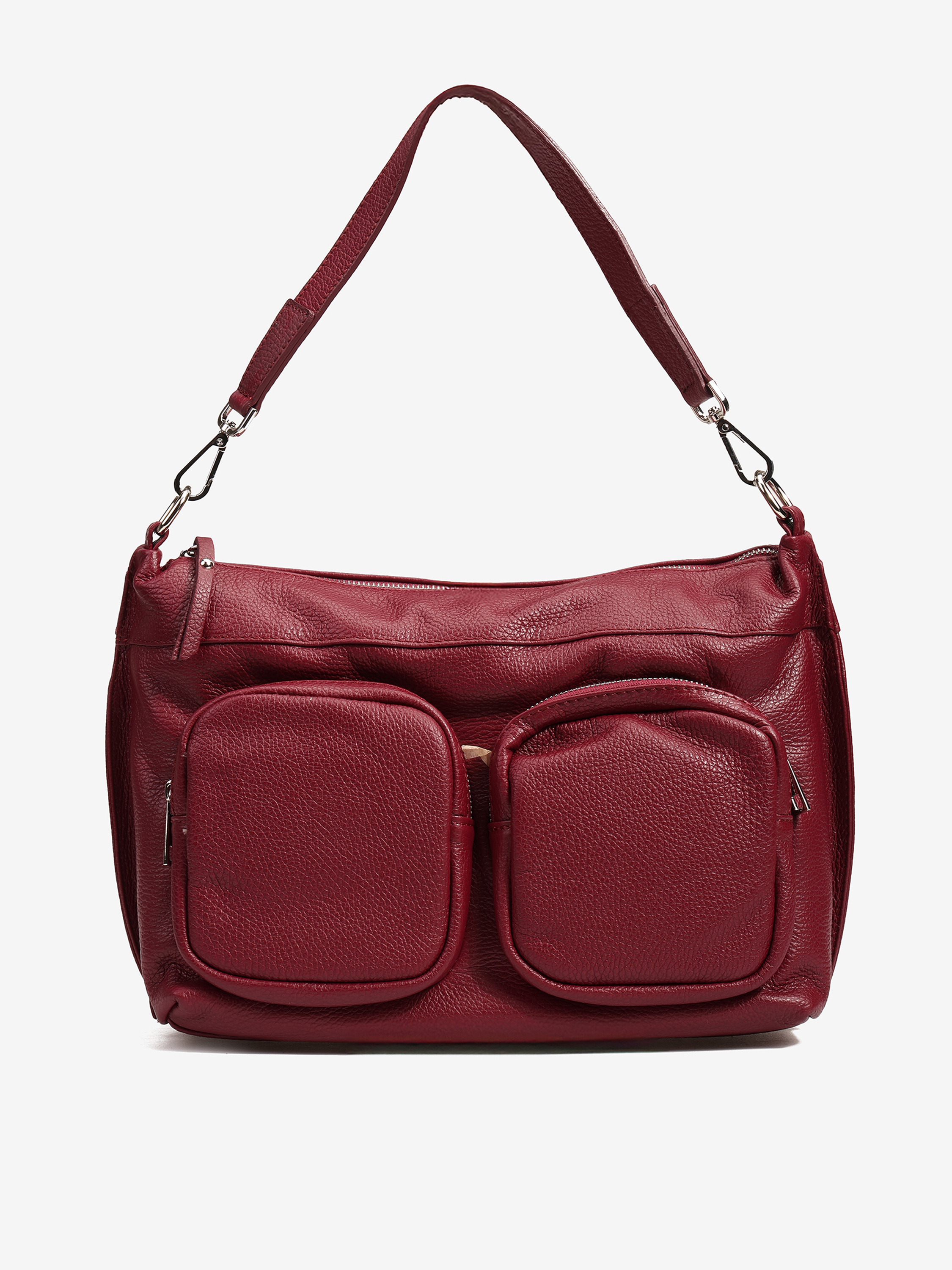 Praktyczna, skórzana torebka z kieszonkami zapinanymi na suwak i wewnętrznymi przegródkami. Dodatkowy, regulowany pasek.