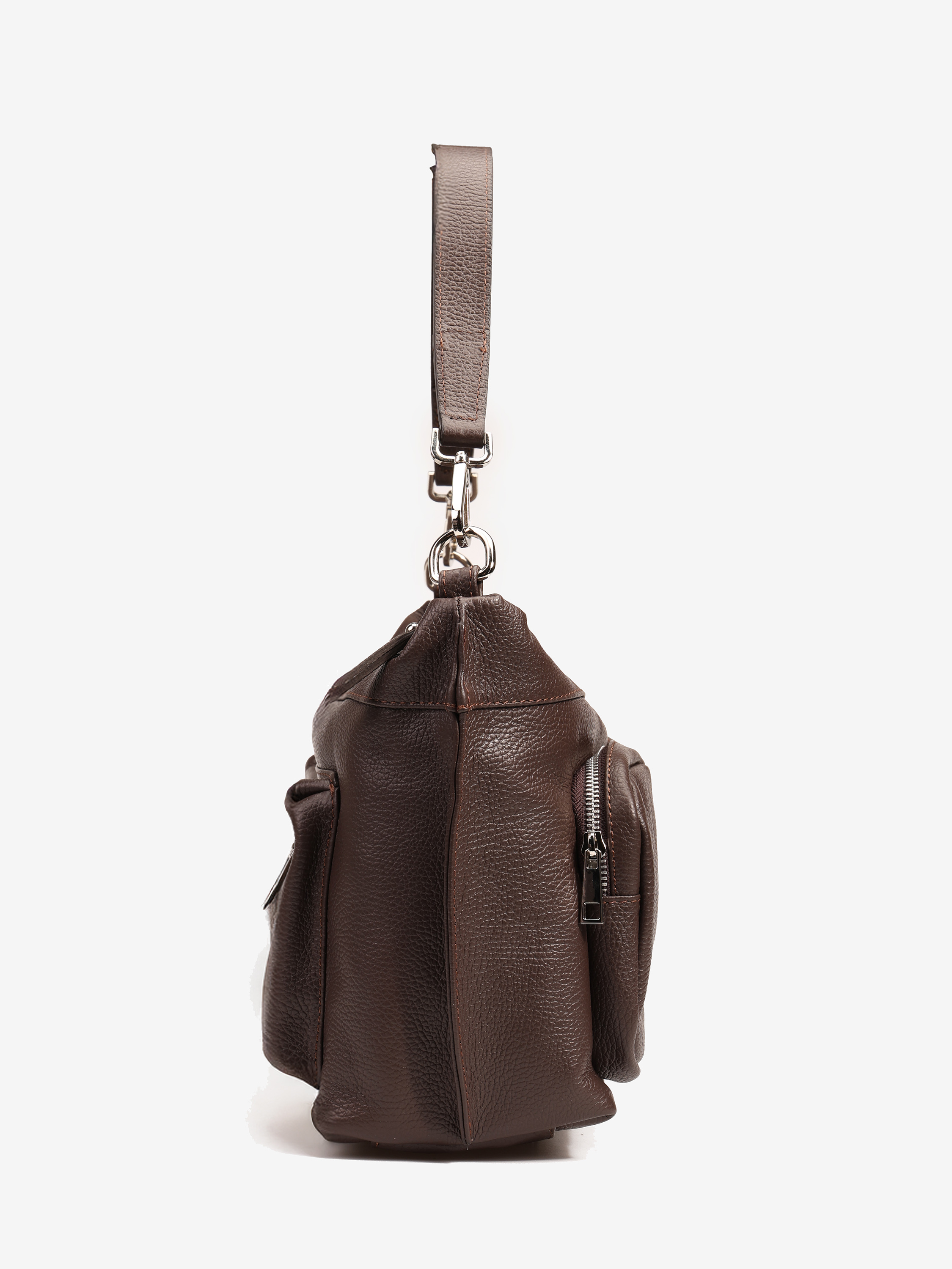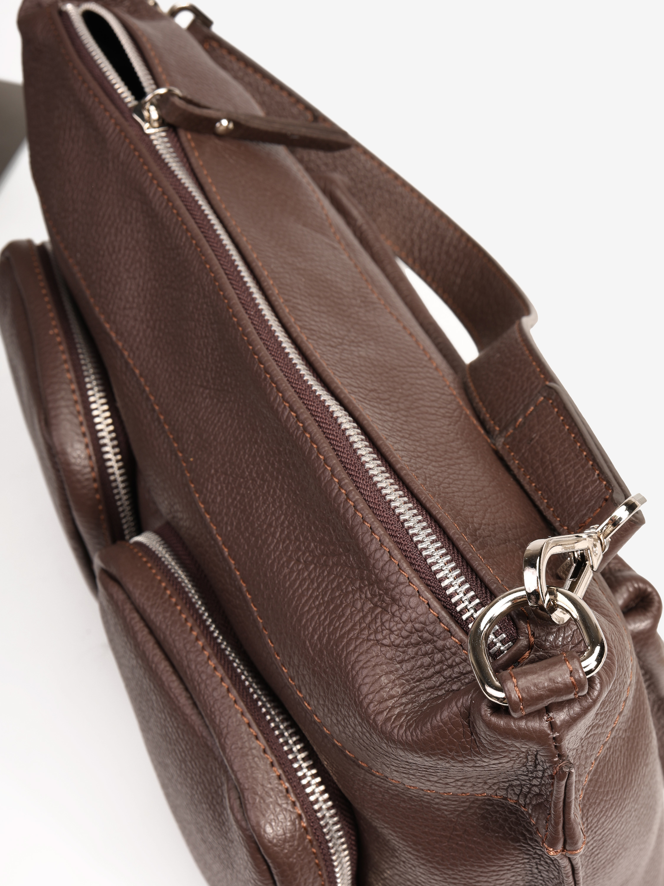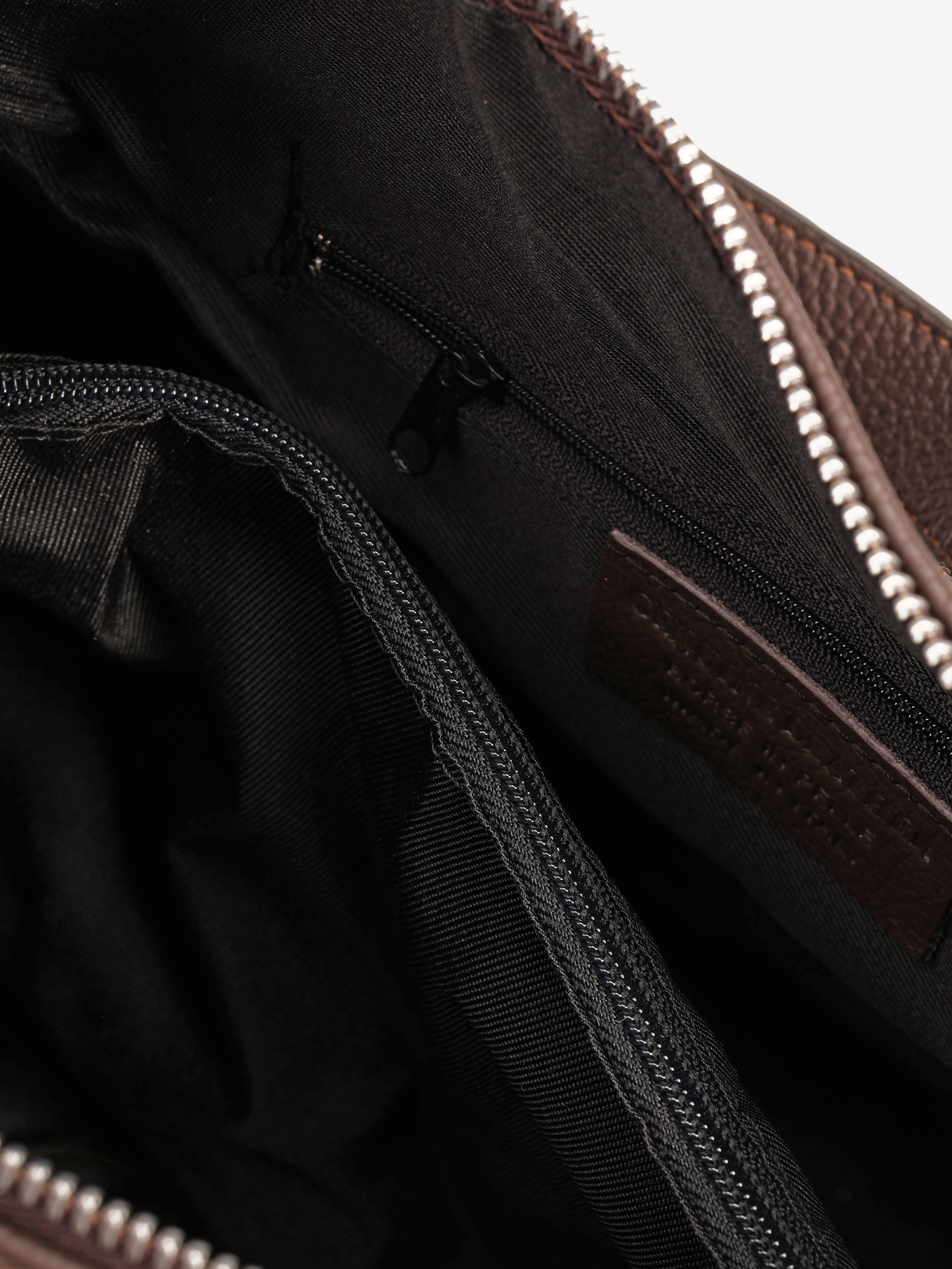 Praktyczna, skórzana torebka z kieszonkami zapinanymi na suwak i wewnętrznymi przegródkami. Dodatkowy, regulowany pasek.
