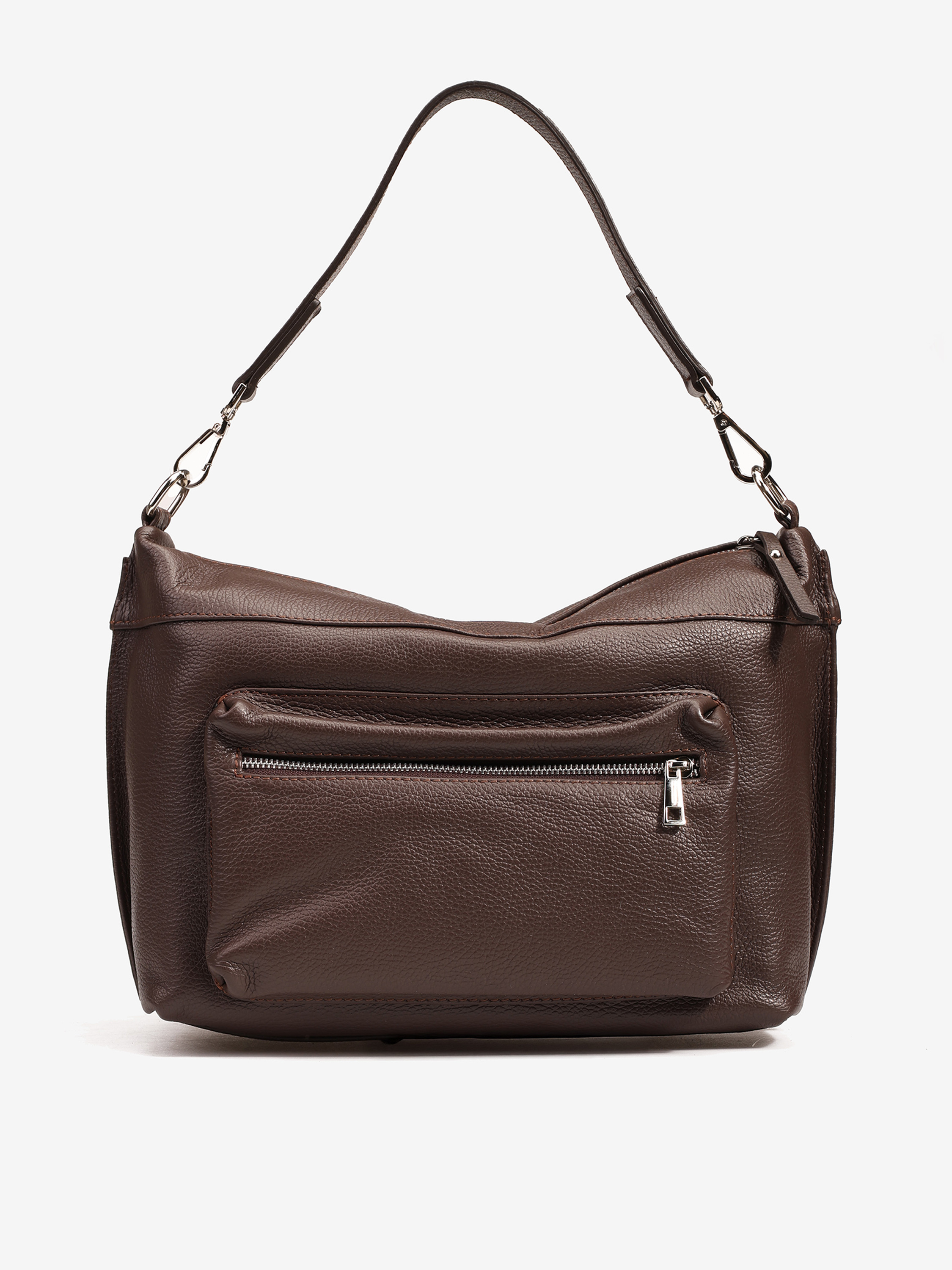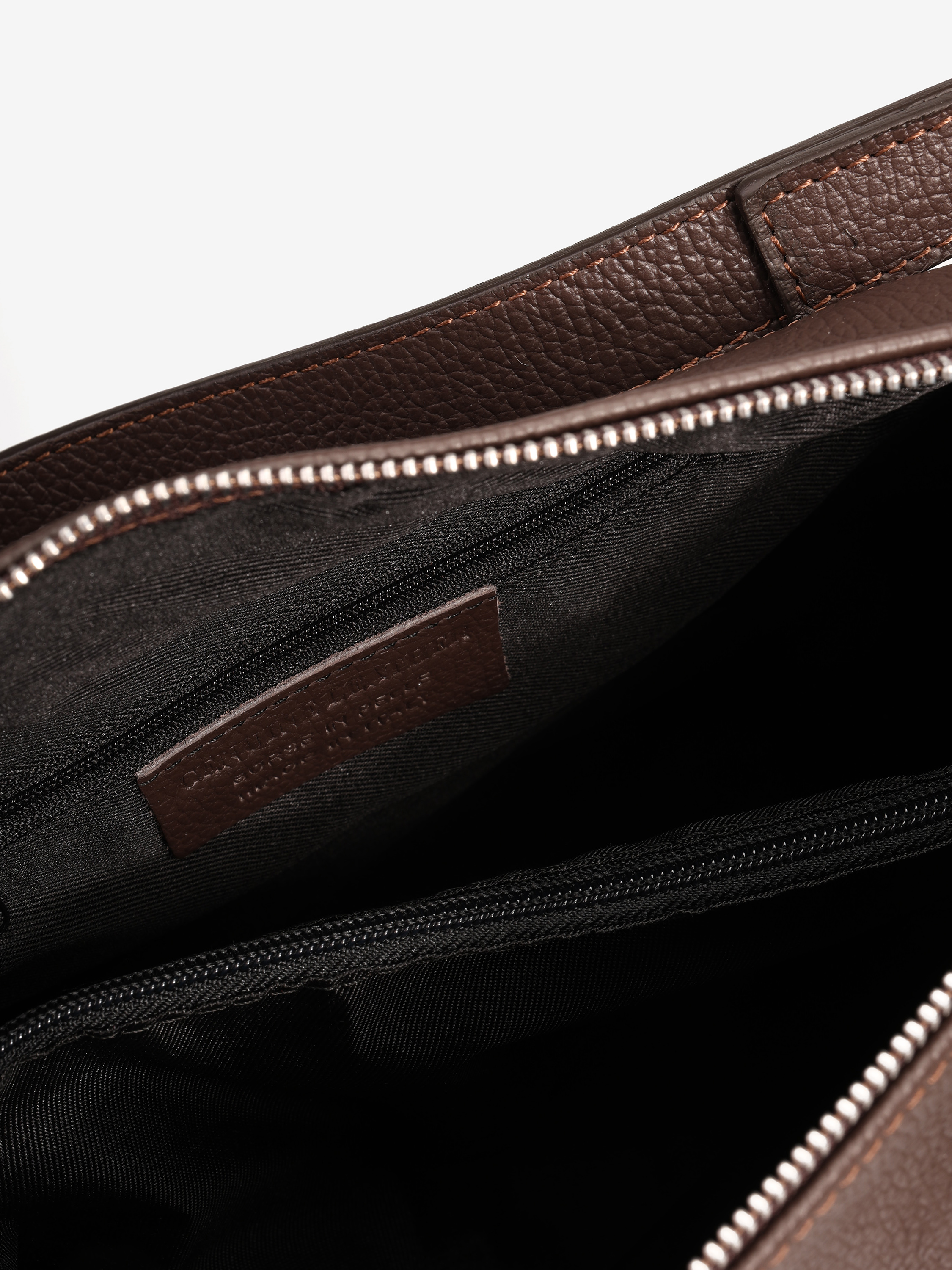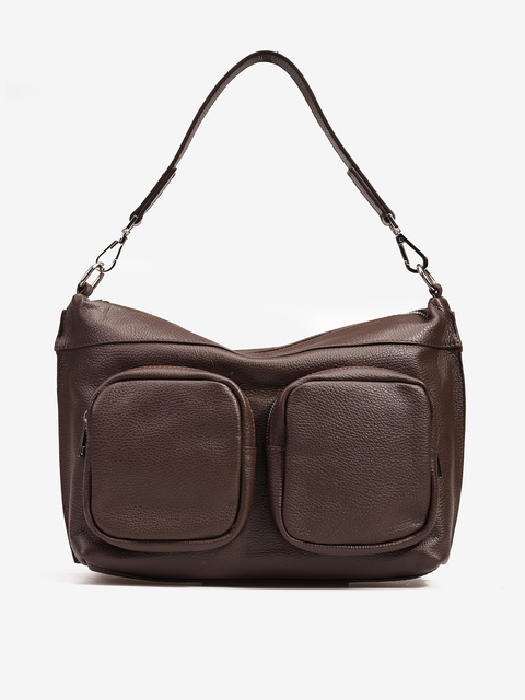 Praktyczna, skórzana torebka z kieszonkami zapinanymi na suwak i wewnętrznymi przegródkami. Dodatkowy, regulowany pasek.