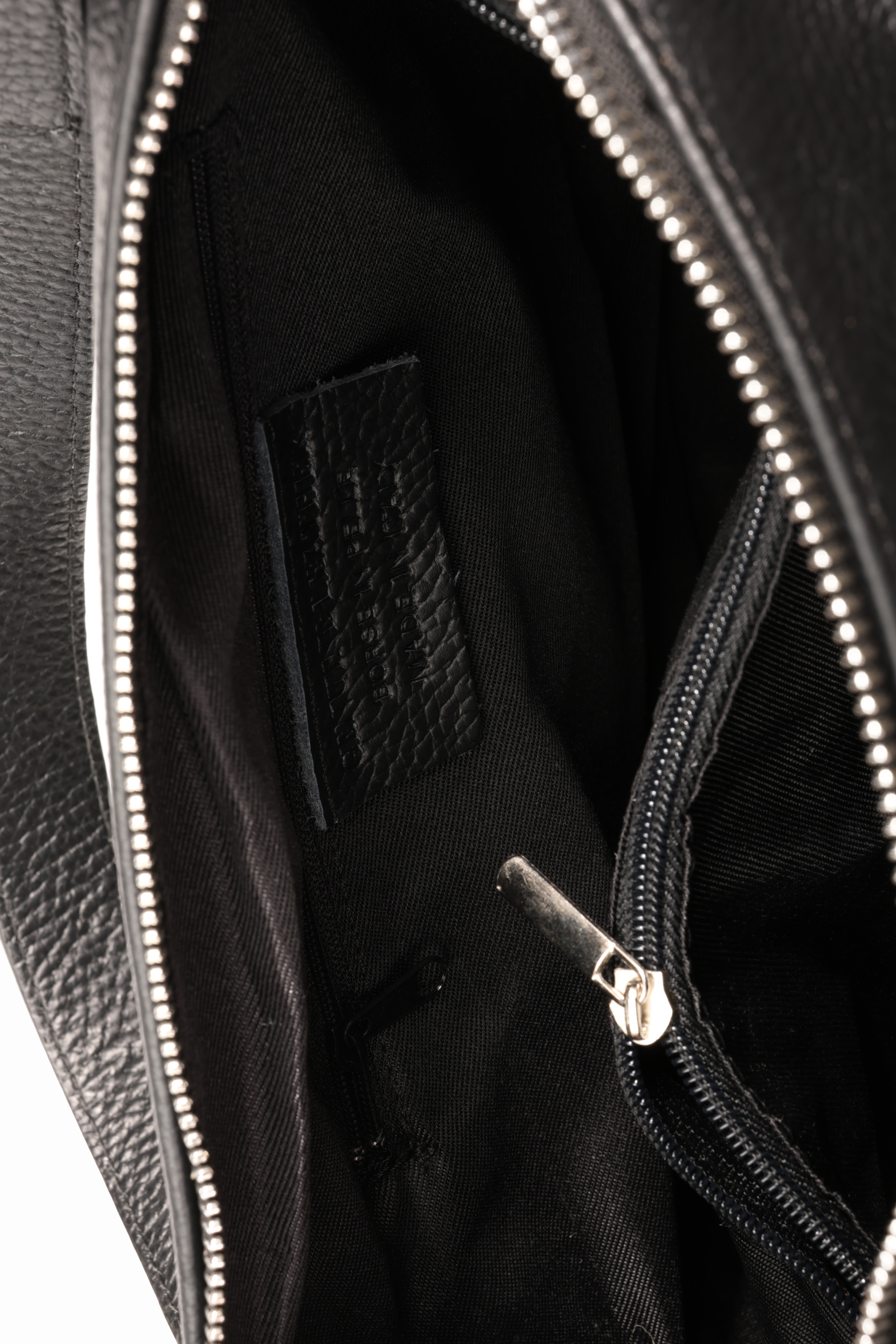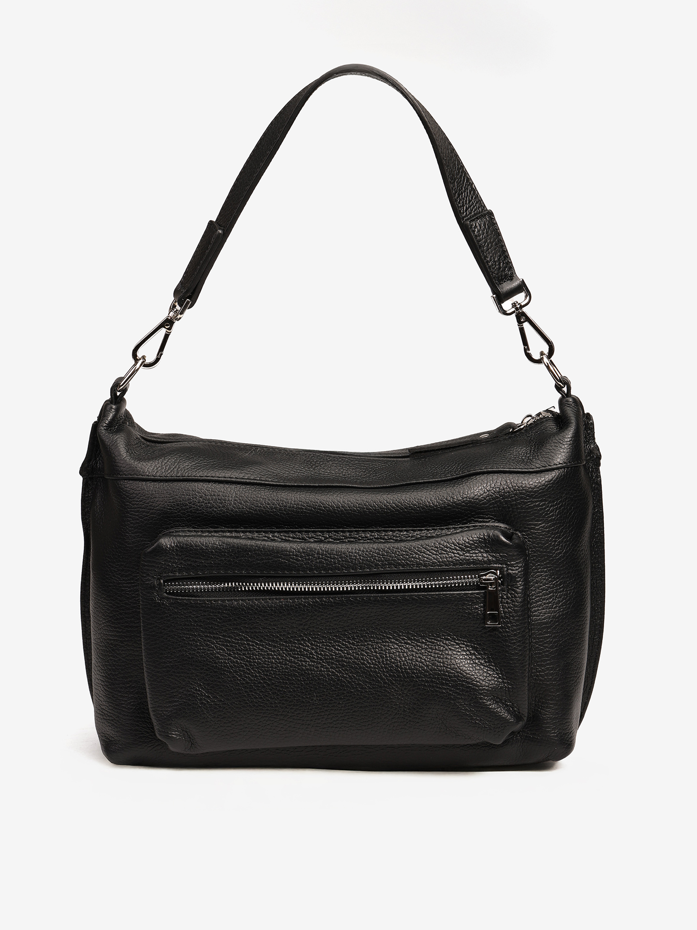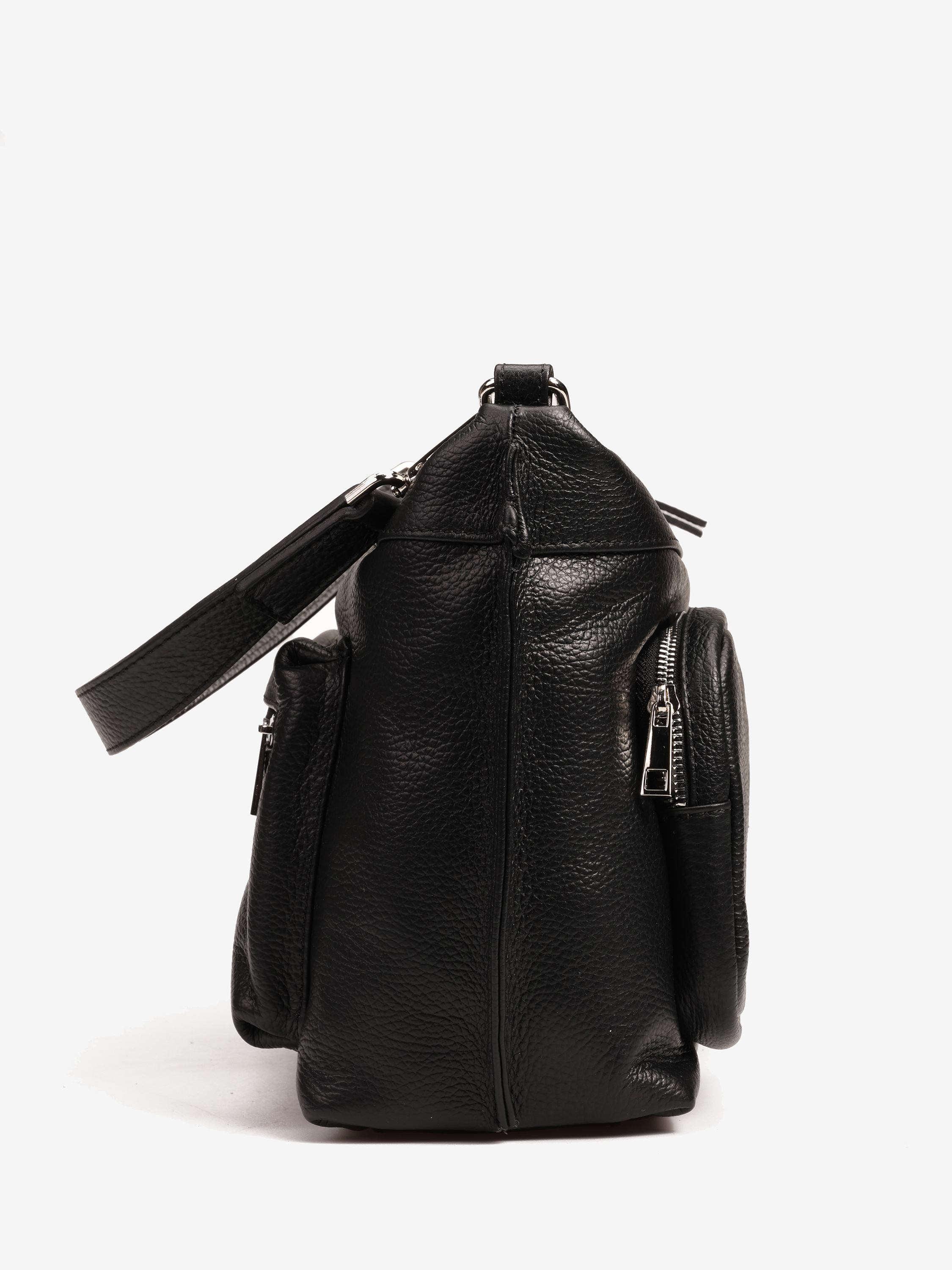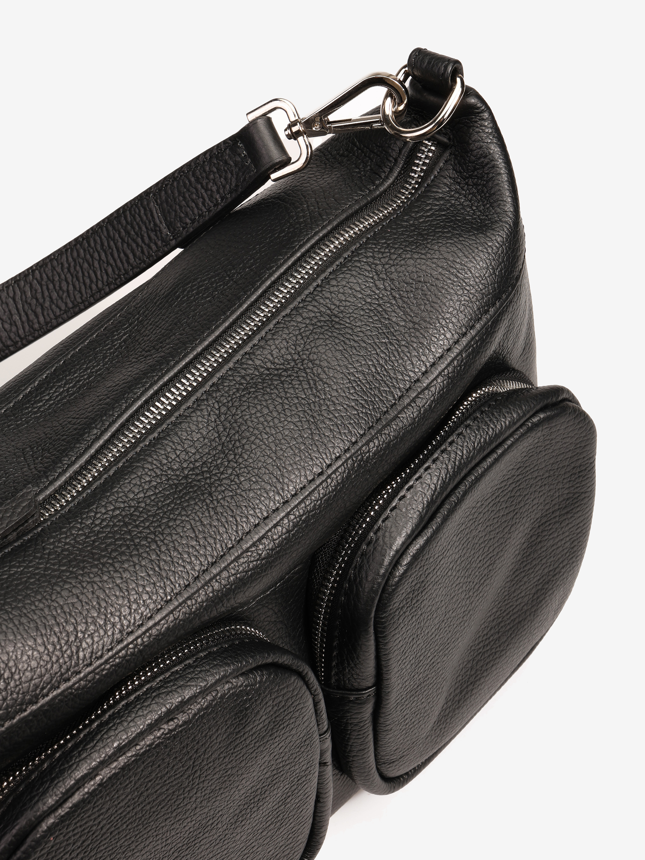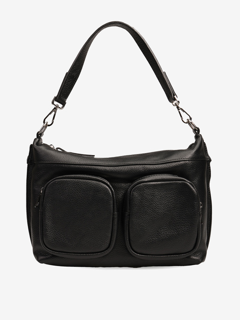 Praktyczna, skórzana torebka z kieszonkami zapinanymi na suwak i wewnętrznymi przegródkami. Dodatkowy, regulowany pasek.