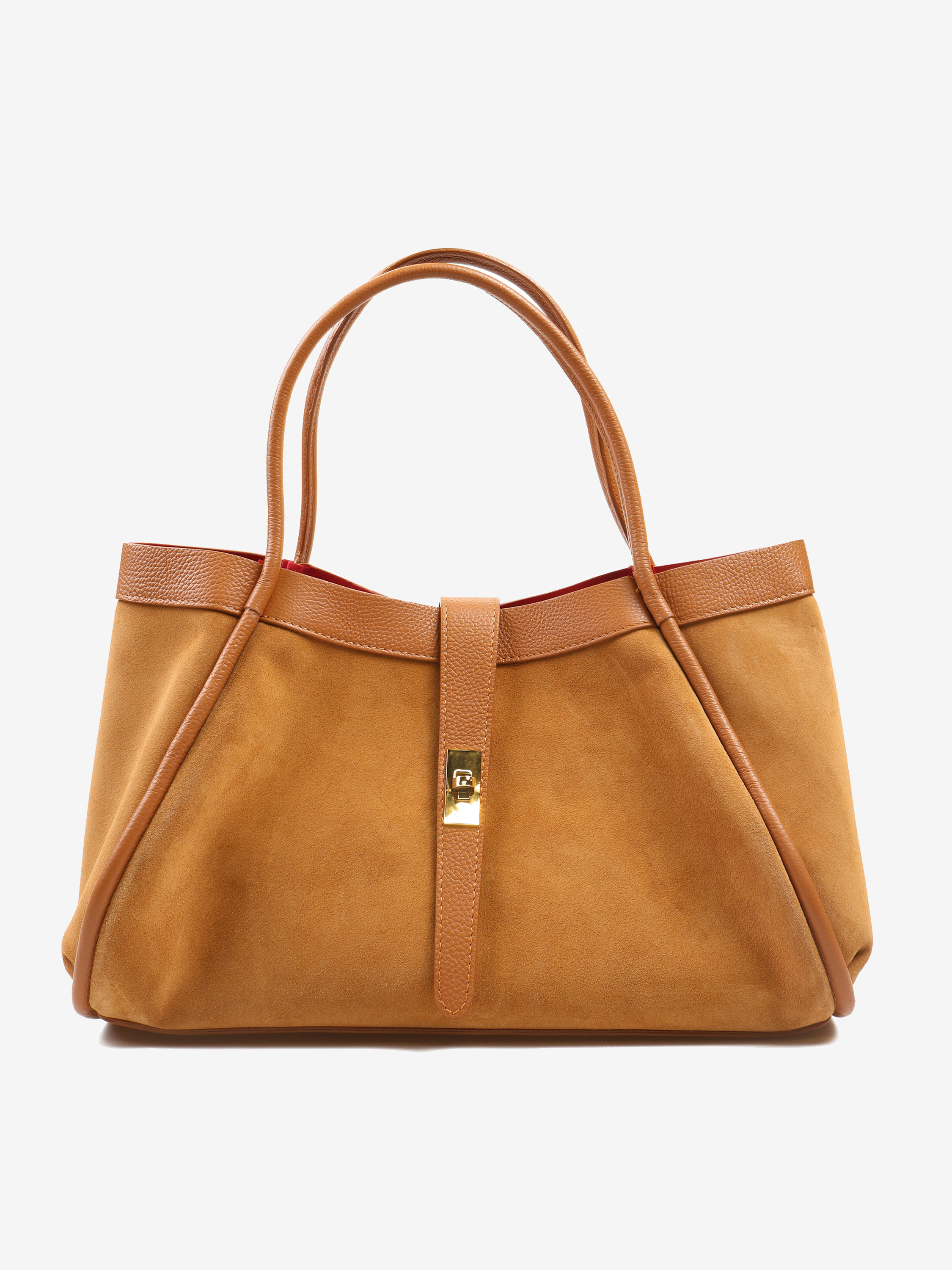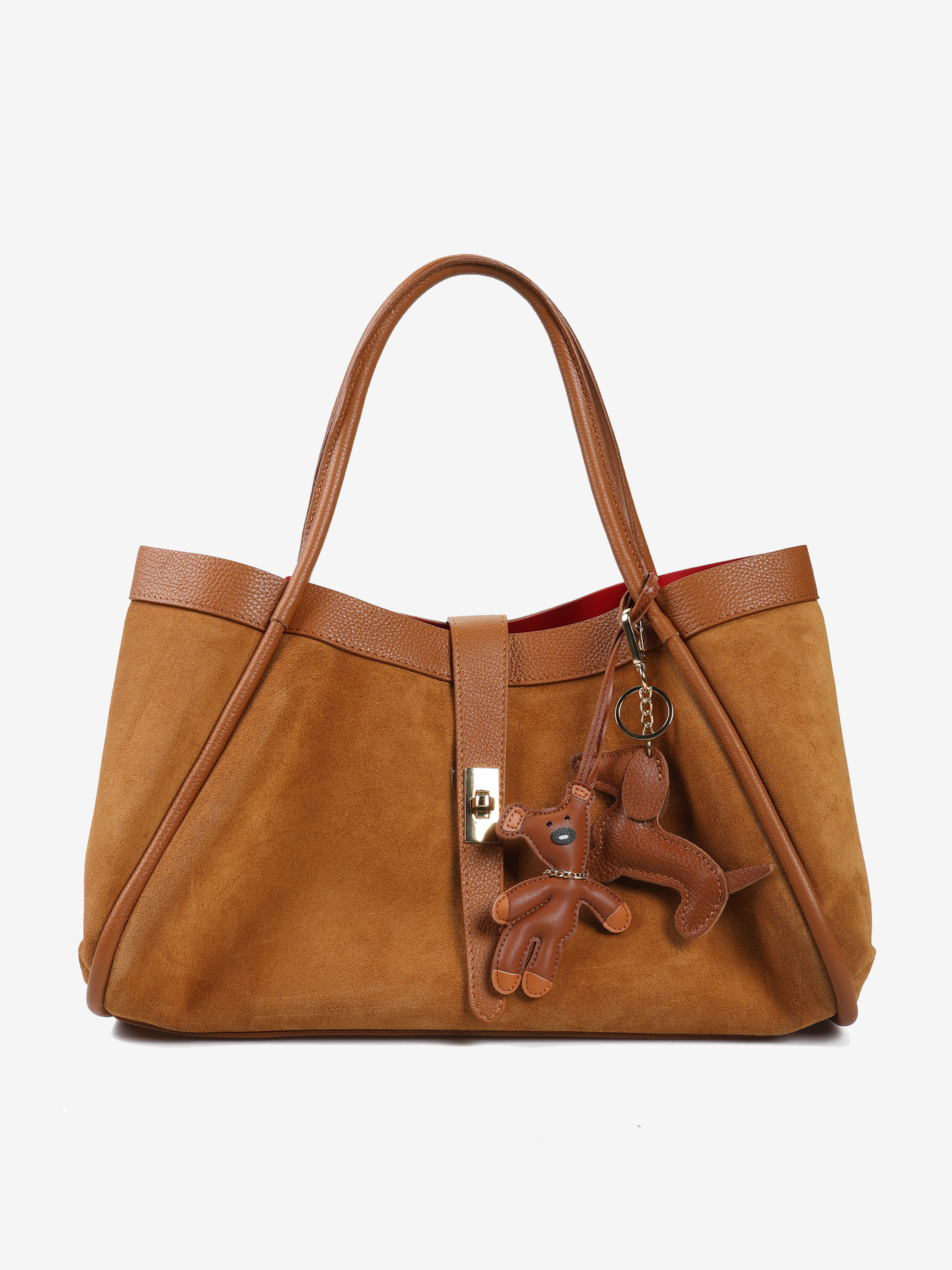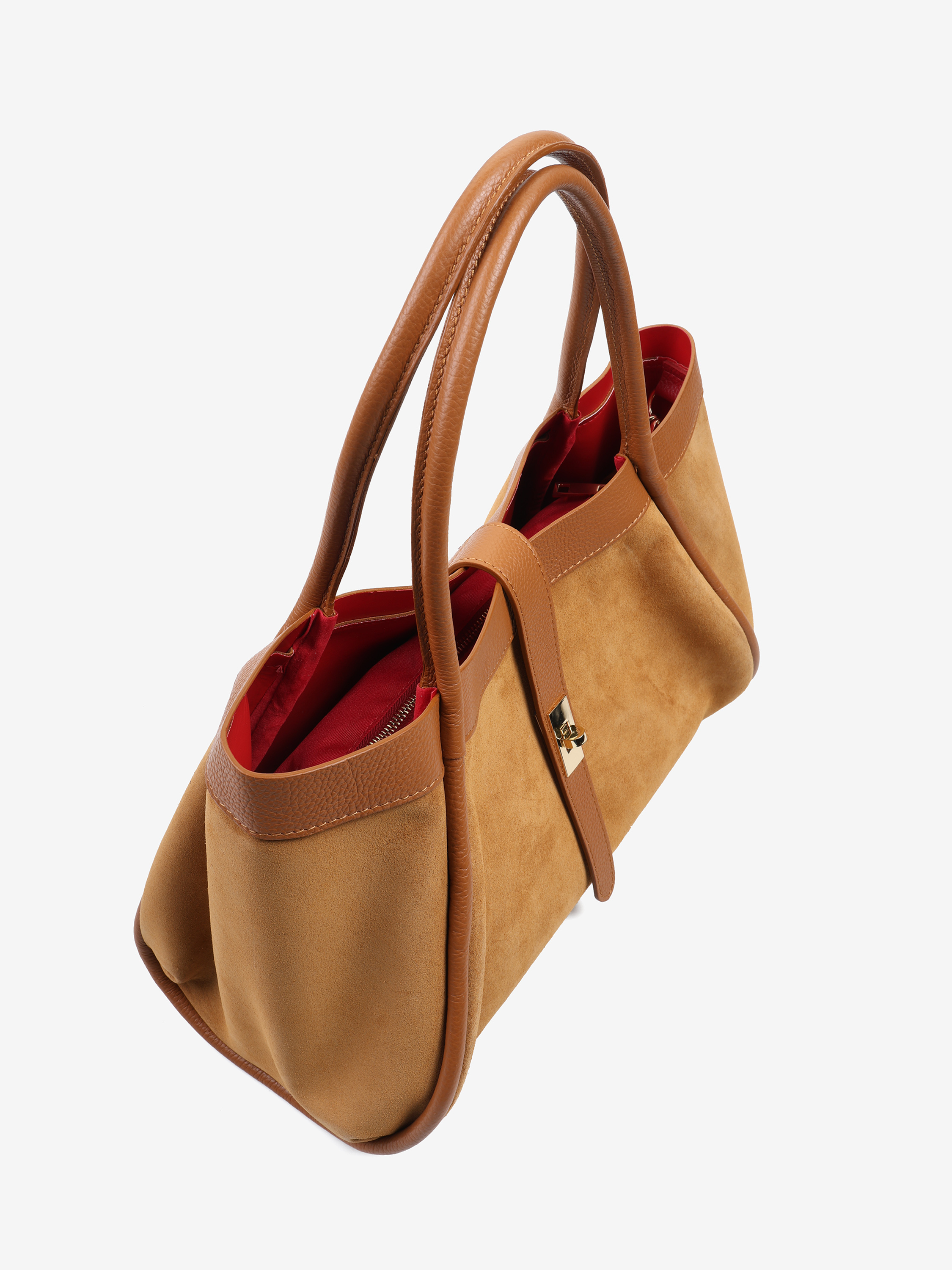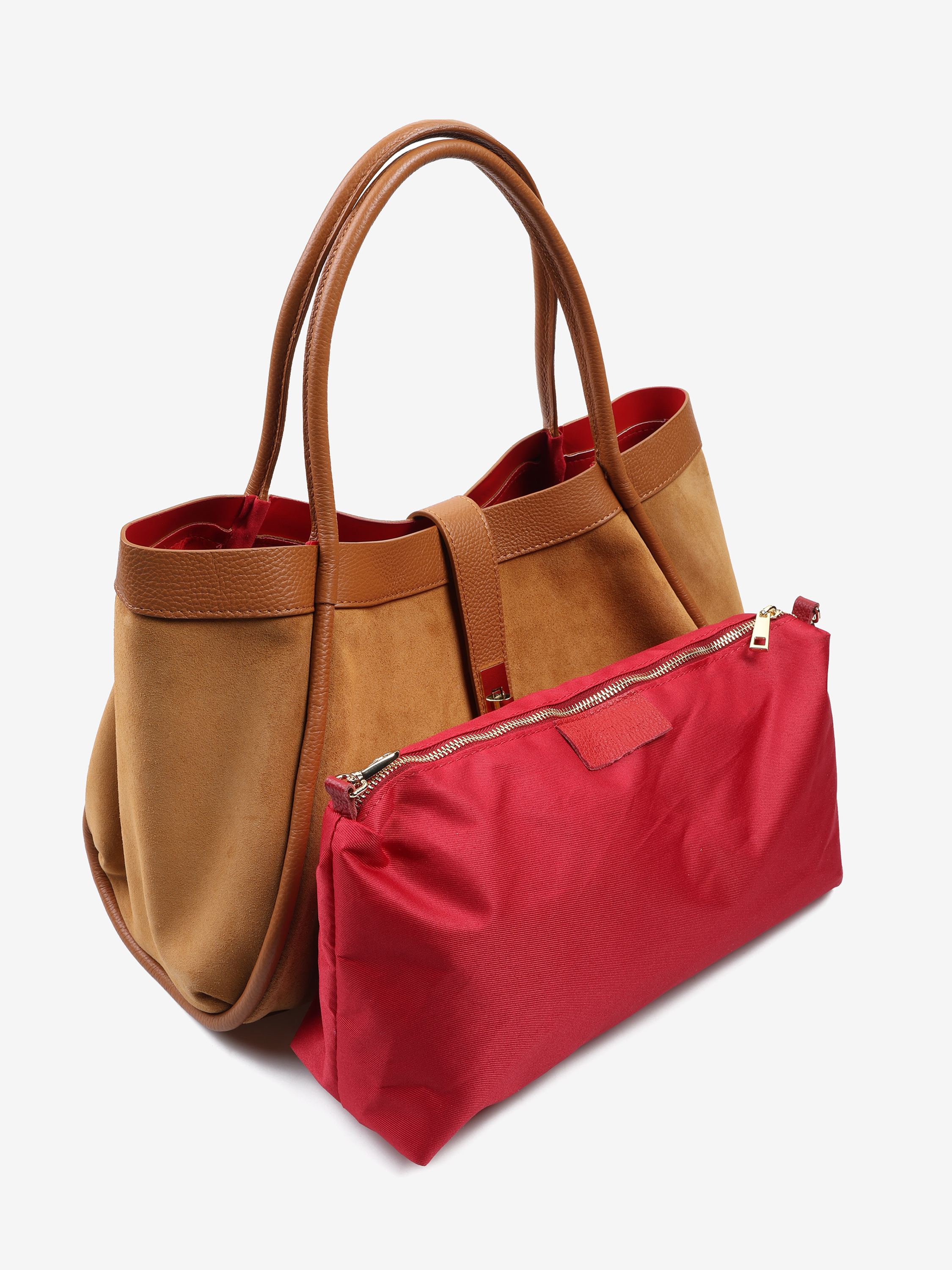 Elegancka torebka wykonana z wysokiej jakości zamszu z elementami skóry licowej. Wewnątrz znajduje się wyjmowana kosmetyczka, a dzięki łańcuszkowi można zmienić kształt torebki. Czerwone wnętrze dodaje jej wyjątkowego charakteru, a pojemność zapewnia komfort użytkowania na co dzień.