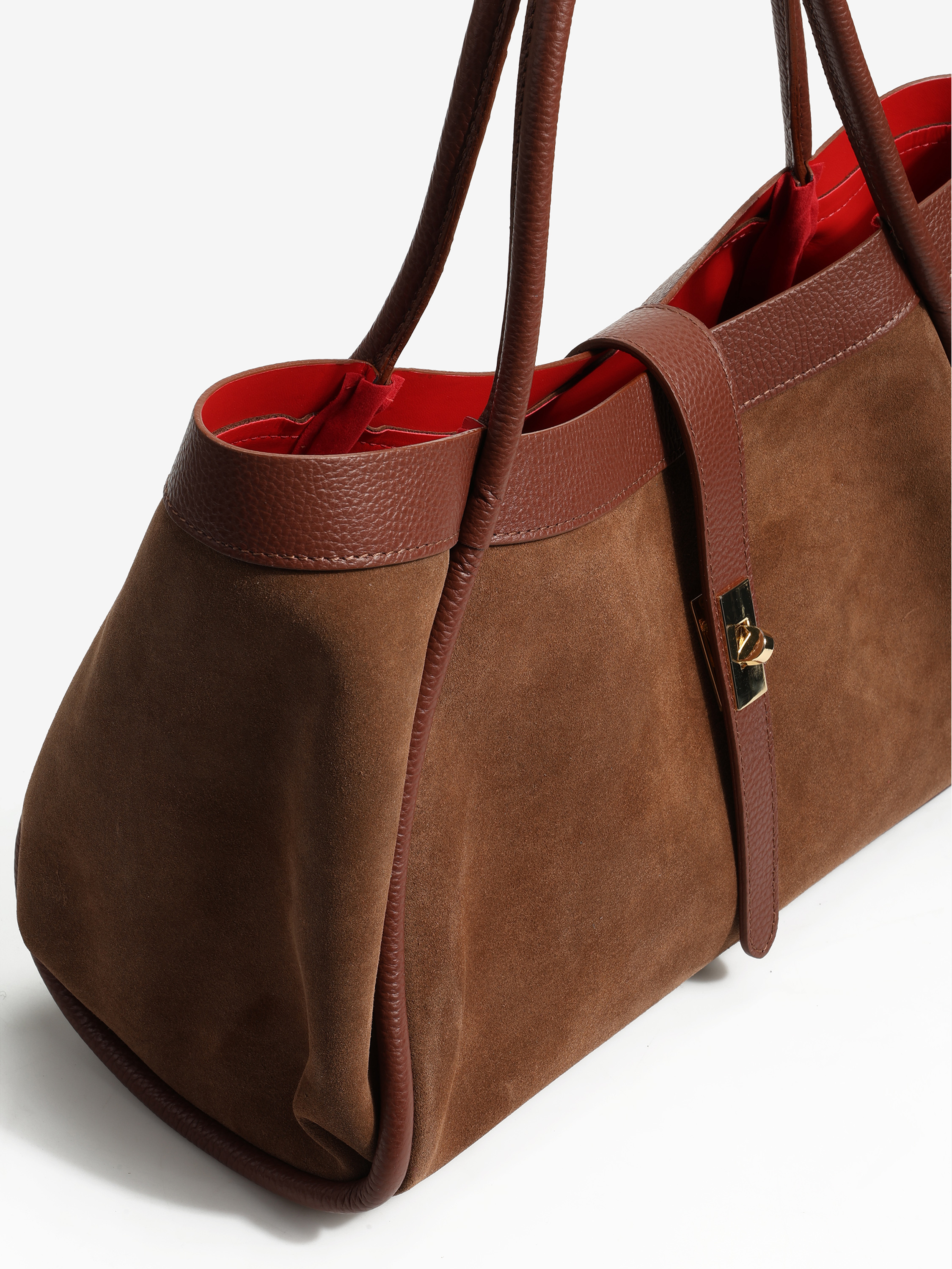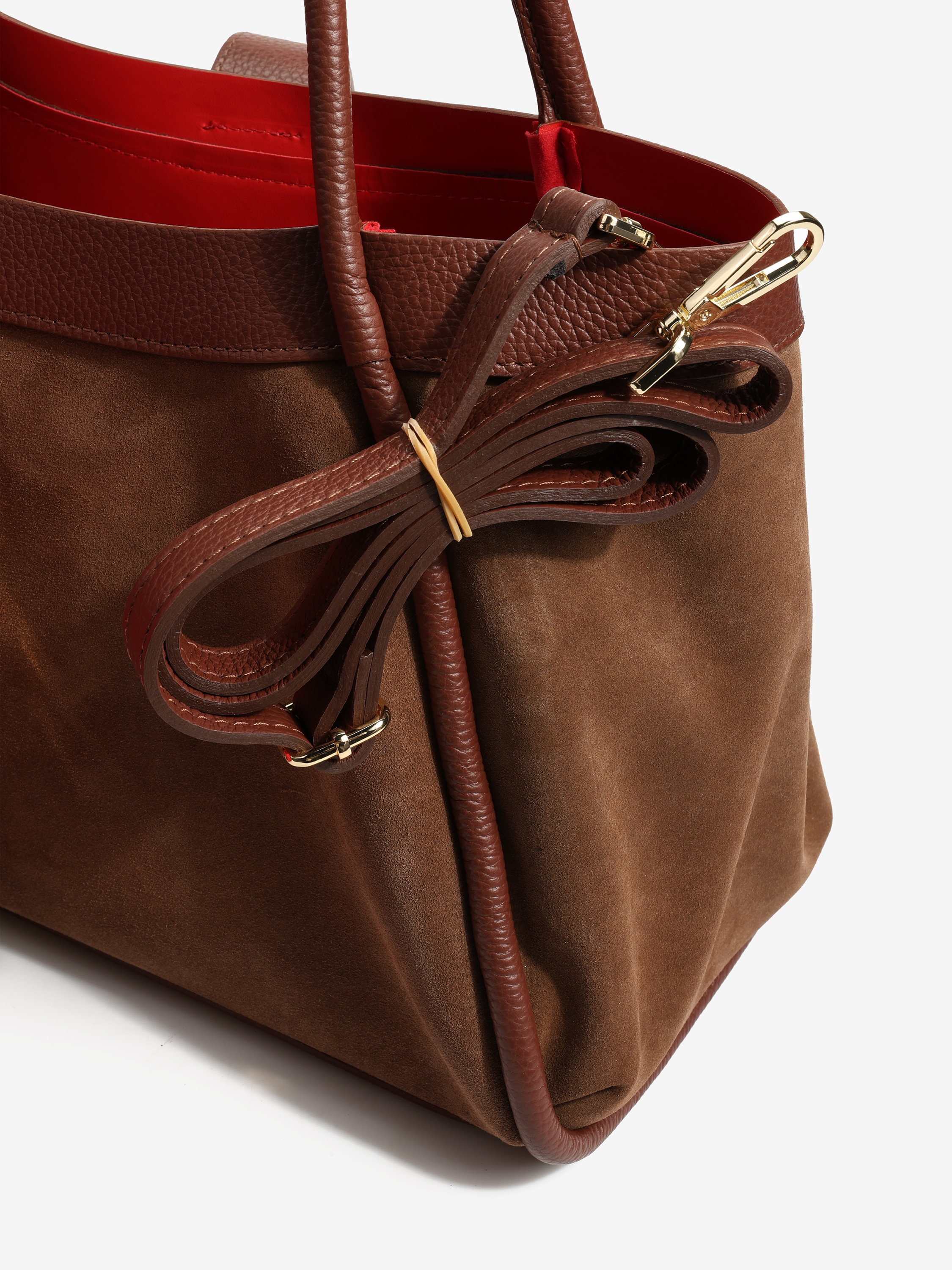 Elegancka torebka wykonana z wysokiej jakości zamszu z elementami skóry licowej. Wewnątrz znajduje się wyjmowana kosmetyczka, a dzięki łańcuszkowi można zmienić kształt torebki. Czerwone wnętrze dodaje jej wyjątkowego charakteru, a pojemność zapewnia komfort użytkowania na co dzień.