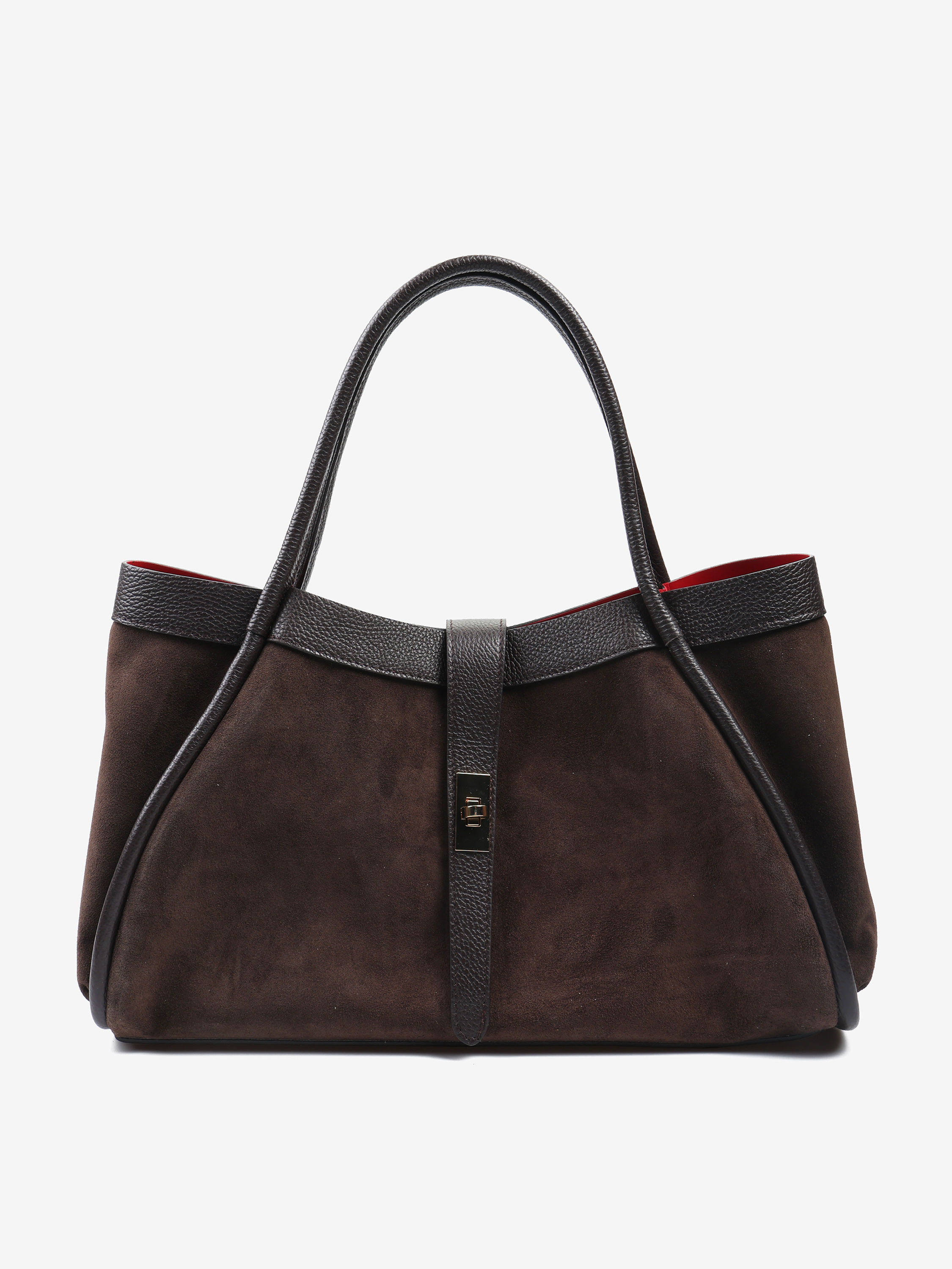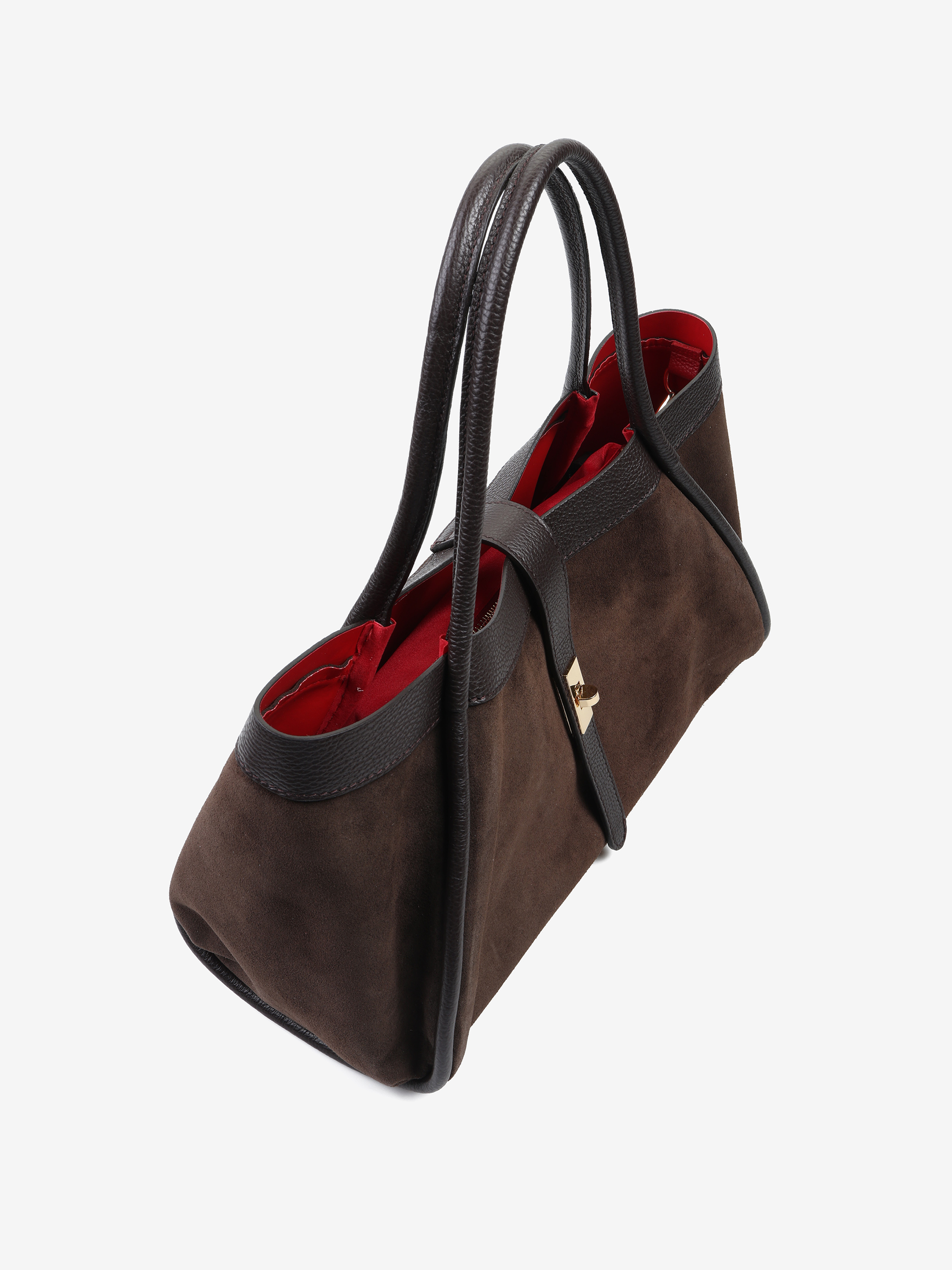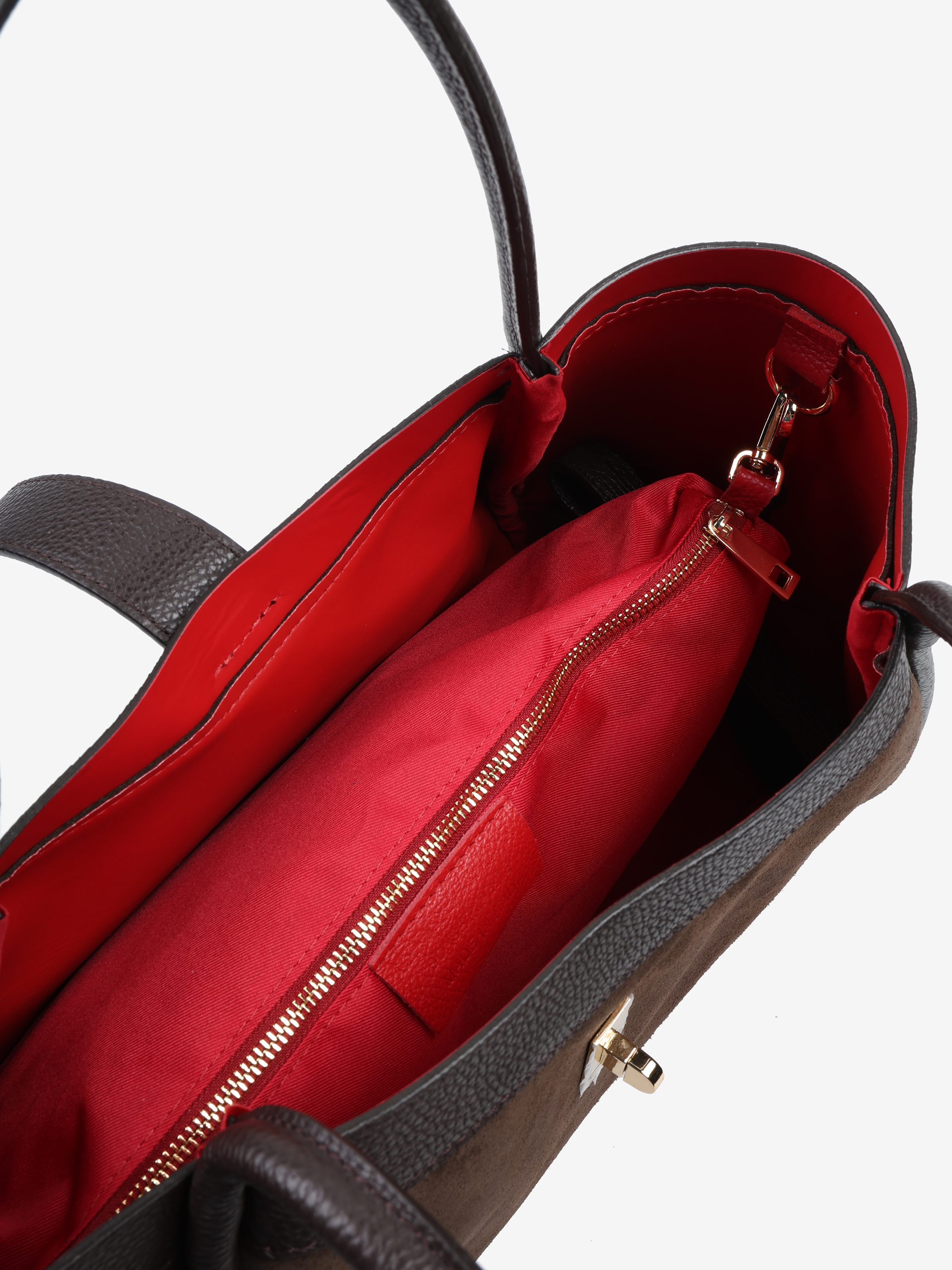 Elegancka torebka wykonana z wysokiej jakości zamszu z elementami skóry licowej. Wewnątrz znajduje się wyjmowana kosmetyczka, a dzięki łańcuszkowi można zmienić kształt torebki. Czerwone wnętrze dodaje jej wyjątkowego charakteru, a pojemność zapewnia komfort użytkowania na co dzień.