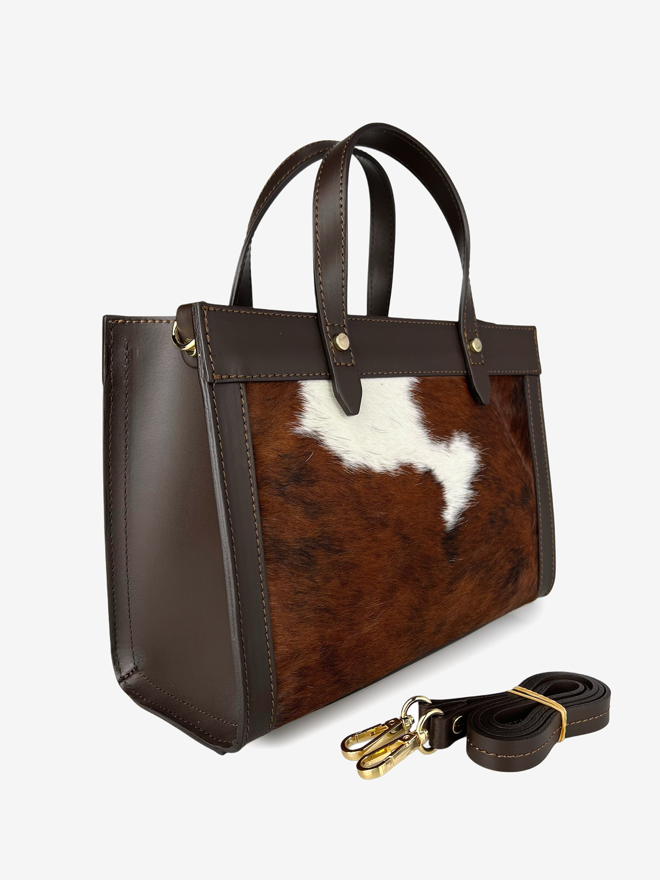 Prostokątna torebka ze wstawką ze skóry z włosiem w krowie łaty. Wyściółka z tkaniny i zapinana na suwak przegródka. Dodatkowy pasek do noszenia na ramieniu.