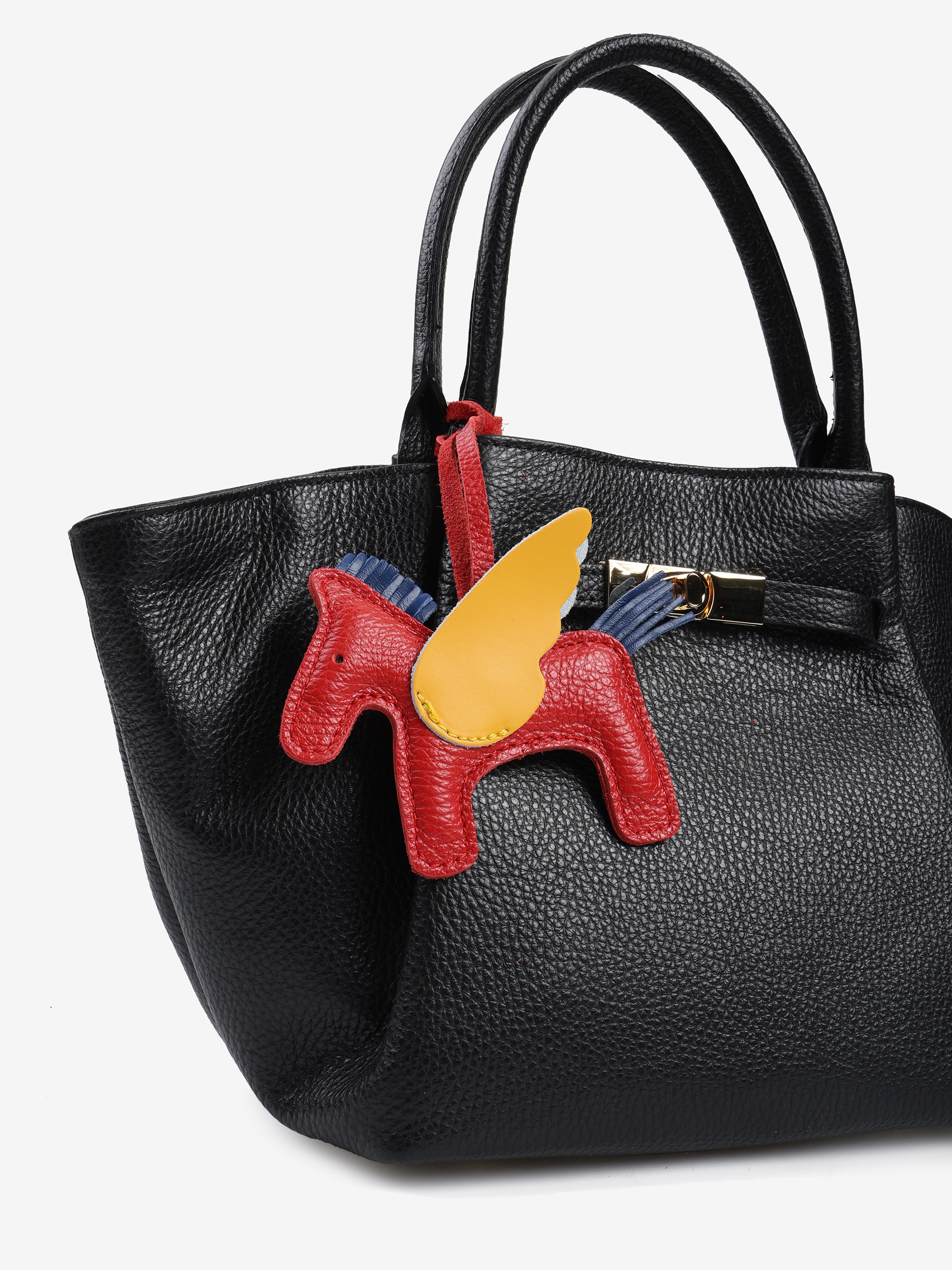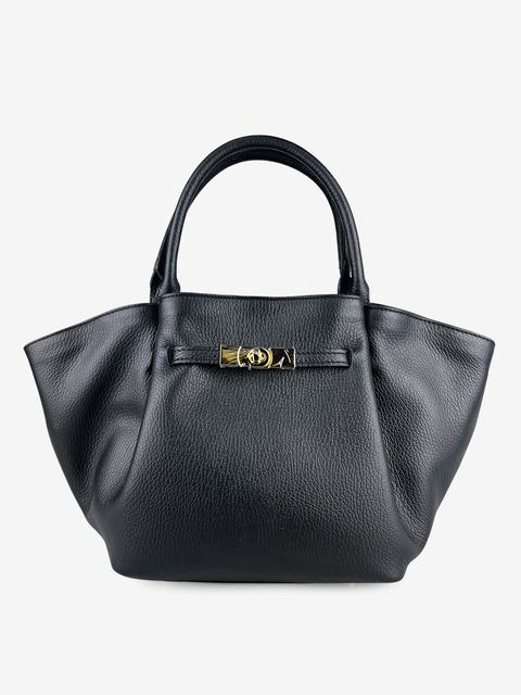 Skórzana torebka zapinana na zamek. Ozdobny zatrzask i dodatkowy, odczepiany pasek do noszenia na ramię.