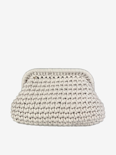 Mała torebka na zatrzask, wykonana z plecionej tkaniny. Odczepiany łańcuszek do noszenia na ramieniu.