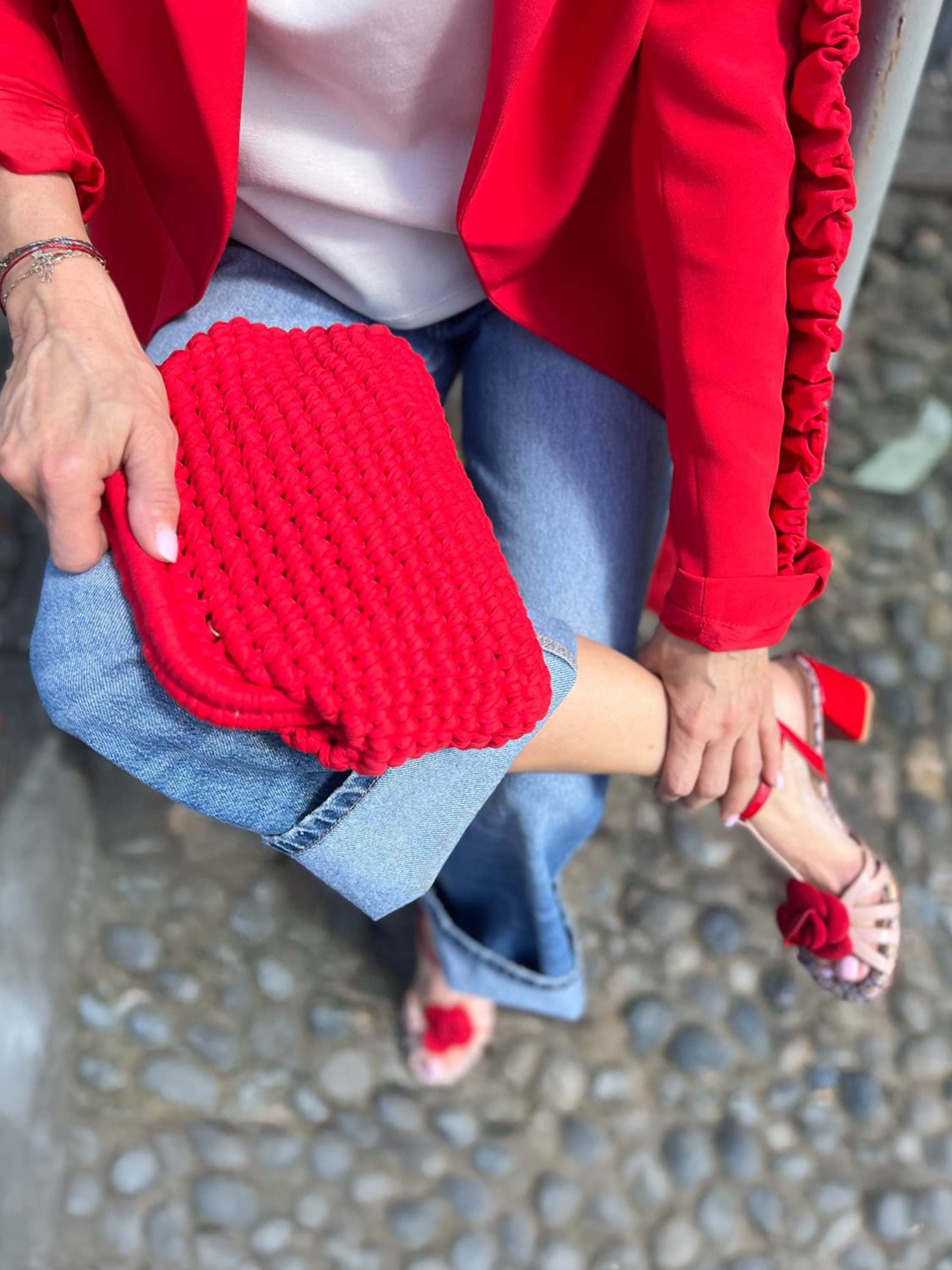 Mała torebka na zatrzask, wykonana z plecionej tkaniny. Odczepiany łańcuszek do noszenia na ramieniu.