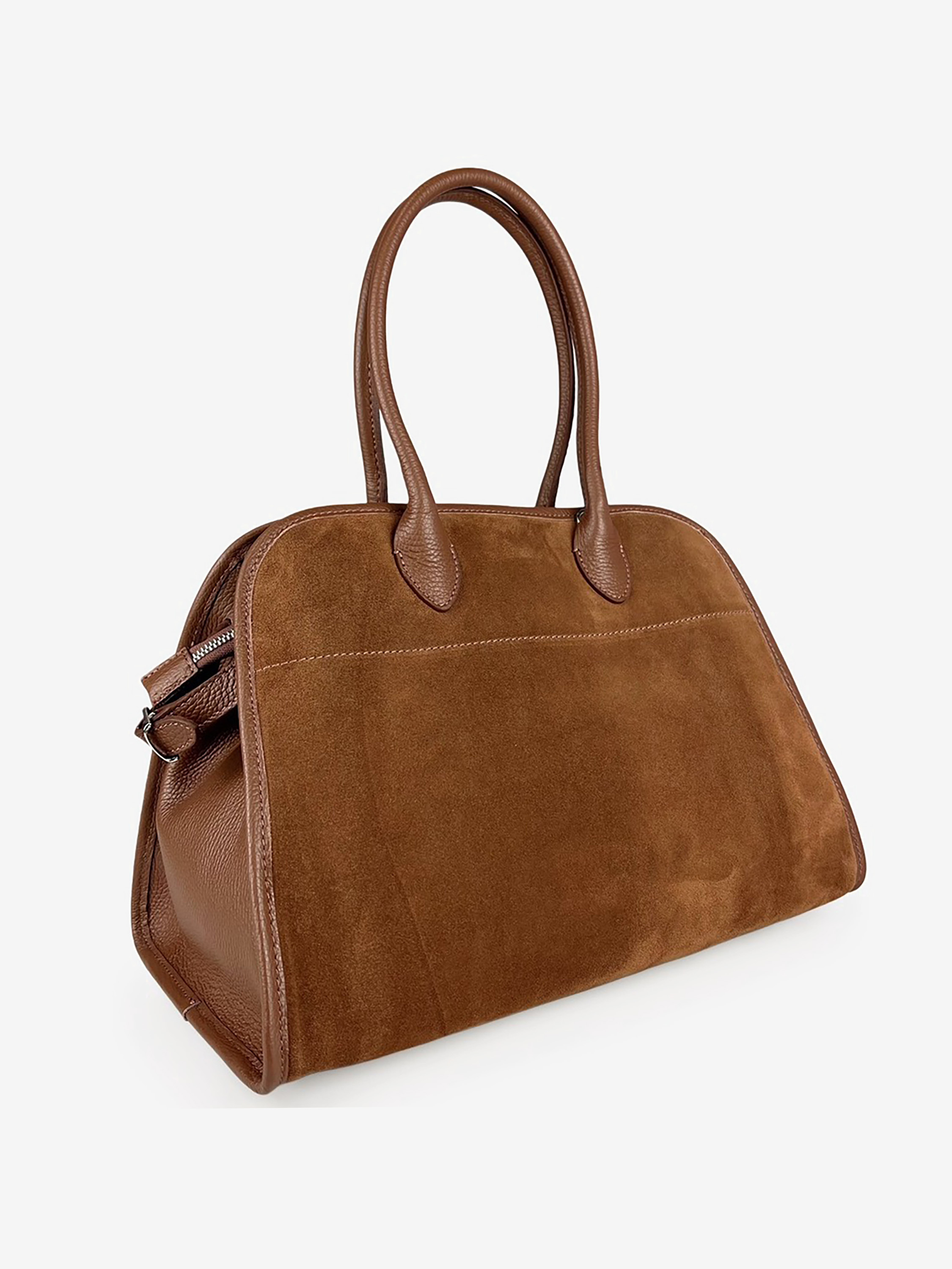 Model wykonany z naturalnej skóry zamszowej w połączeniu ze skórą licową. Wewnątrz mała kieszeń zapinana na suwak. Torba posiada dodatowy pasek.