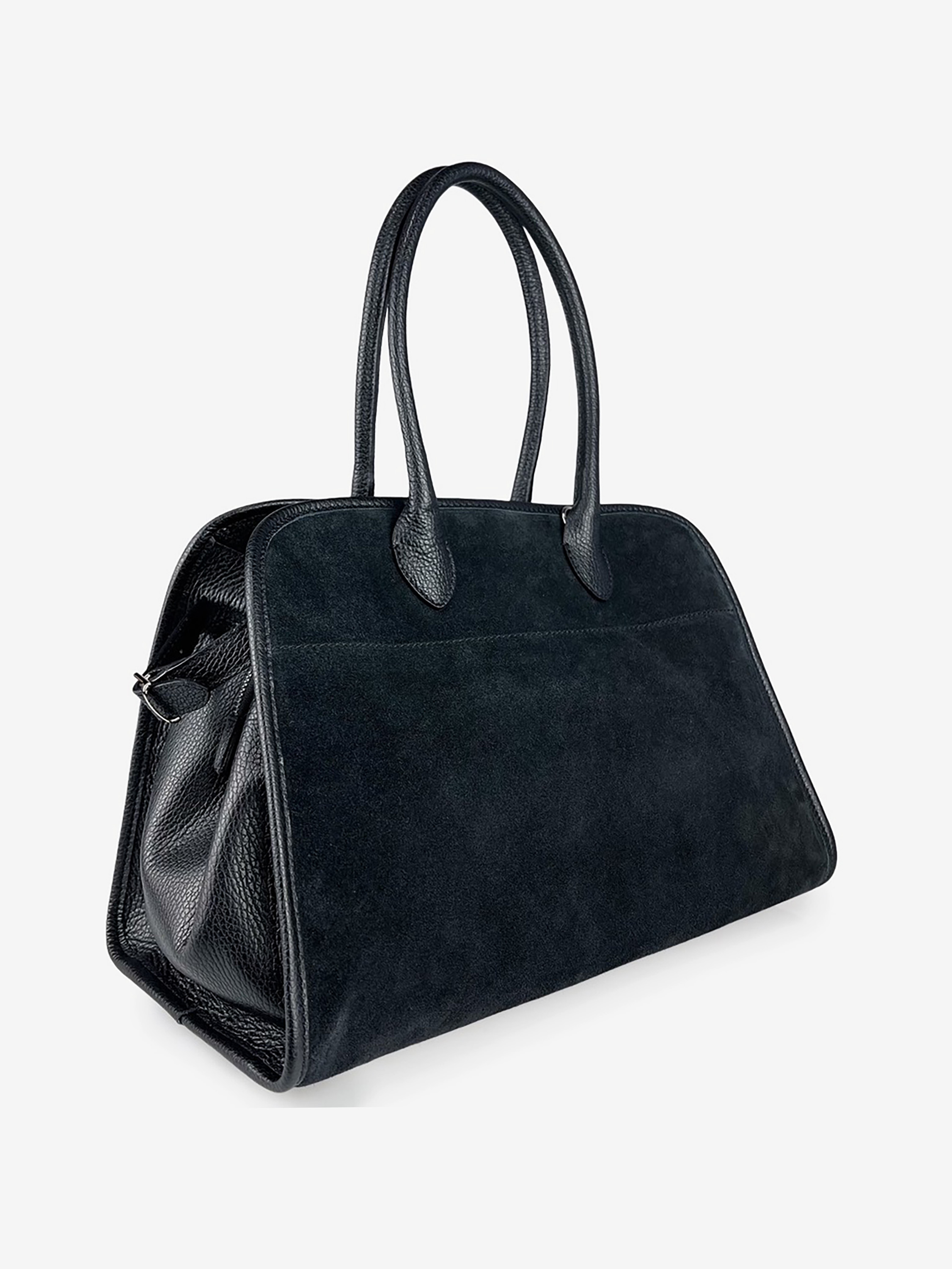 Model wykonany z naturalnej skóry zamszowej w połączeniu ze skórą licową. Wewnątrz mała kieszeń zapinana na suwak. Torba posiada dodatowy pasek.