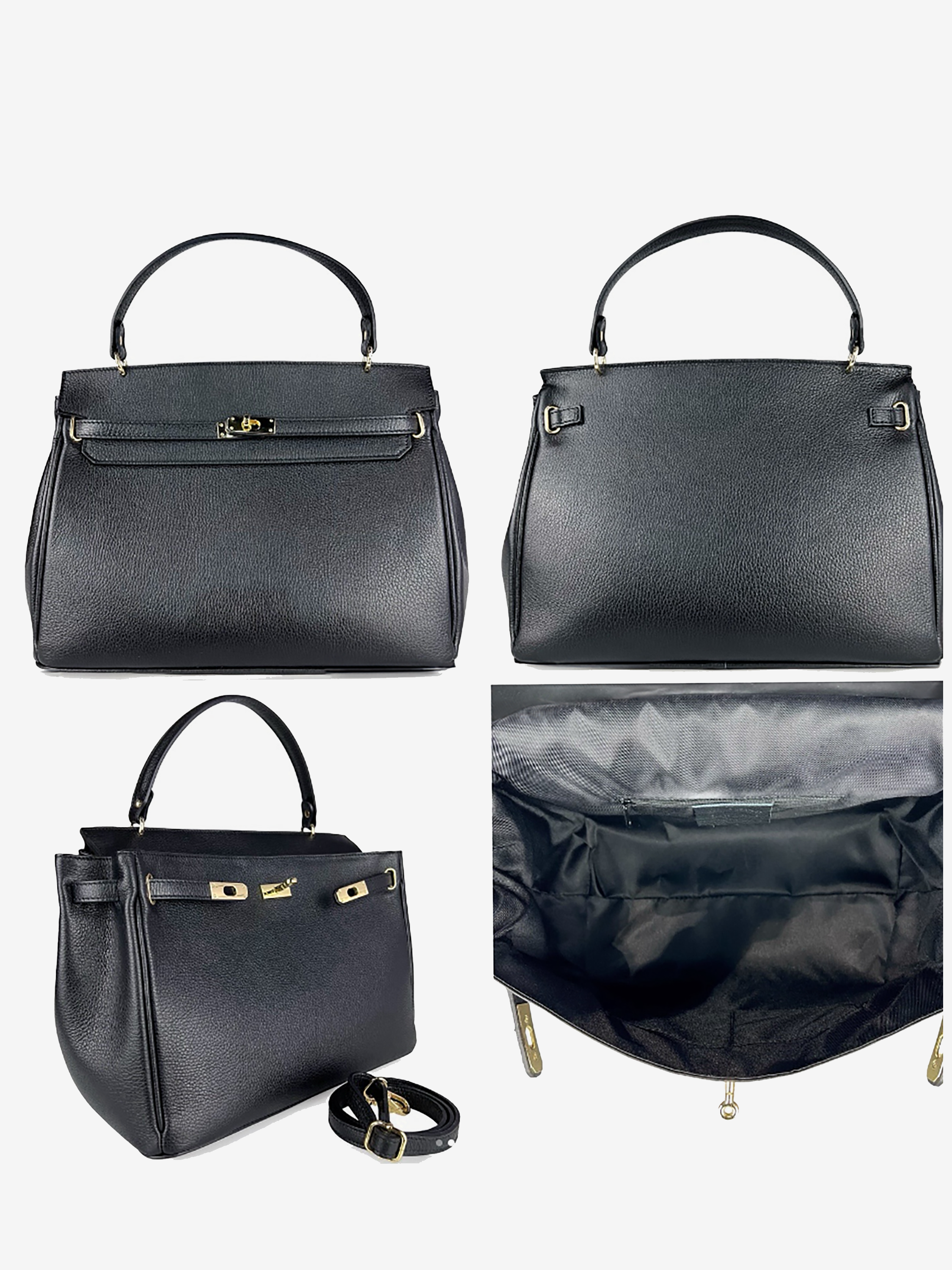 Elegancka torebka do ręki, zamykana na klapę ze złotym zapięciem. Dodatkowy pasek do noszenia na ramieniu.