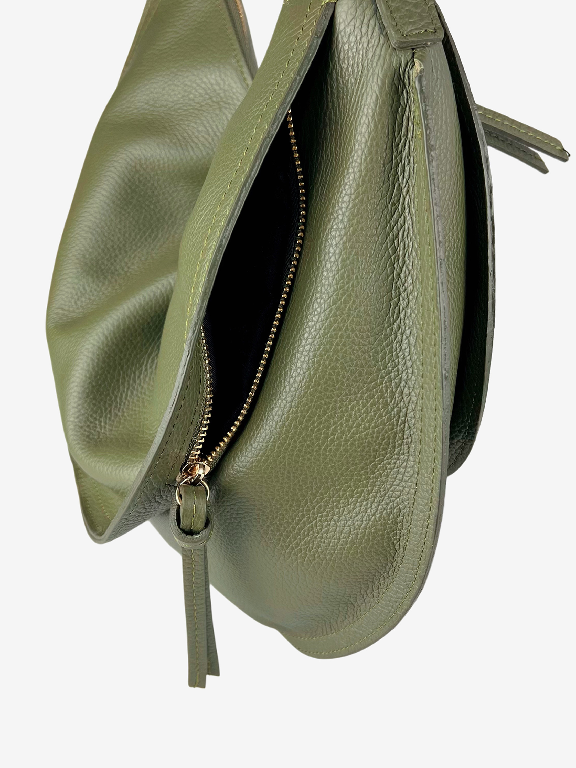 Półokrągła torba z pojemną komorą i mniejszymi kieszonkami, zapinana na suwak. Dodatkowy, regulowany pasek.