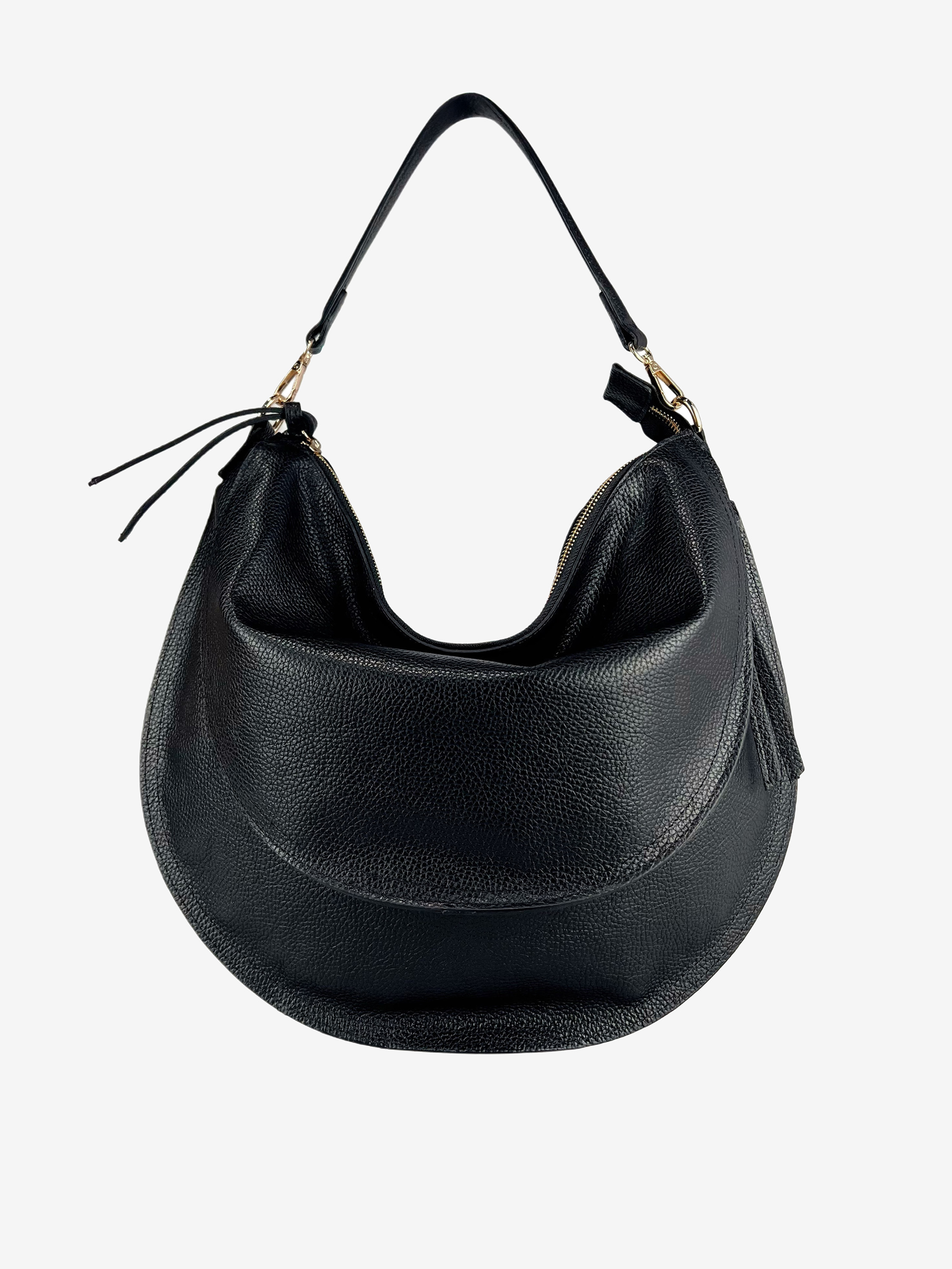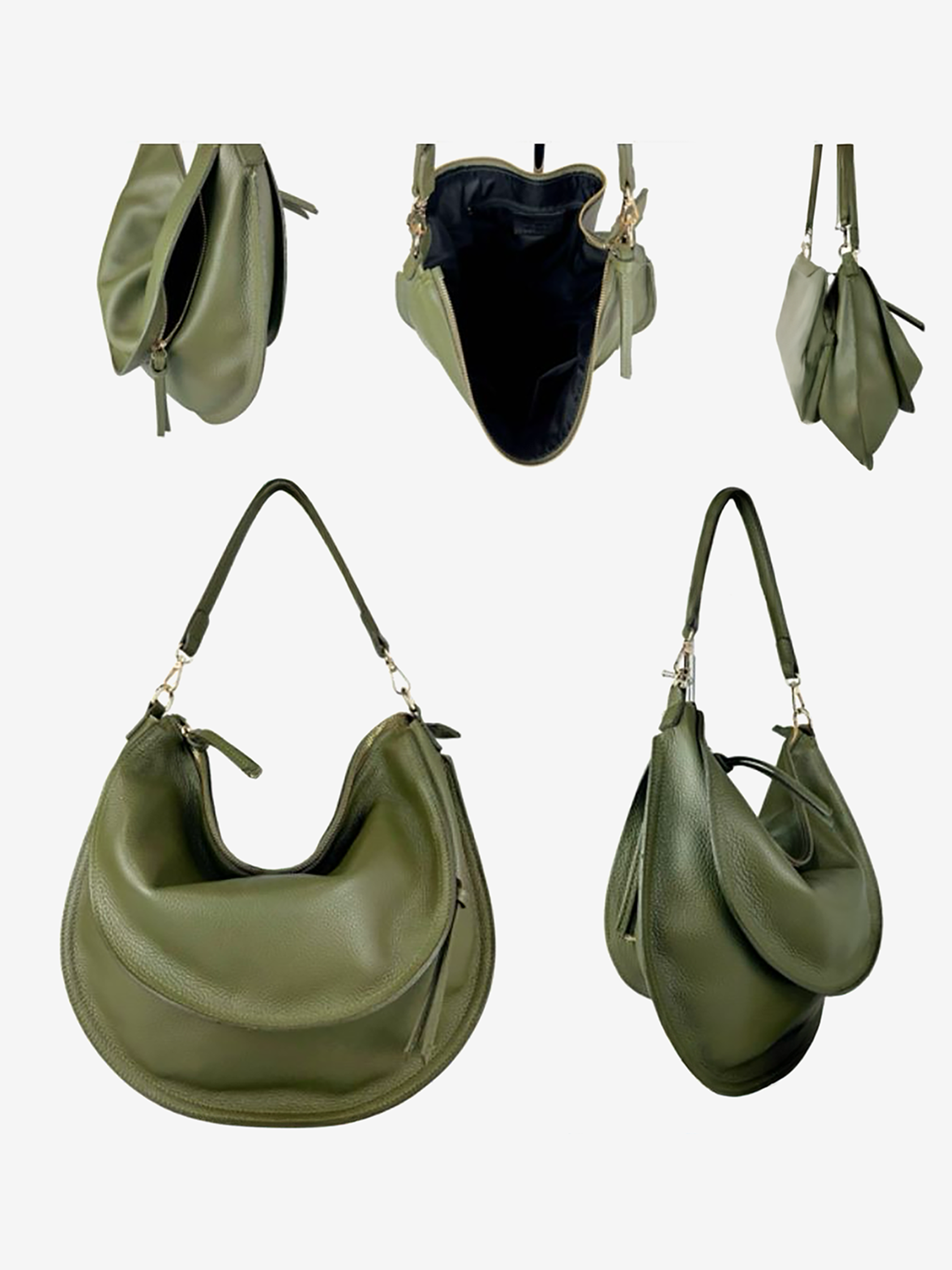 Półokrągła torba z pojemną komorą i mniejszymi kieszonkami, zapinana na suwak. Dodatkowy, regulowany pasek.