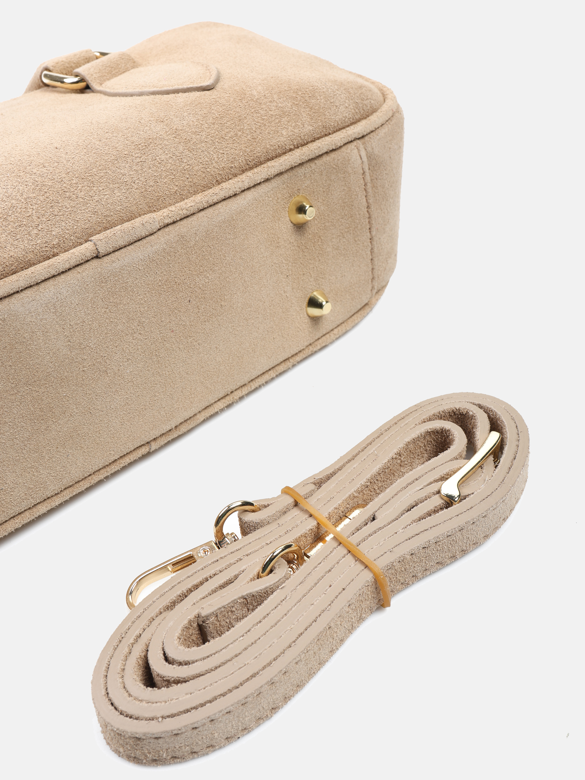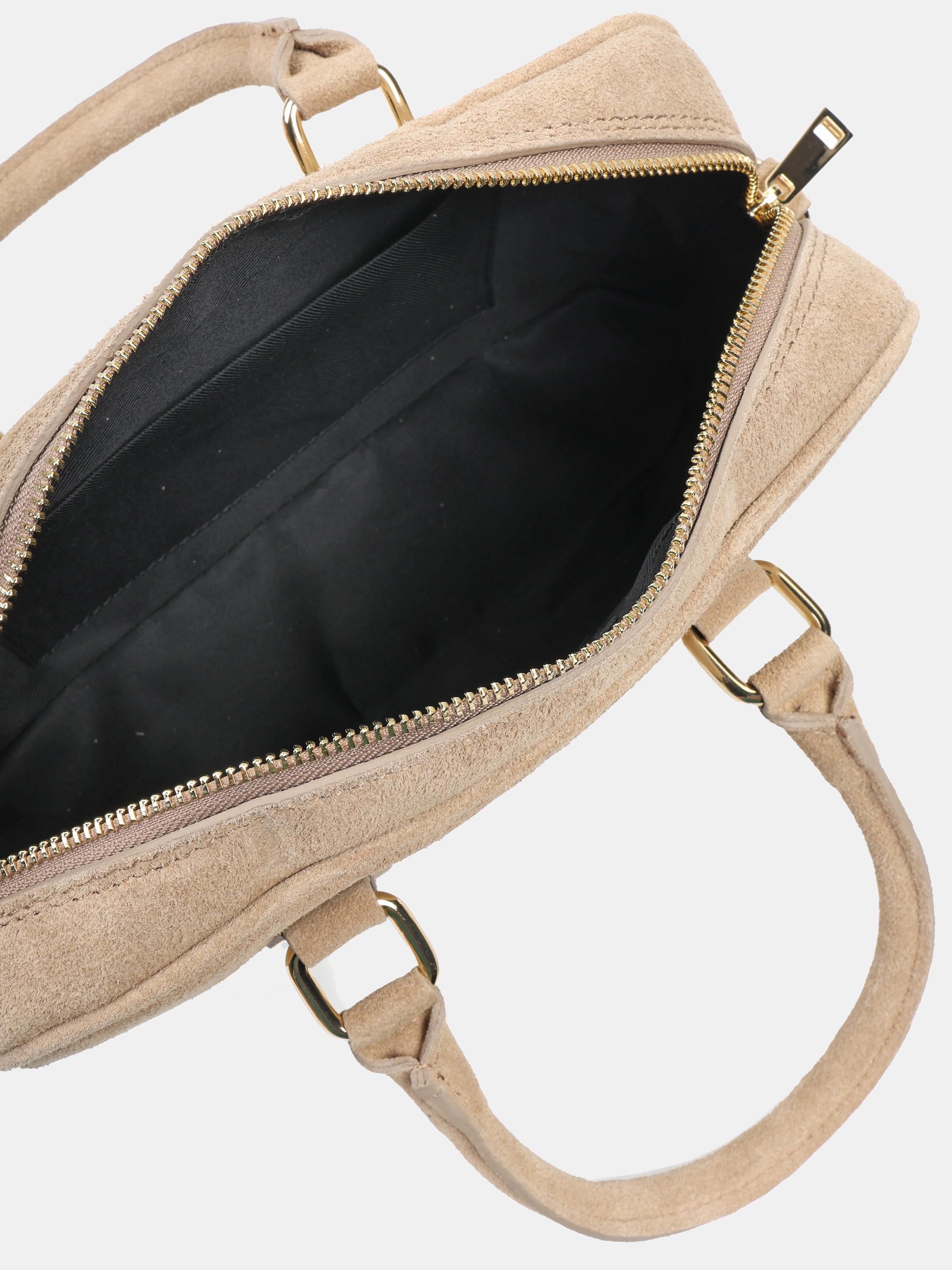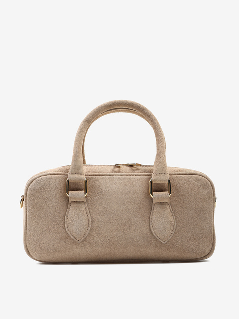 Mała, zamszowa torebka typu kuferek. Zapinanie na zamek. Dodatkowy, odczepiany pasek do noszenia na ramieniu.