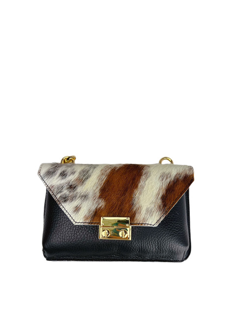 Mini torebka damska z kolekcji HEGO'S Milano wykonana jest z włoskiej naturalnej skóry. Posiada modny, zwierzęcy print. oraz cienki pasek na złotym łańcuszku. Torebka zapinana jest na zatrzask.  Środek torebki to jedna przestrzeń wykończona na surowo. Pomimo niewielkich rozmiarów bez trudu pomieści wszystkie najpotrzebniejsze rzeczy. Idealna na prezent.