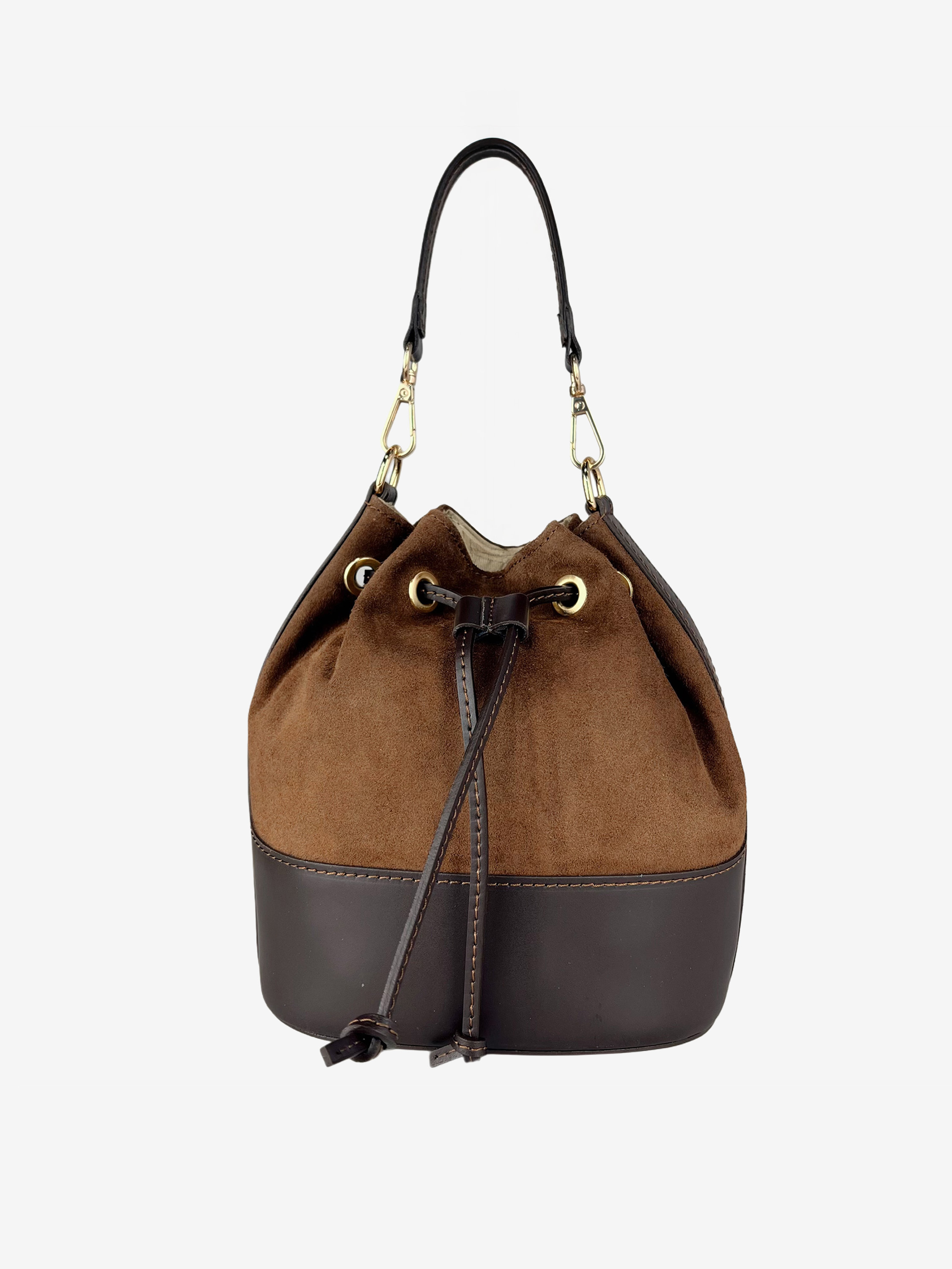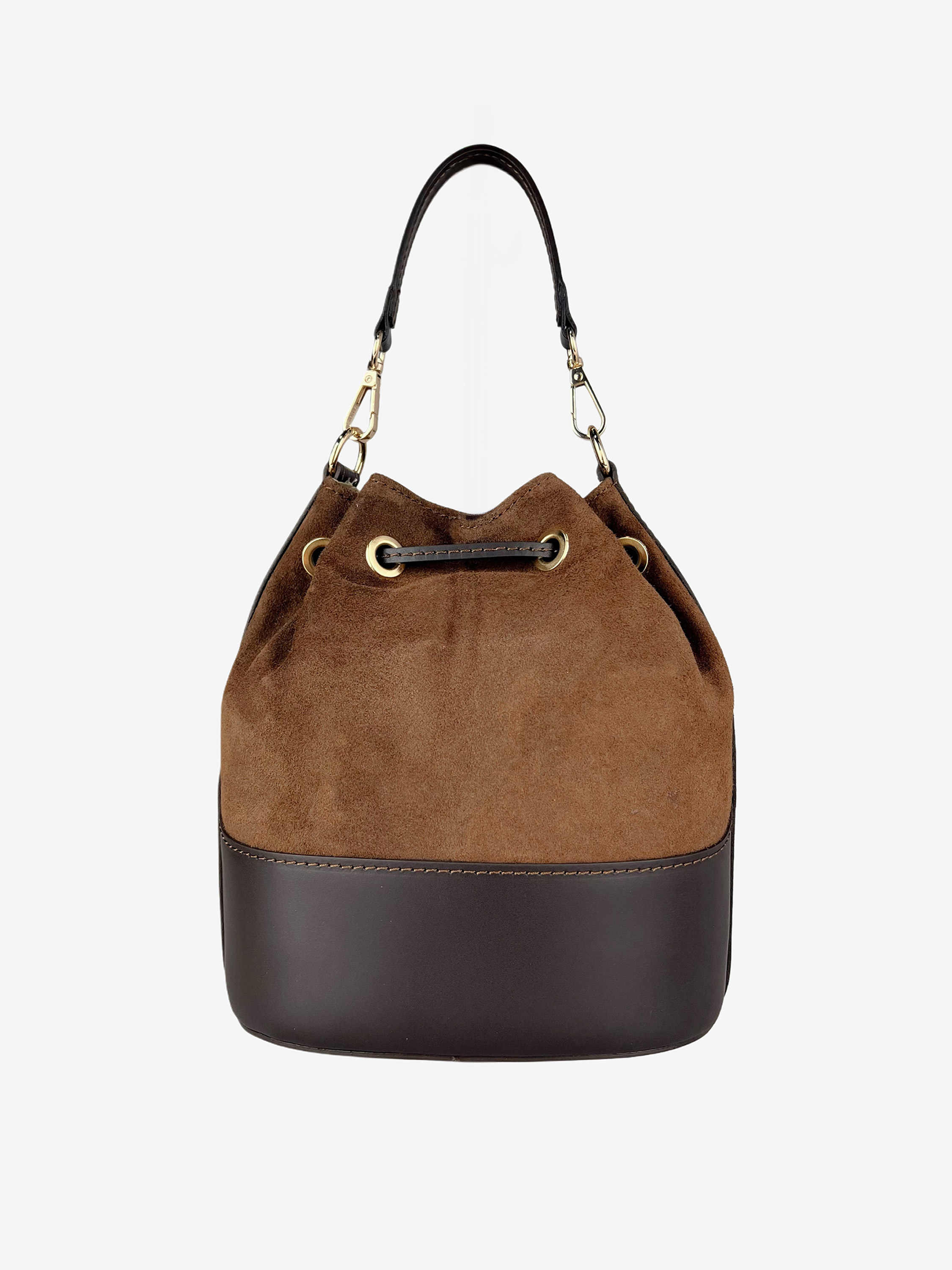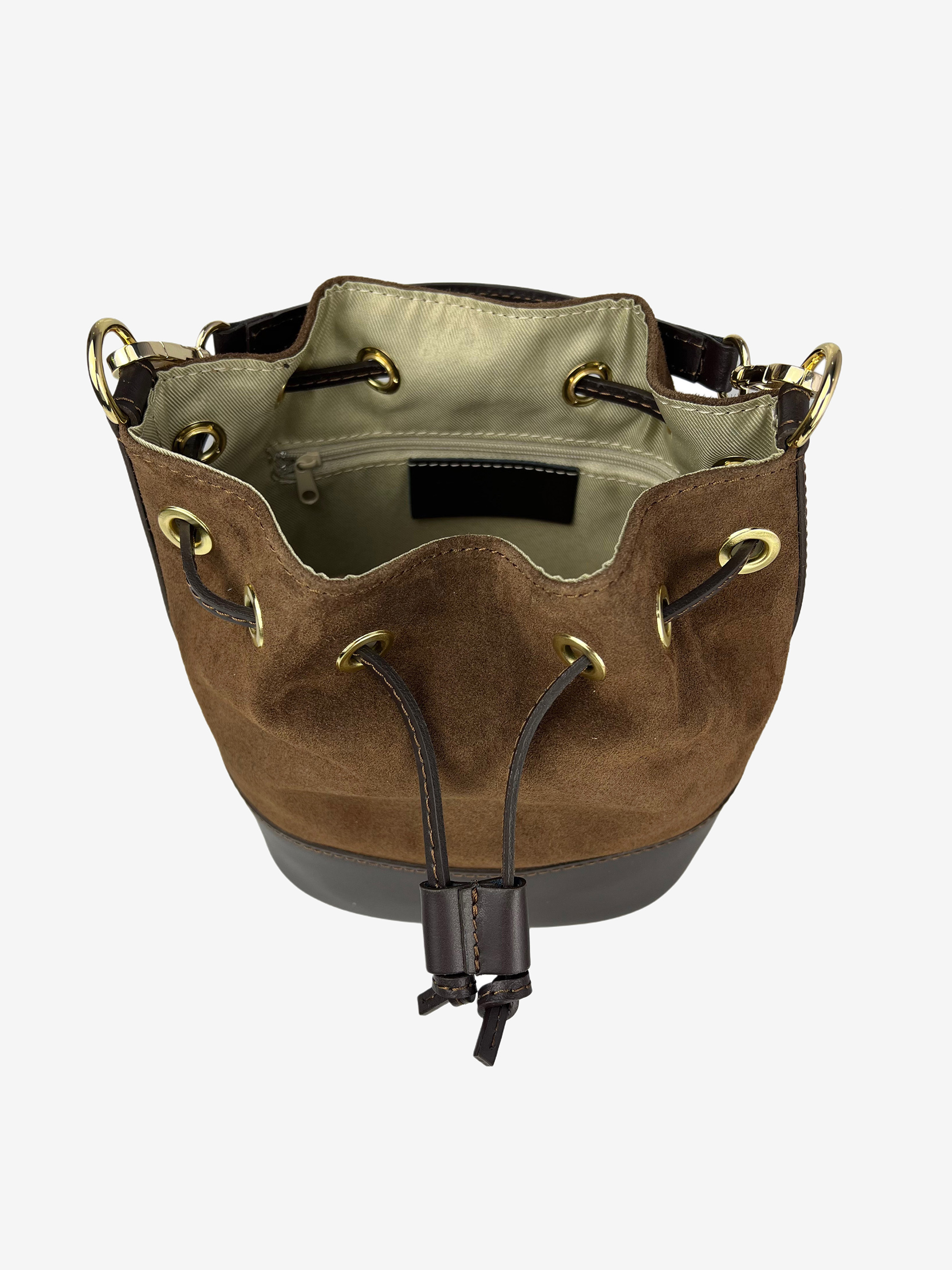 Torebka-worek wykonana z połączenia skóry naturalnej i zamszu. Dodatkowy, regulowany pasek do noszenia na ramieniu. W środku kieszonka zapinana na suwak.