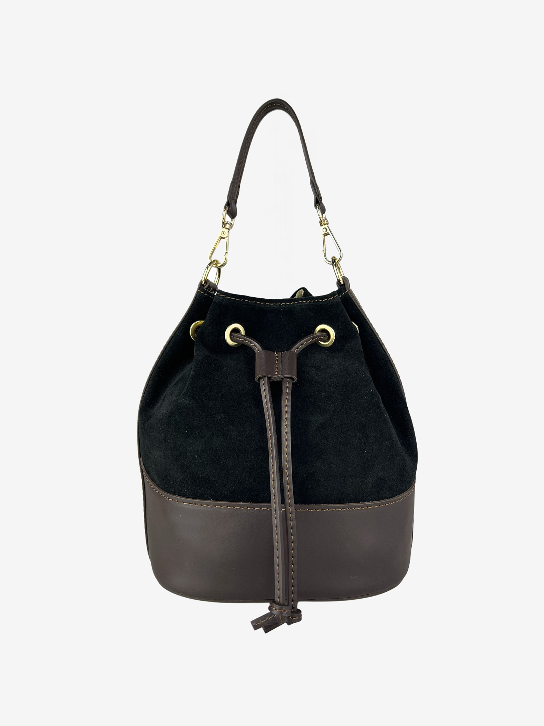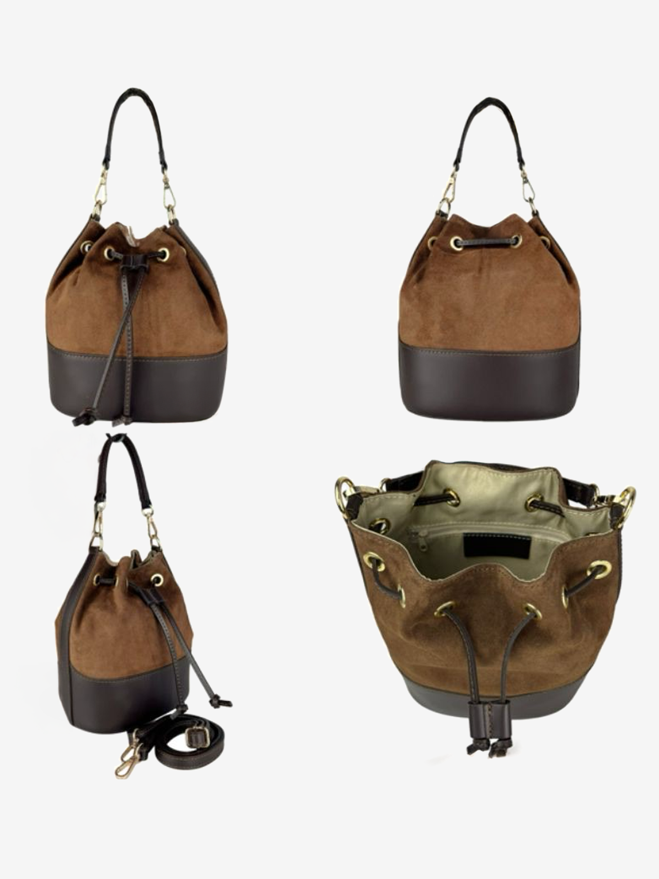 Torebka-worek wykonana z połączenia skóry naturalnej i zamszu. Dodatkowy, regulowany pasek do noszenia na ramieniu. W środku kieszonka zapinana na suwak.