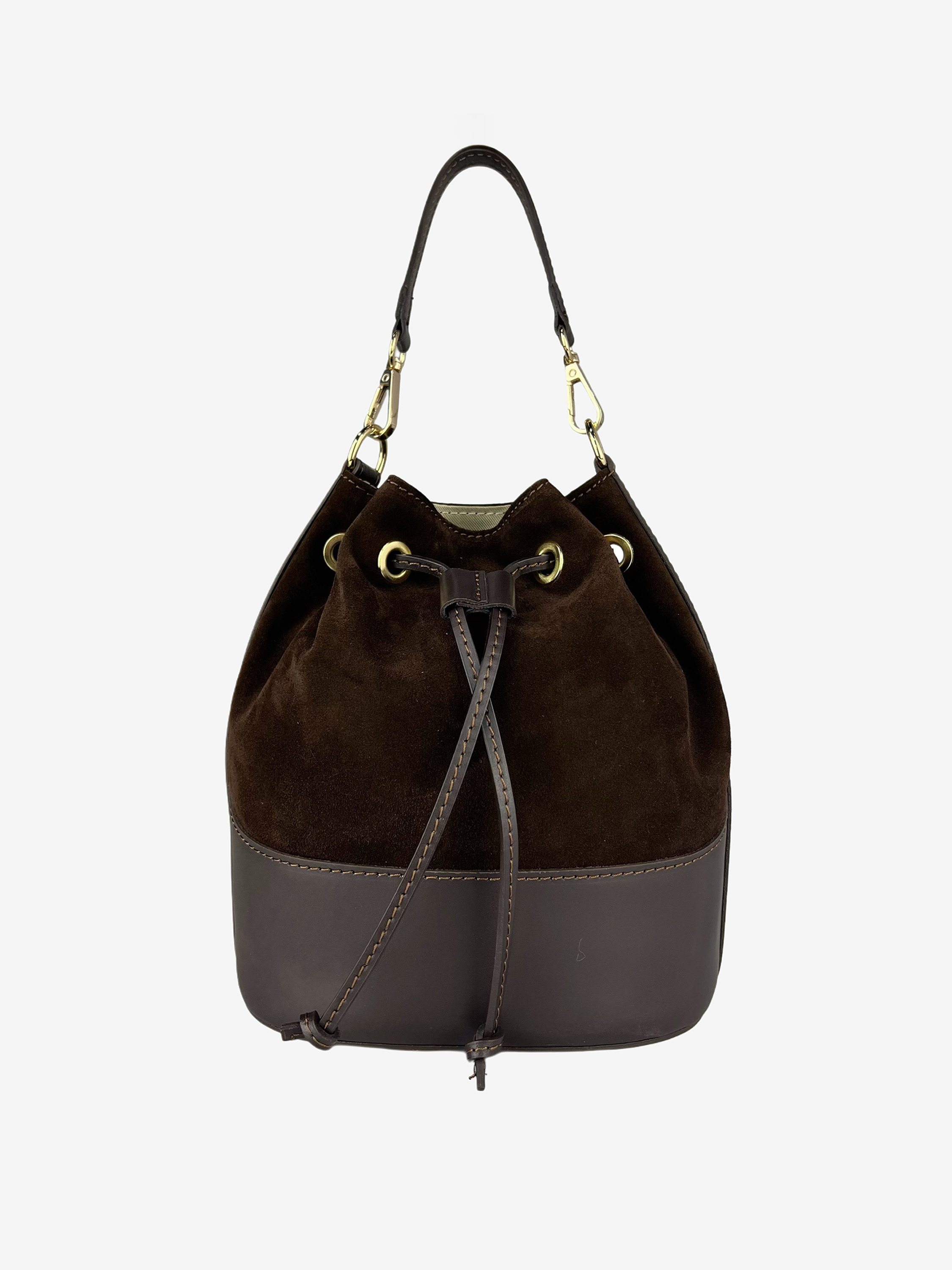 Torebka-worek wykonana z połączenia skóry naturalnej i zamszu. Dodatkowy, regulowany pasek do noszenia na ramieniu. W środku kieszonka zapinana na suwak.