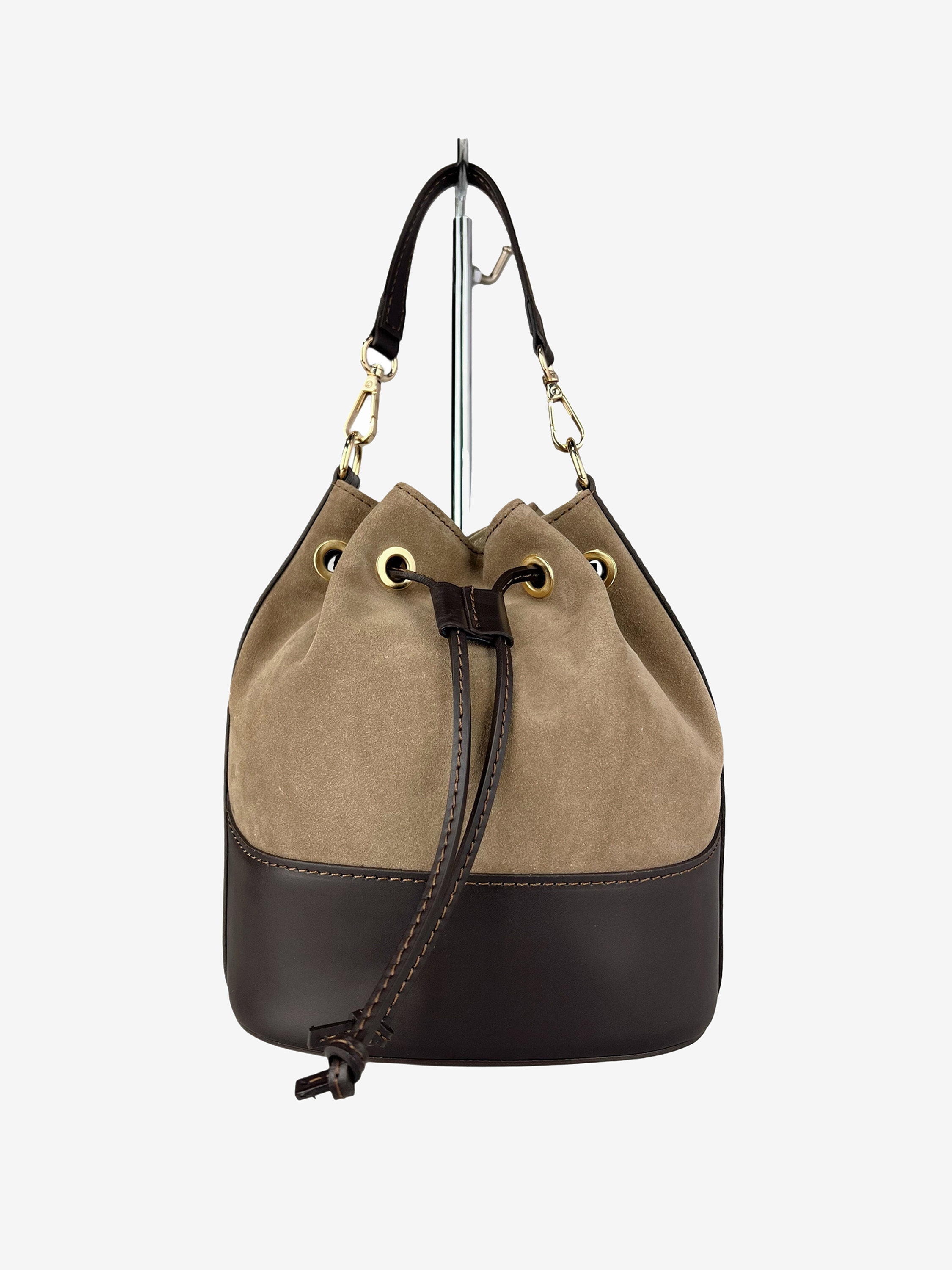 Torebka-worek wykonana z połączenia skóry naturalnej i zamszu. Dodatkowy, regulowany pasek do noszenia na ramieniu. W środku kieszonka zapinana na suwak.