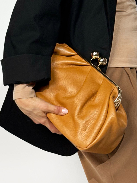 Duża kopertówka typu pouch z zamknięciem na zatrzask. Dodatkowy, regulowany pasek do noszenia na ramię.