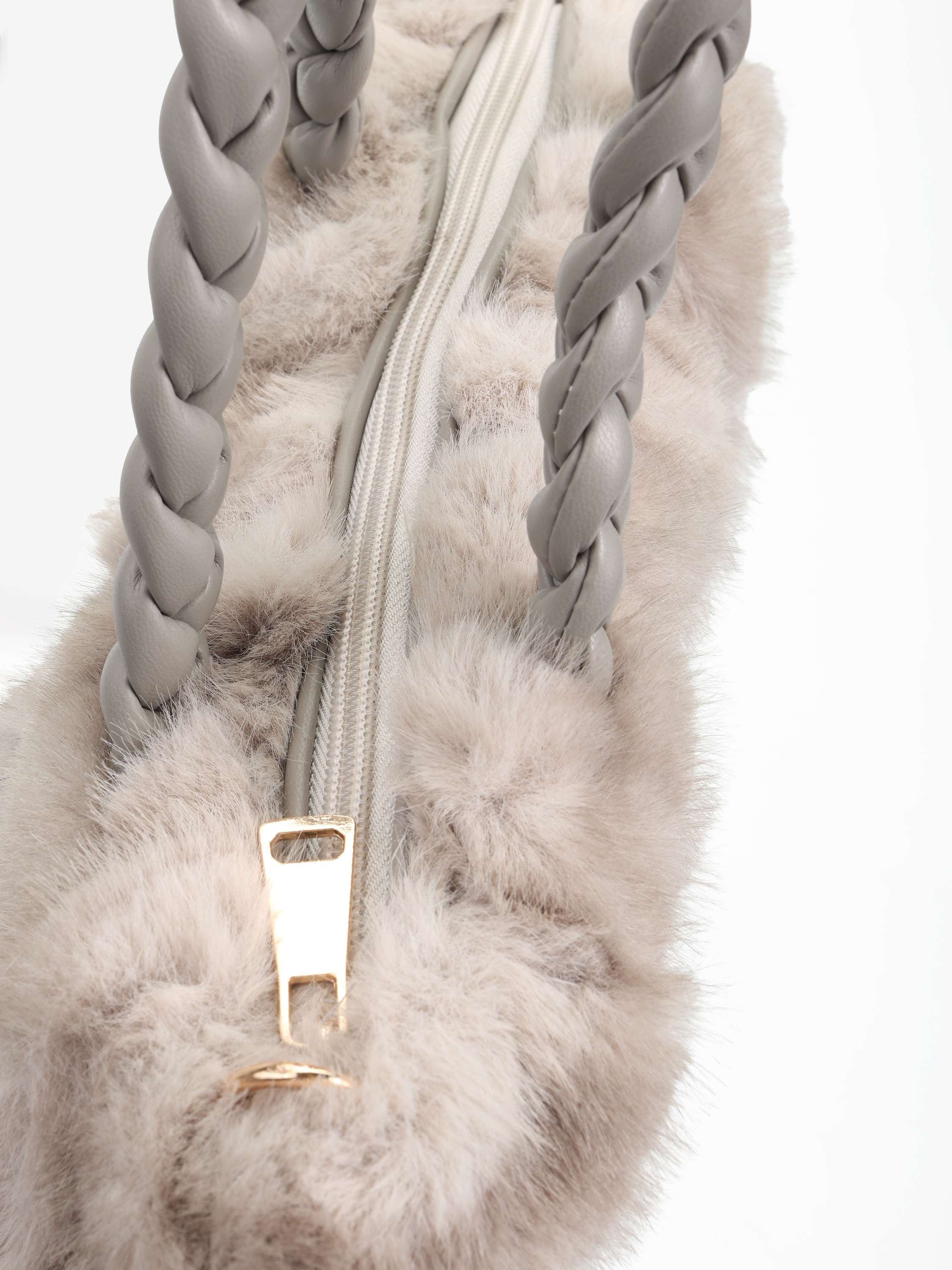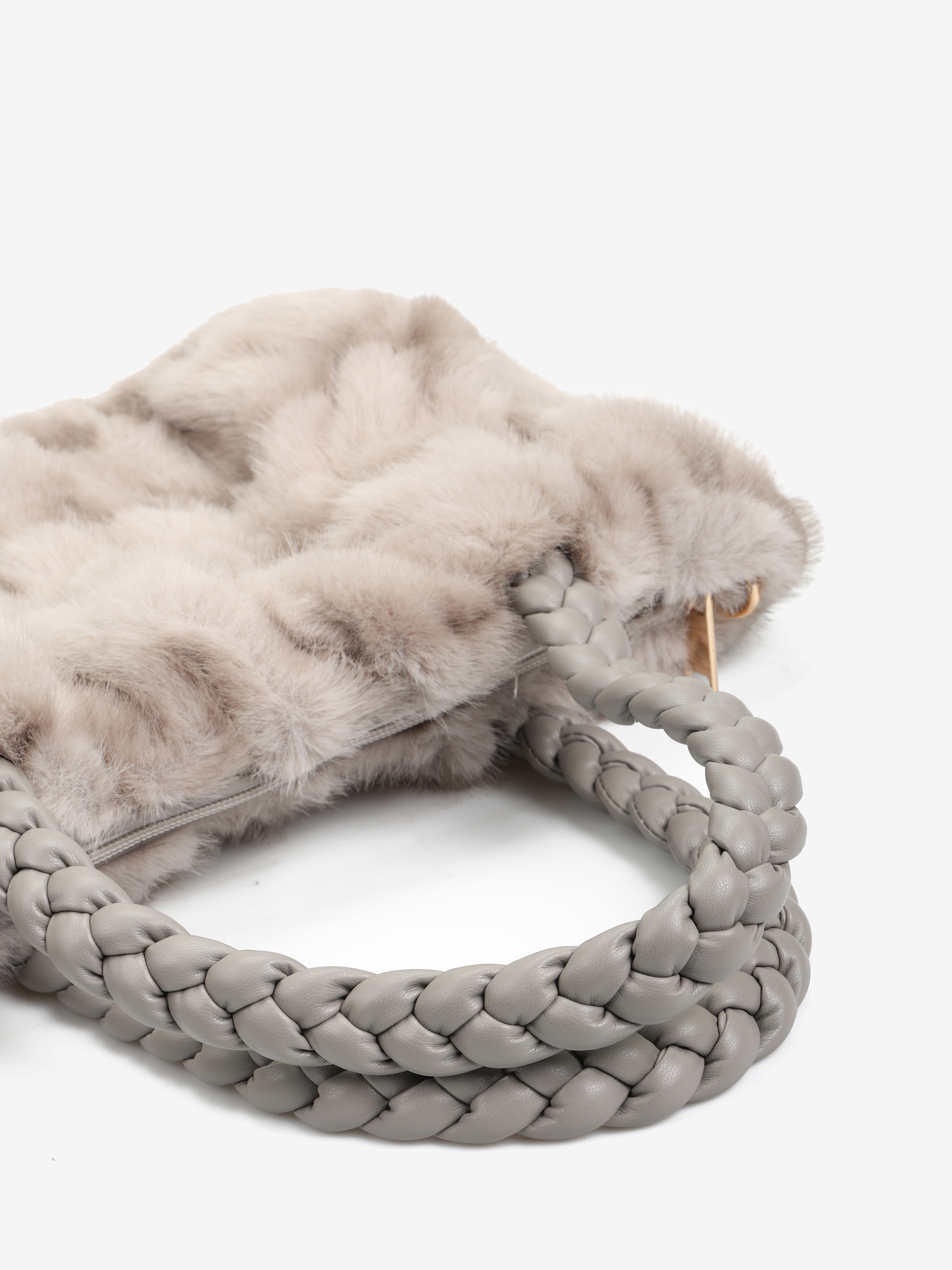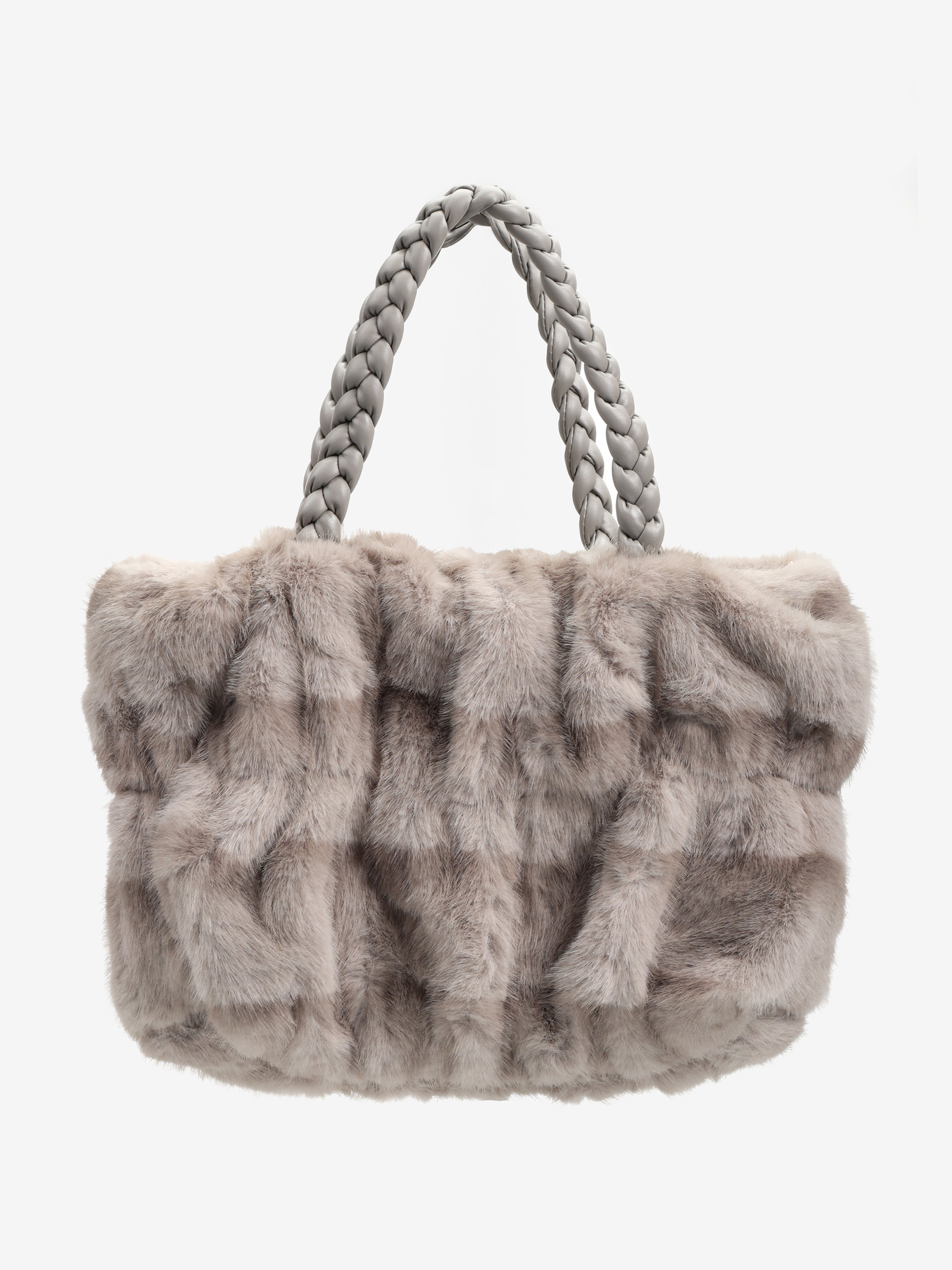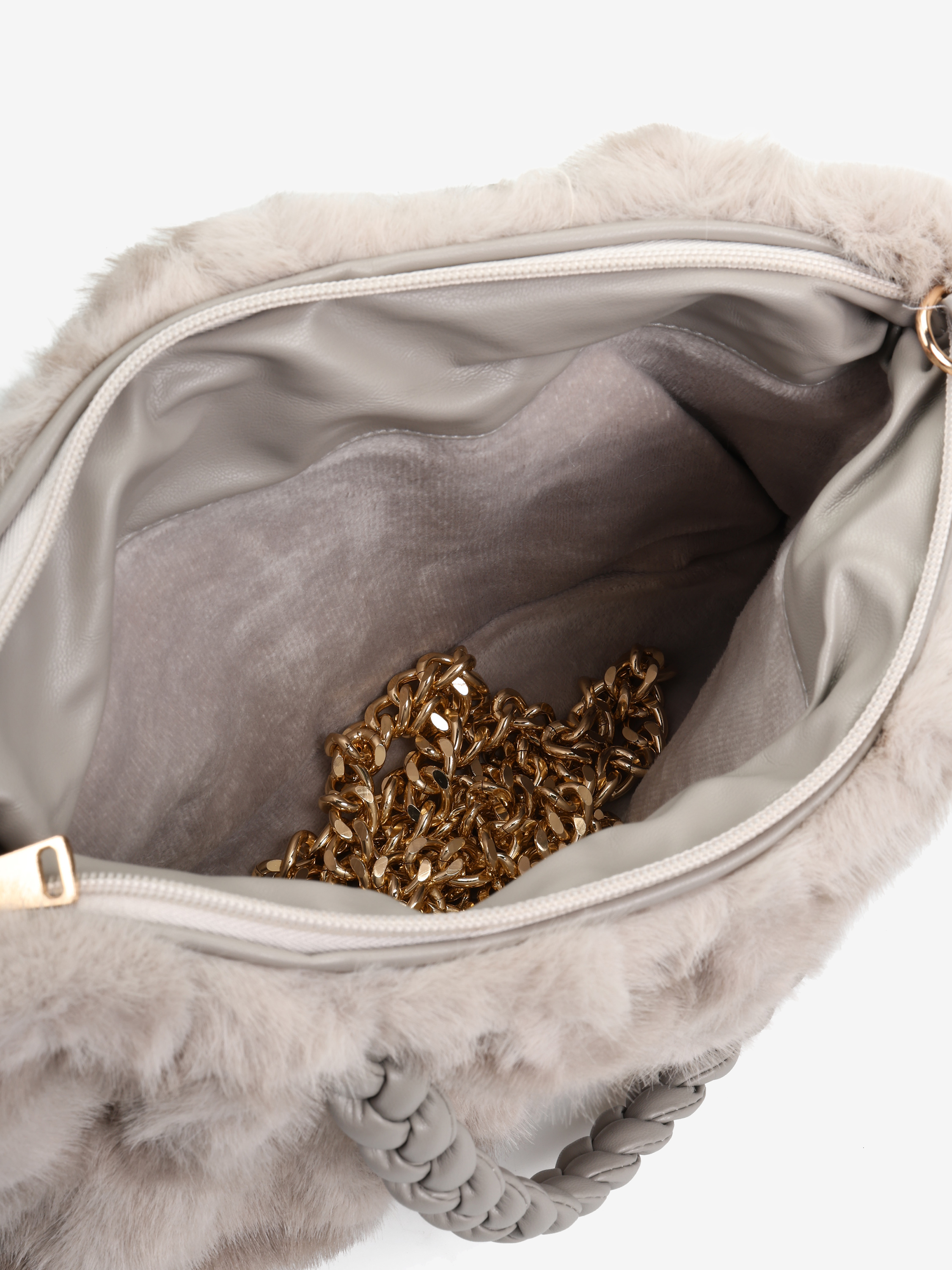Torebka z plecionymi uchwytami wykonana z szarego, sztucznego futra. Dodatkowy, odczepiany łańcuszek do noszenia na ramieniu.