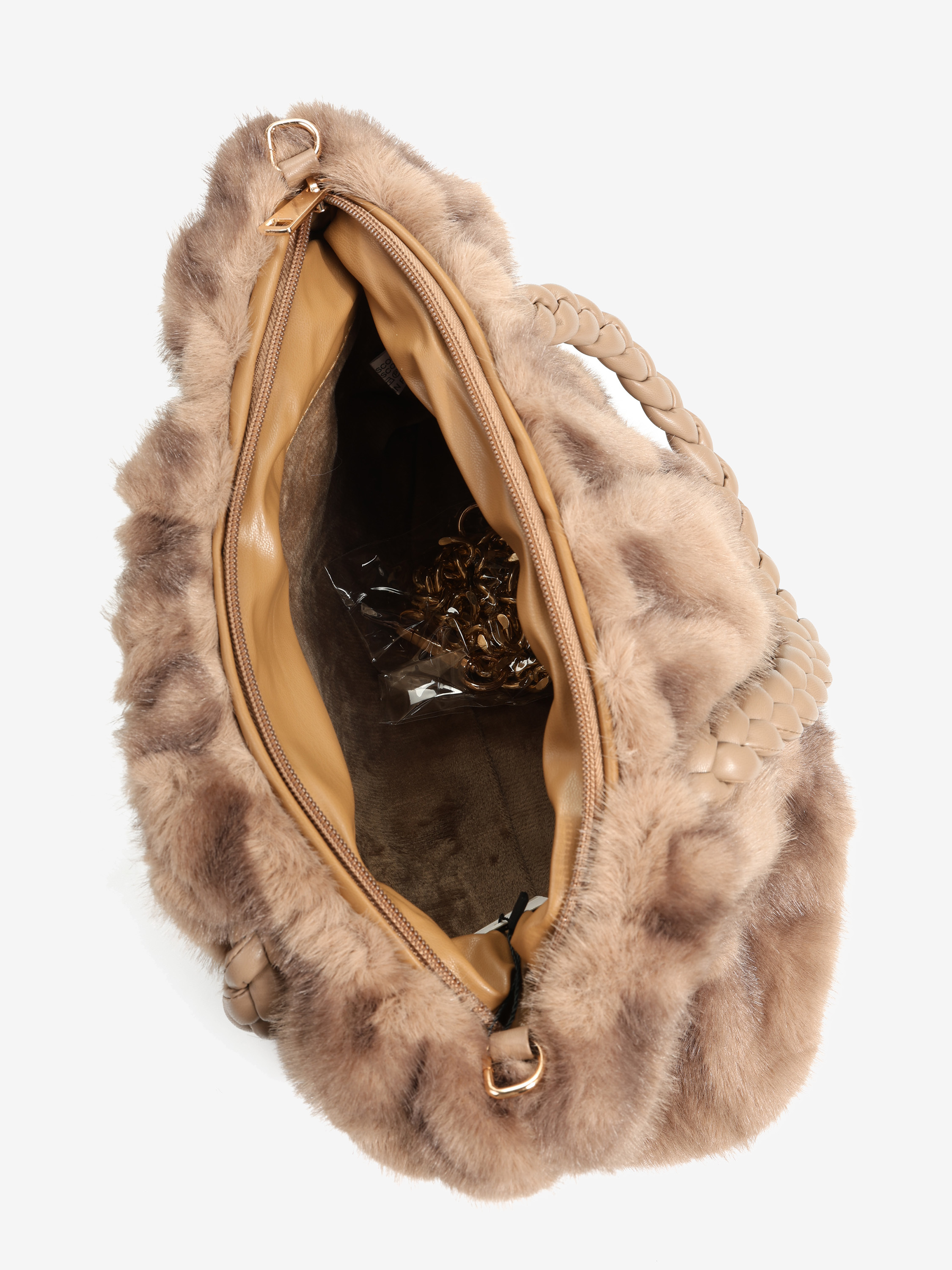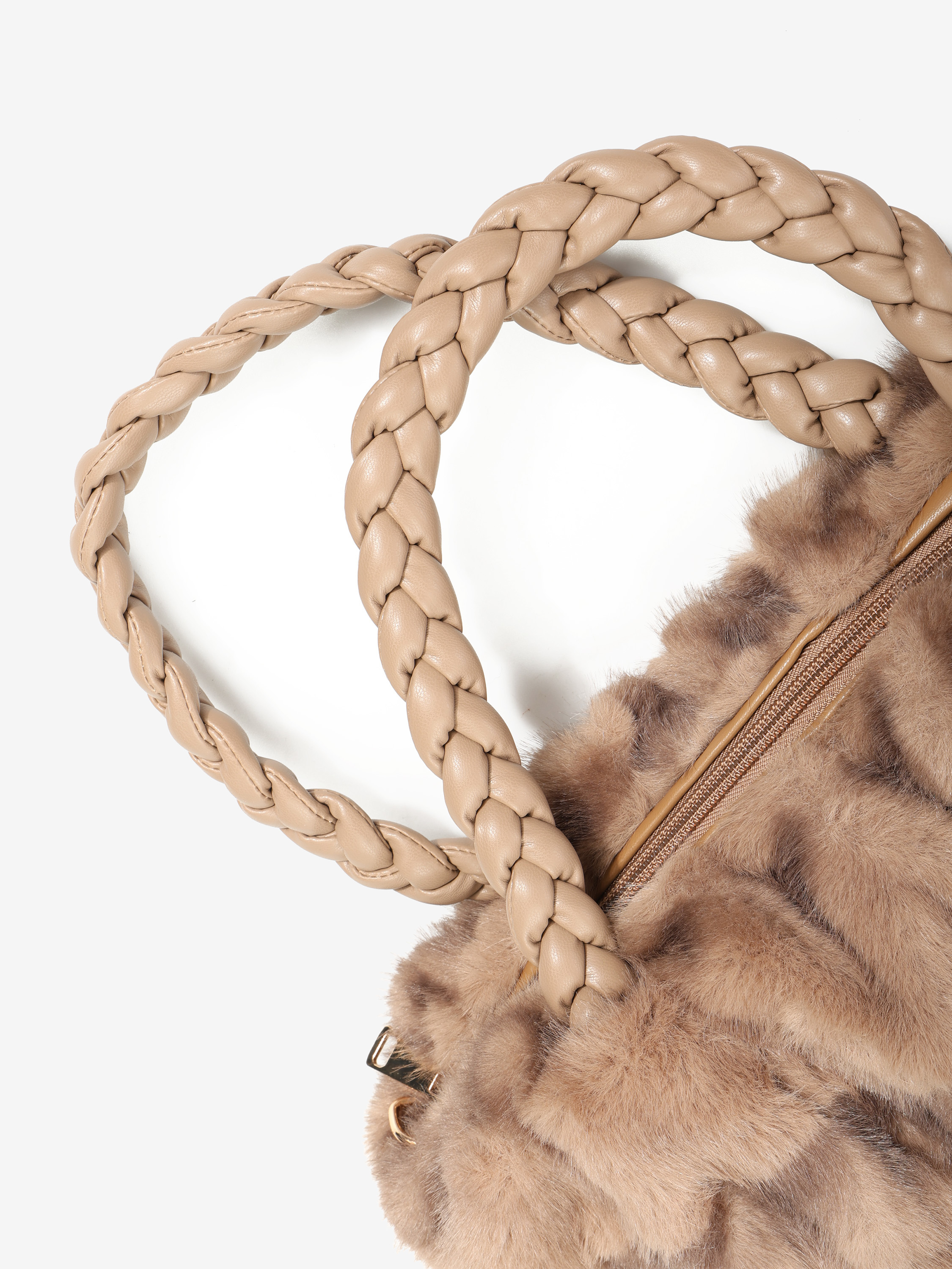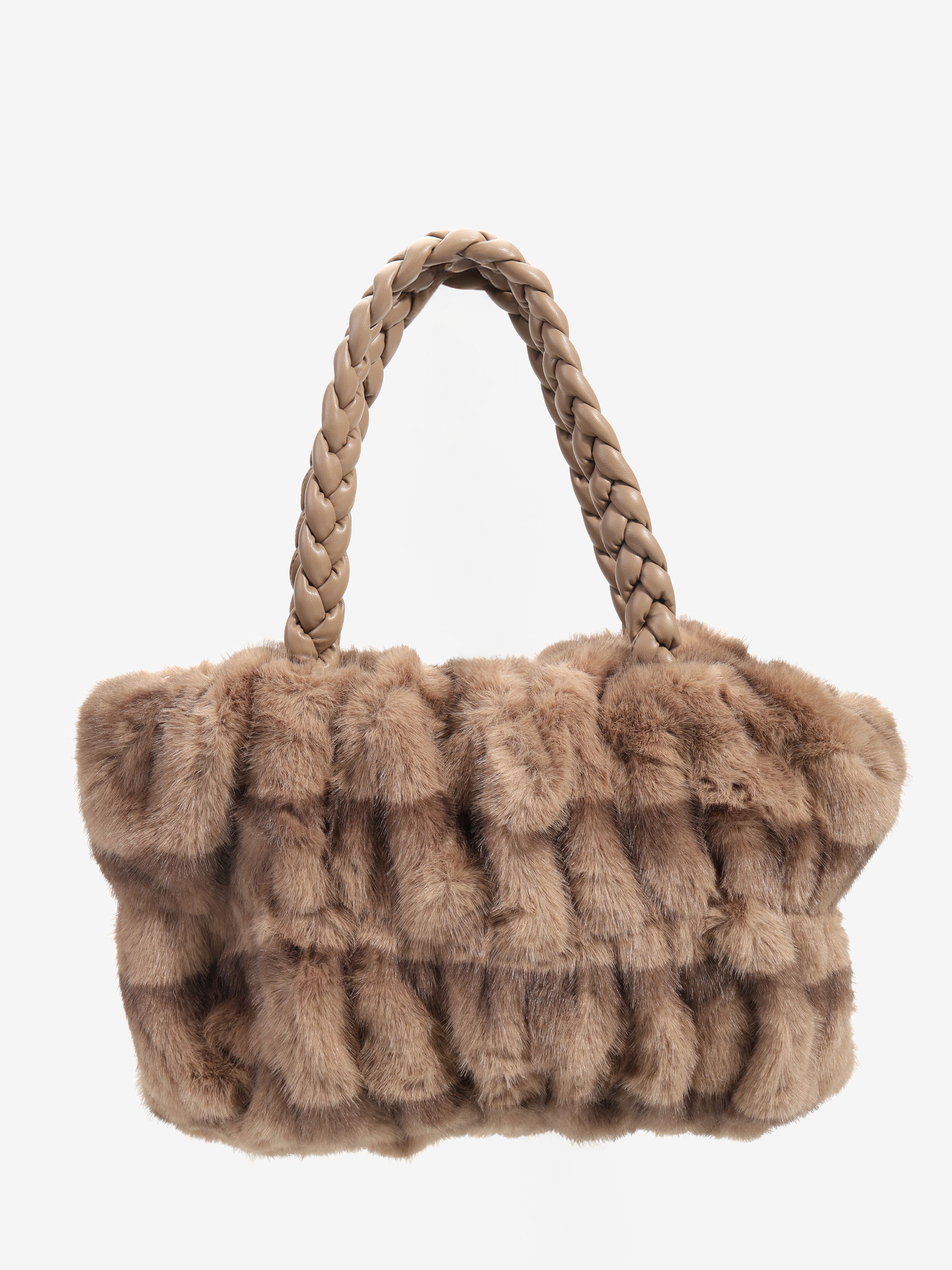 Torebka z plecionymi uchwytami wykonana z beżowego, sztucznego futra. Dodatkowy, odczepiany łańcuszek do noszenia na ramieniu.