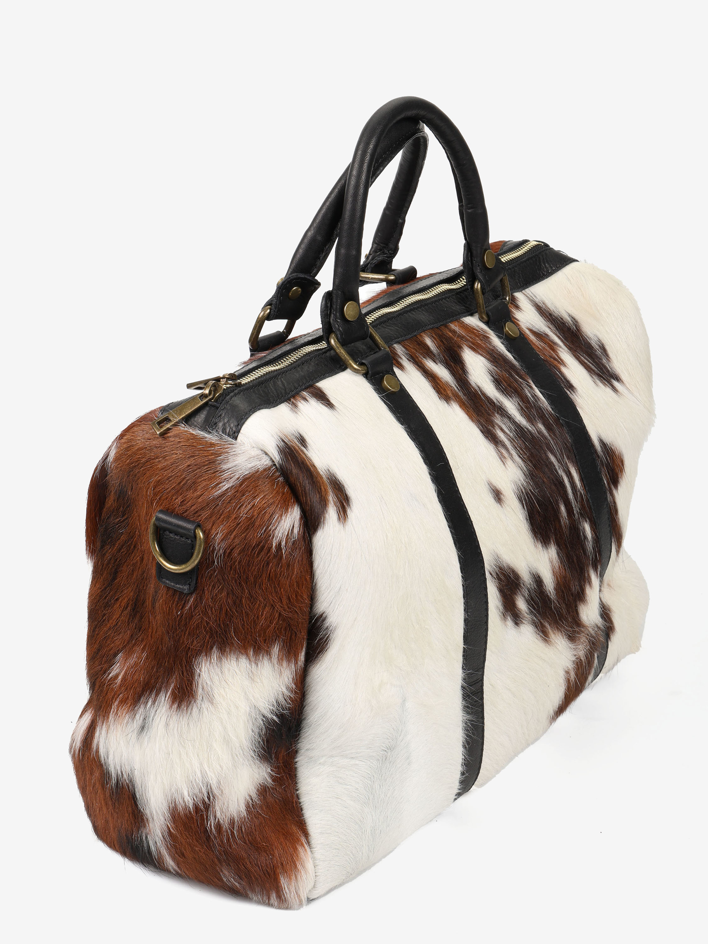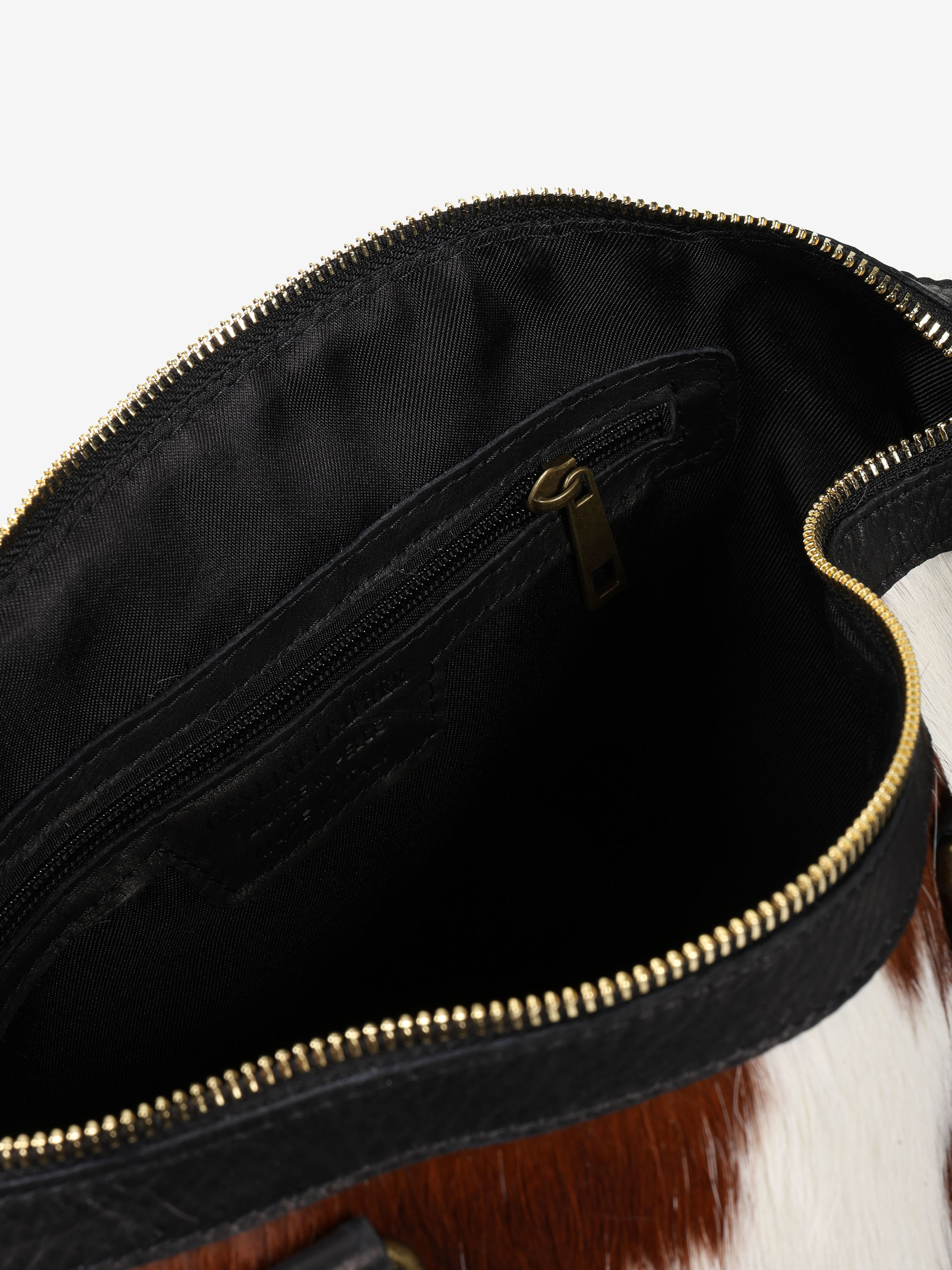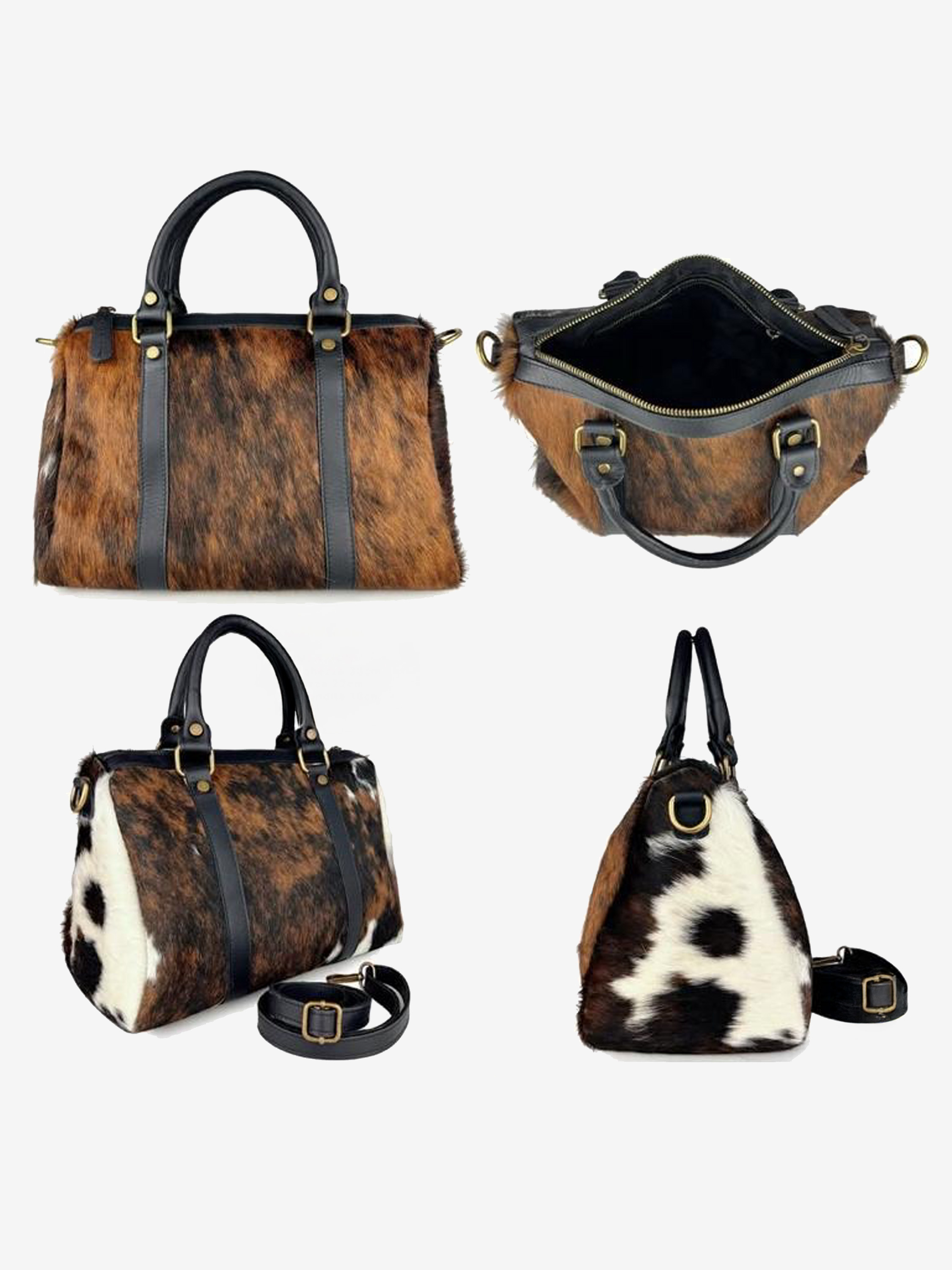 Pojemna torba typu bowling bag, wykończona naturalną skórą z włosiem we wzór COW PRINT. W środku dwie kieszonki. Dodatkowy regulowany pasek na ramię.