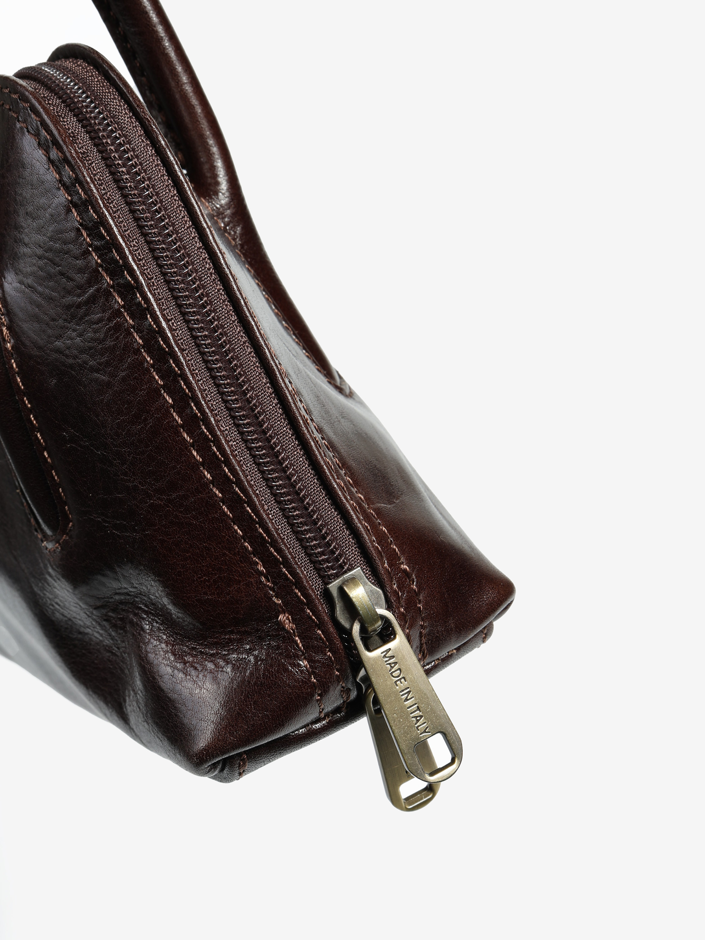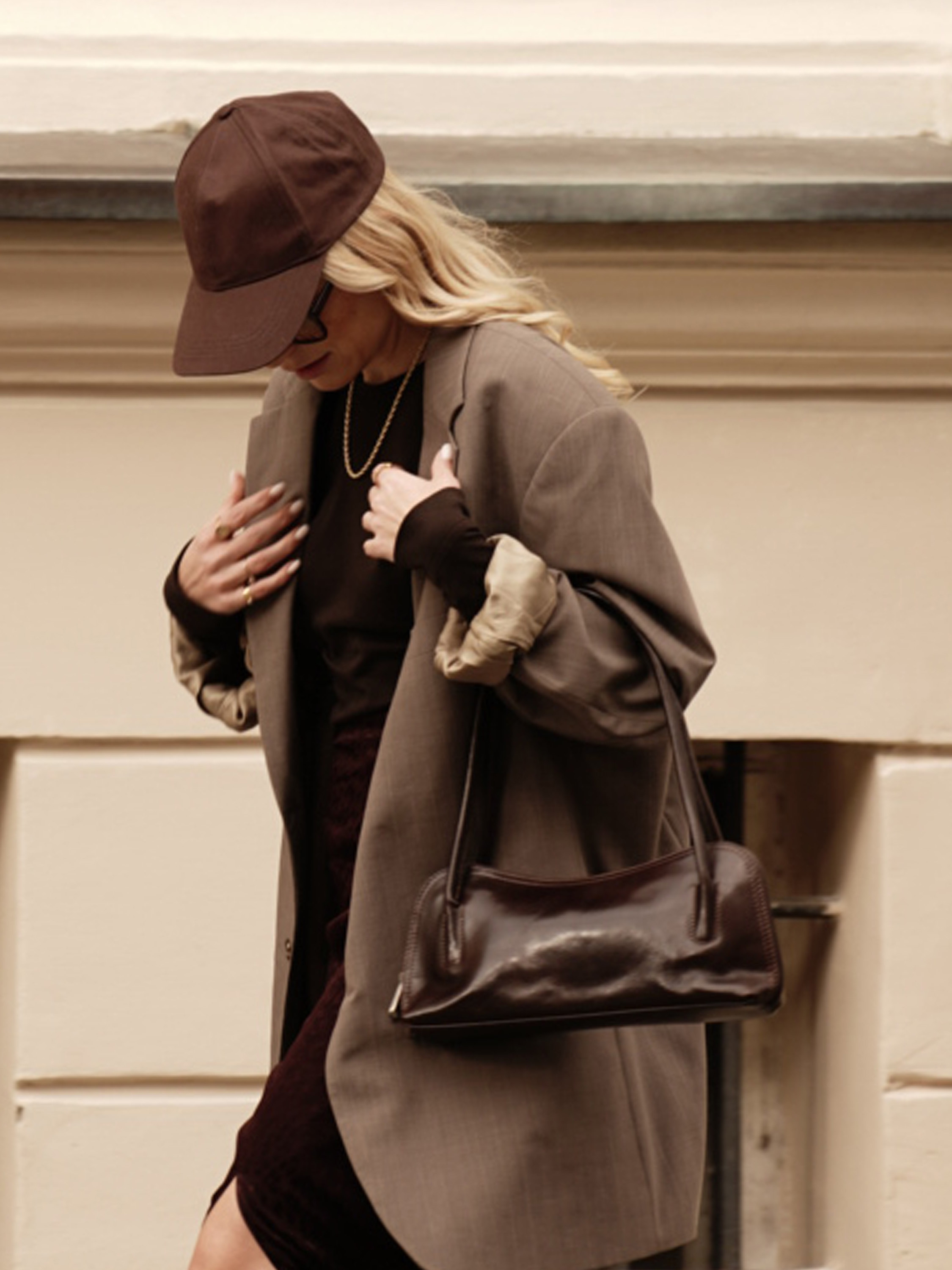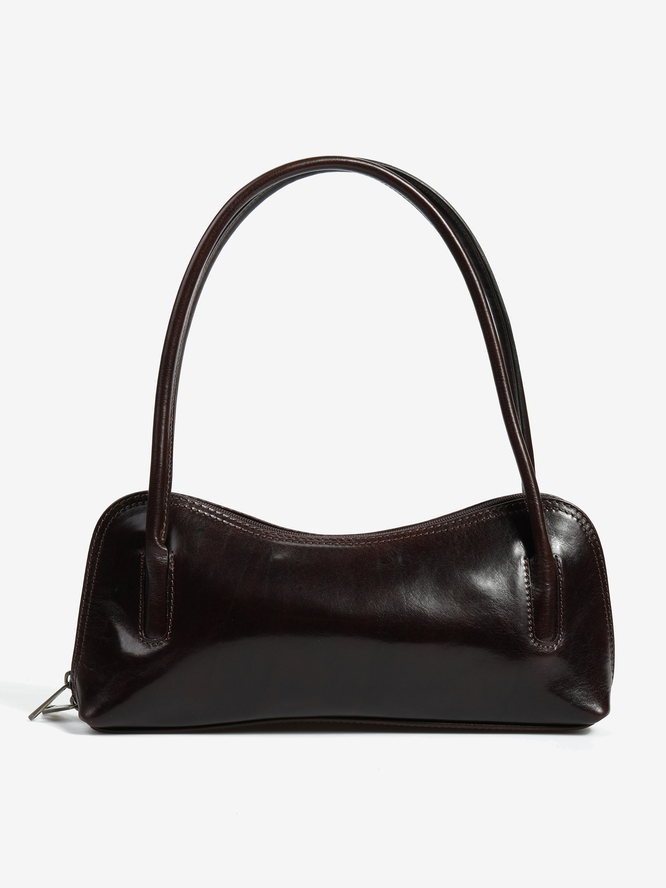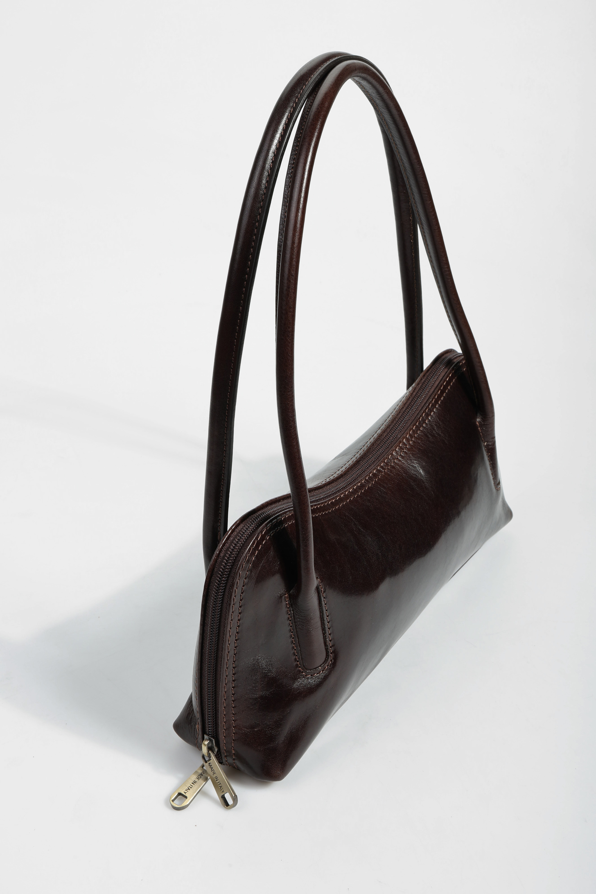 Torebka-jamnik wykonana z połyskującej skóry naturalnej. Wewnątrz wyściółka z tkaniny i dwie kieszonki.