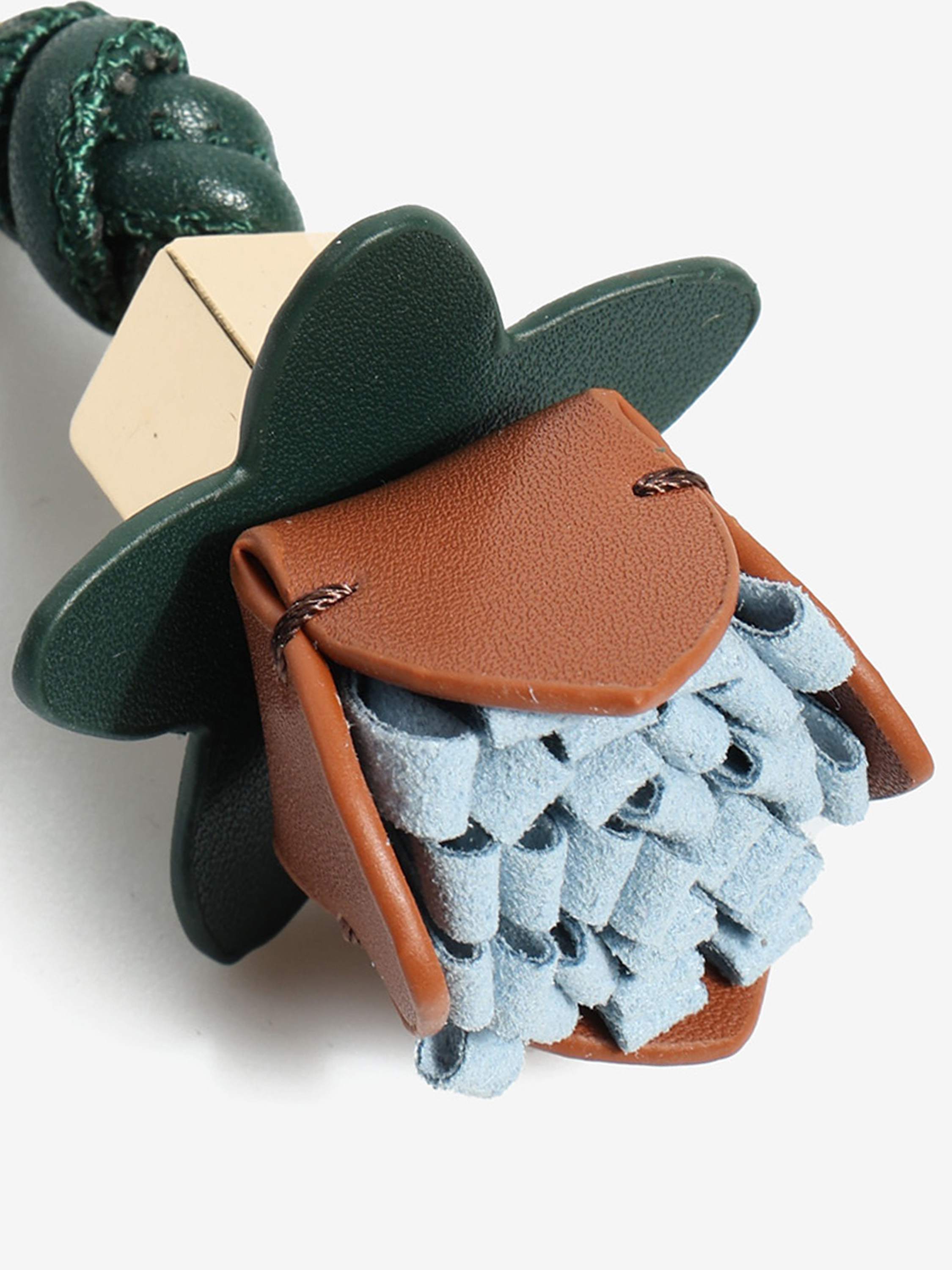 Stylowa przywieszka w formie breloka wykonana ze skóry i tkaniny w kształcie kwiata.To idealny dodatek dla osób ceniących sobie detale i oryginalne akcenty w codziennych stylizacjach.Sprawdzi się jako ozdoba do butów, kluczy, zamka w torebce, plecaka czy nawet telefonu. Niewielki detal, który wyróżni Cię z tłumu!